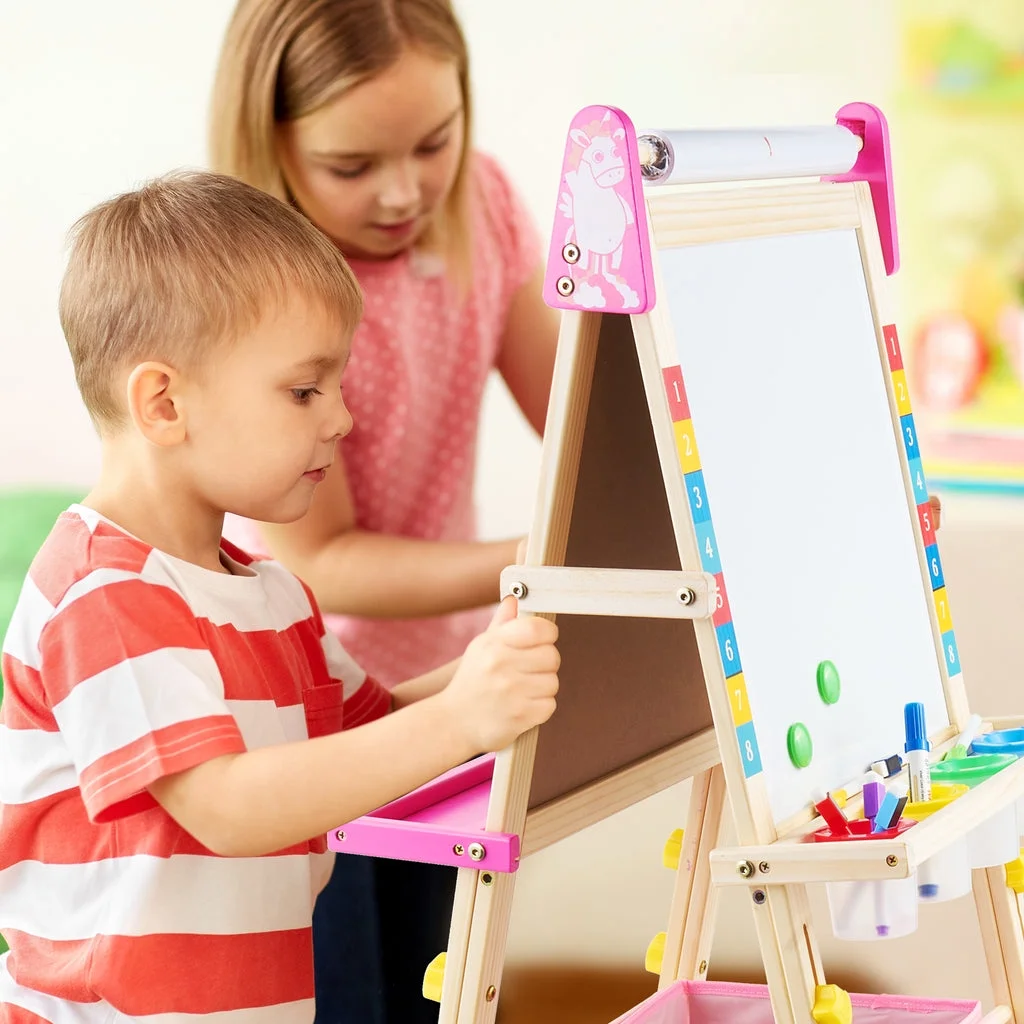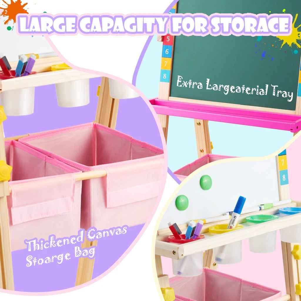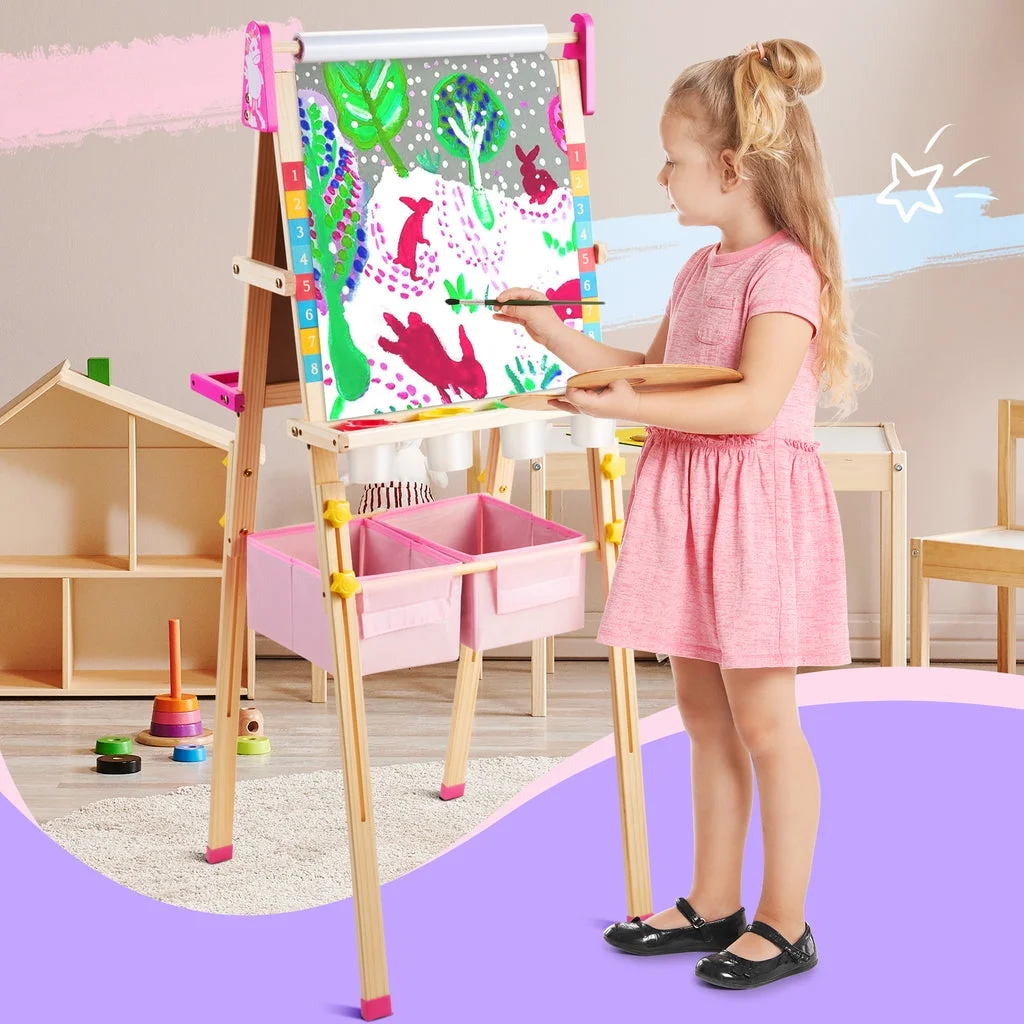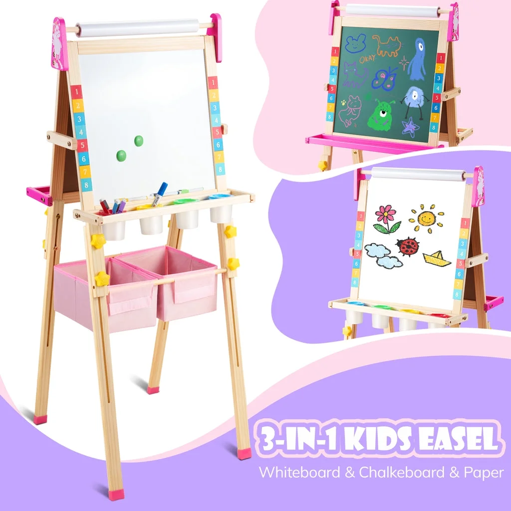 ????【Unicorn ????-in-???? Art Easel】 The Keenstone kids painting easel set features a magnetic chalkboard easel for kids on one side, a kid’s magnetic white board on the other side, & a refillable paper roll for painting & drawing.The high-end 3-in-1 kid’s easel is made of natural pine wood. With an 17-inch paper roll attached at the top. ????【MAGNETIC EASEL】 Both sides of the easel are magnetic, adding yet another fun way to play! The tray beneath the drawing board is specially designed for convenient storage & rigidity. ????【CHILD-FRIENDLY DESIGN】 Child’s easel features a sturdy wooden frame, is easy to assemble. It is more stable with non-slip foot rubber cover and triangular vertical easel design. The edges of the easel were all polished and the inverted corners were also rounded to avoid abrasion and bumps, caring with the growth of children. ????【ADJUSTABLE HEIGHT 】 The legs are easily height adjustable, from 32″ to 52″, making it the perfect standing easel for children of all ages, from a toddler easel to a 13-year-olds easel. ✏️【Versatile and Multi-Purpose】 This children’s art easel can be used for various activities like drawing, painting, and practicing handwriting, making it a perfect tool for creative play and educational development. It’s also a magnetic drawing board for kids, which provides endless fun and educational opportunities. Whether in the classroom or at home, our easel is perfect for a range of activities that your child will love! ????【BEST CHOICE EASEL SET】 The chalkboard easel suitable for homeschooling, school enlightenment, training class, parent-child activity. A perfect art toys gift for Birthday, Christmas, Children’s day gift. ????【ACCESSORIES BUNDLE】 This kids art easel includes a huge ????????????+ pcs: Apron, Paints & Pots, Brushes, Chalk, Markers, Eraser & Cloth, Ruler, Paper Roll, & Magnetic Nos., Letters & Animals.
