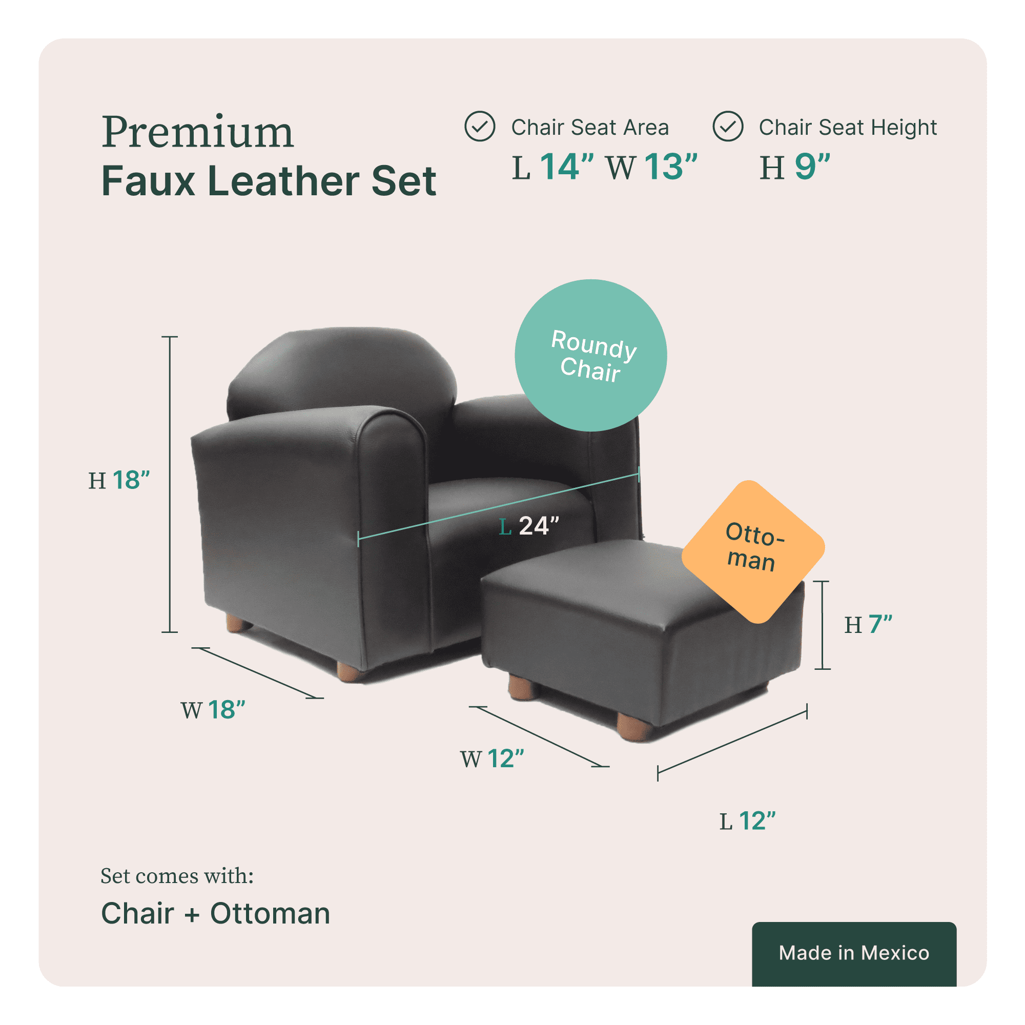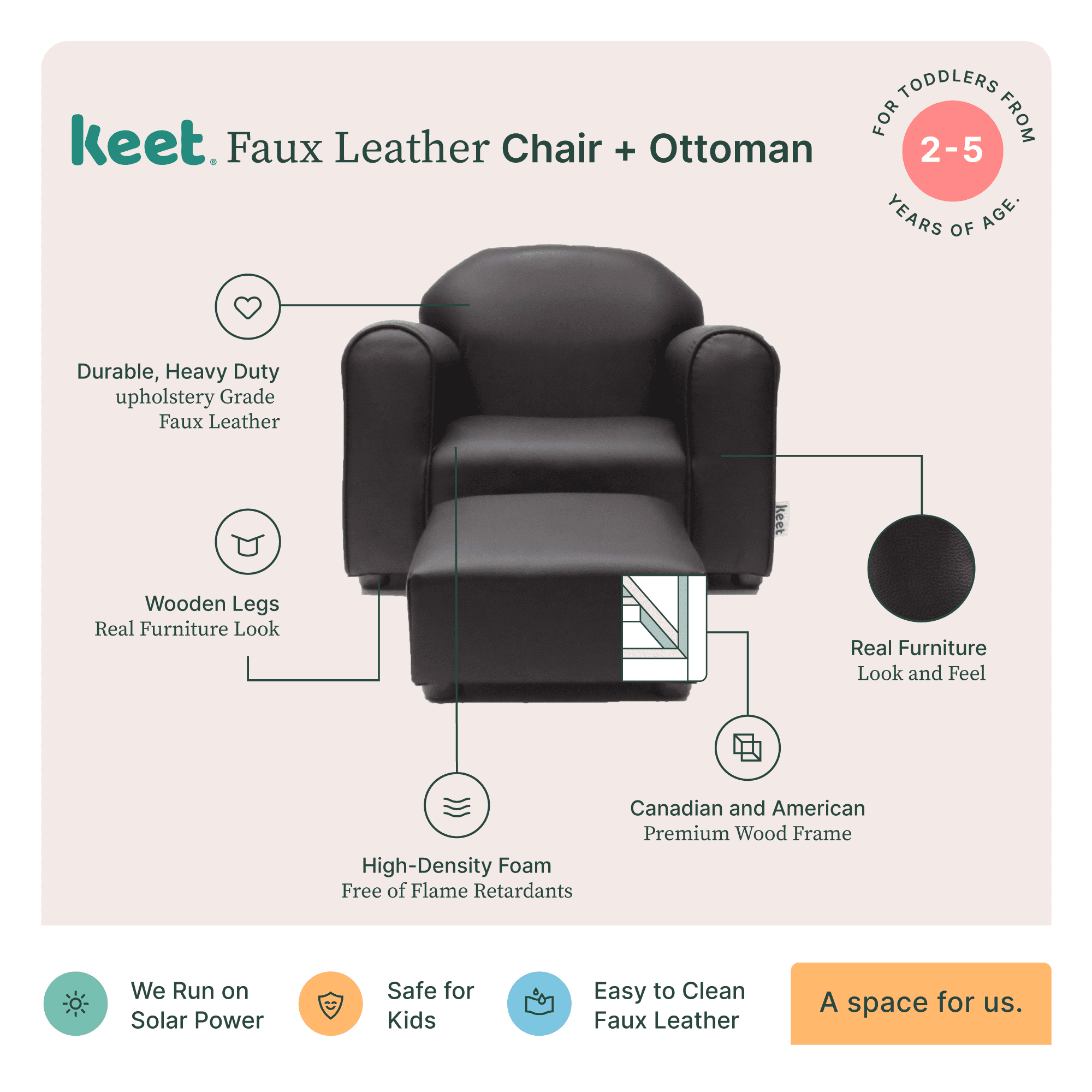 TESTED CHILDREN SAFE AND PREMIUM QUALITY. The chair has no sharp corners or hard edges to ensure the safety of the child. Padded with high-density foam, free of flame retardants. Chair’s wooden frame is sturdy and durable. Made with Canadian and American wood. REAL FURNITURE LOOK AND OTTOMAN INCLUDED. Wooden legs and faux leather for a real and elegant furniture look, like no other. Recommended for children 2-5 years old. HEAVY DUTY AND EASY-TO-CLEAN FAUX LEATHER. Stain-resistant, heavy duty faux leather that is also easy to clean. Just wipe with a lightly soaked cloth!