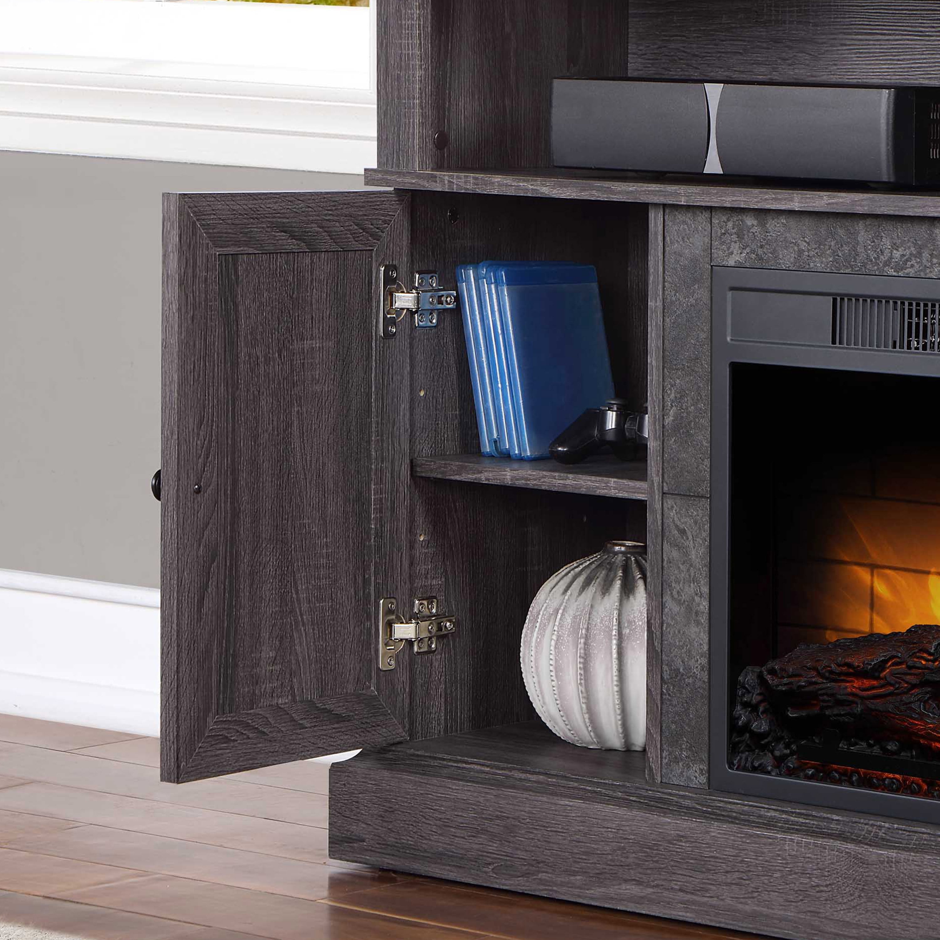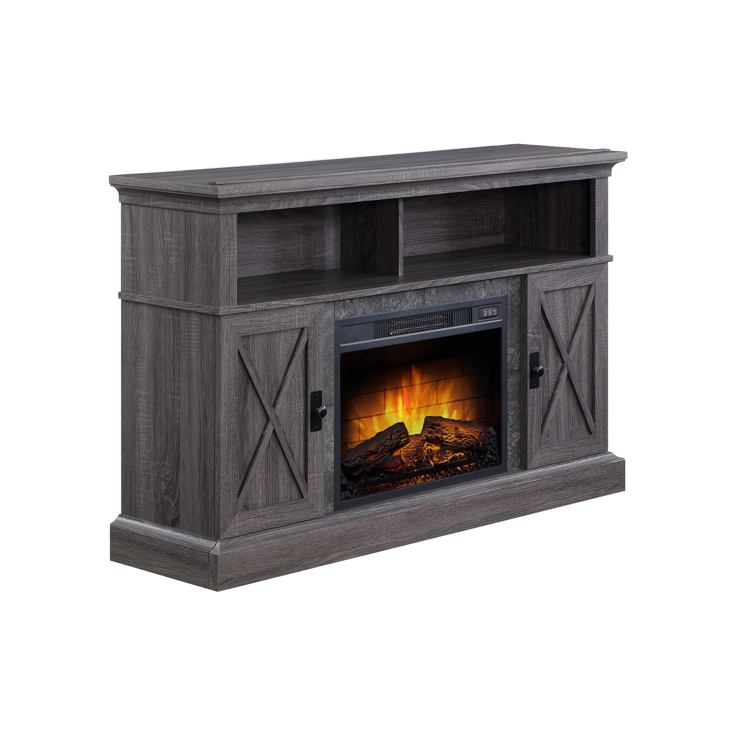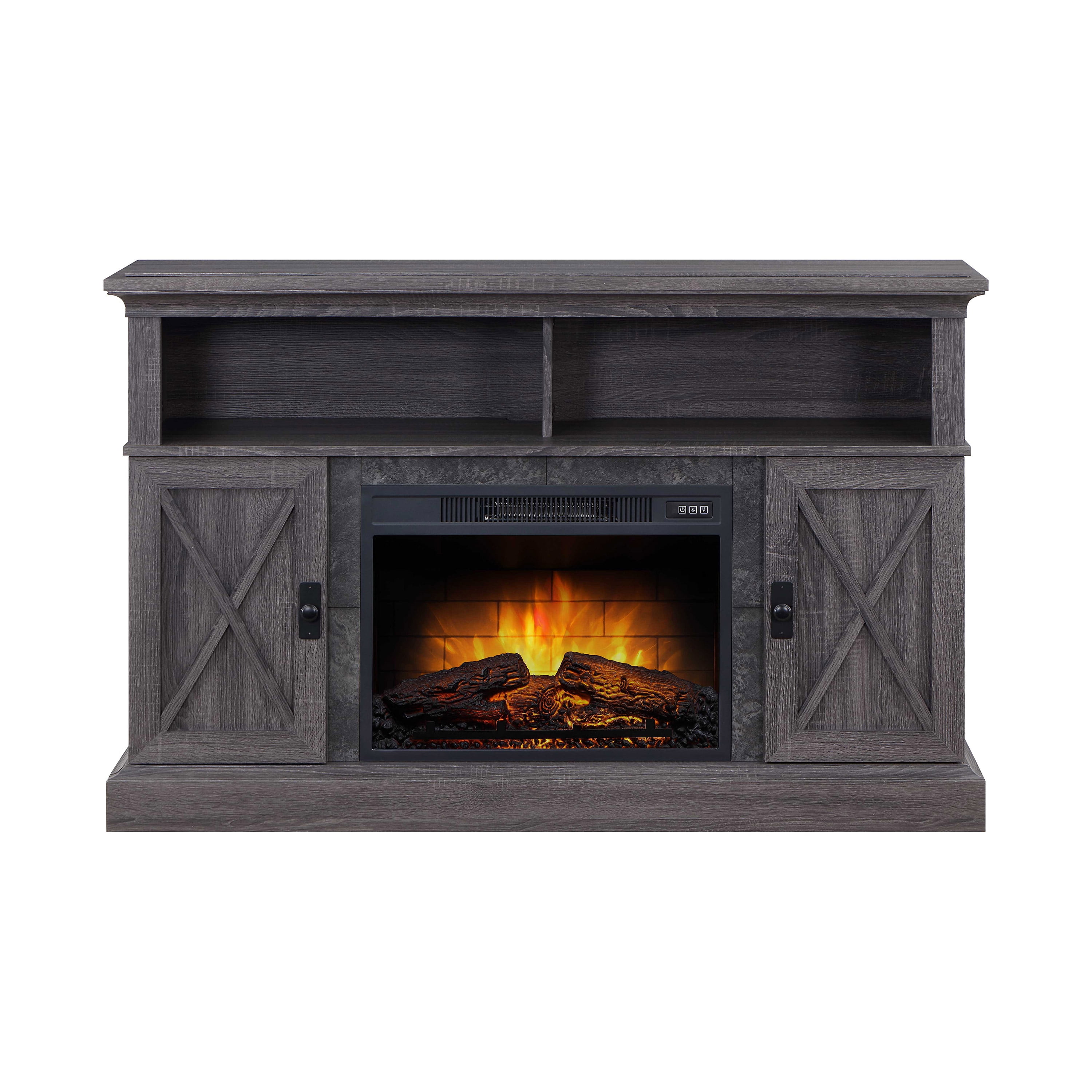 There’s nothing like a cozy fireplace to sit by! The Kellum Fireplace TV Stand will give you the warmth and ambience of a fireplace without the hassle or mess. The 23” insert heats up to 400 square feet and has independent flame and ember effect settings. The fireplace is also equipped with a unique Quantum Flame Technology that creates a 3D flame effect giving your fireplace even more of a real flame feel. The Kellum console also provides you with plenty of storage options with two spacious side cabinets that include adjustable shelves and 2 large upper shelves for housing audio/video components or displaying family mementos. The back of the shelf has a convenient cable cutaway to help keep your cords and cables out of site. The cabinet doors feature an “X” design that helps give the console a rustic farmhouse look. With two available finishes for you to choose from you can pick the color that works best with your home decor style. The faux granite surround and gunmetal hardware are the extra little touches that give this console it’s character. Enhance your living room or family room space with the Kellum Media Fireplace Console.