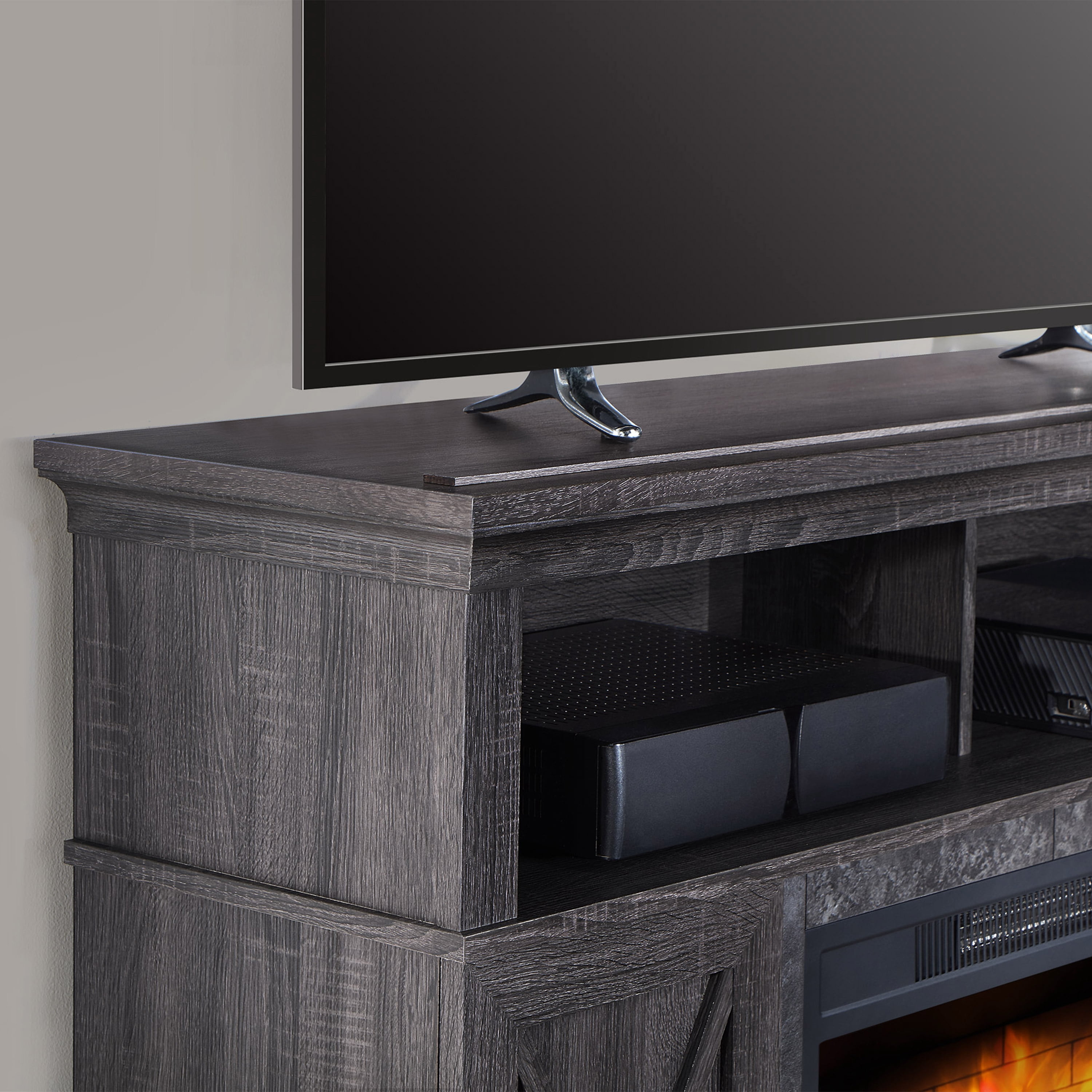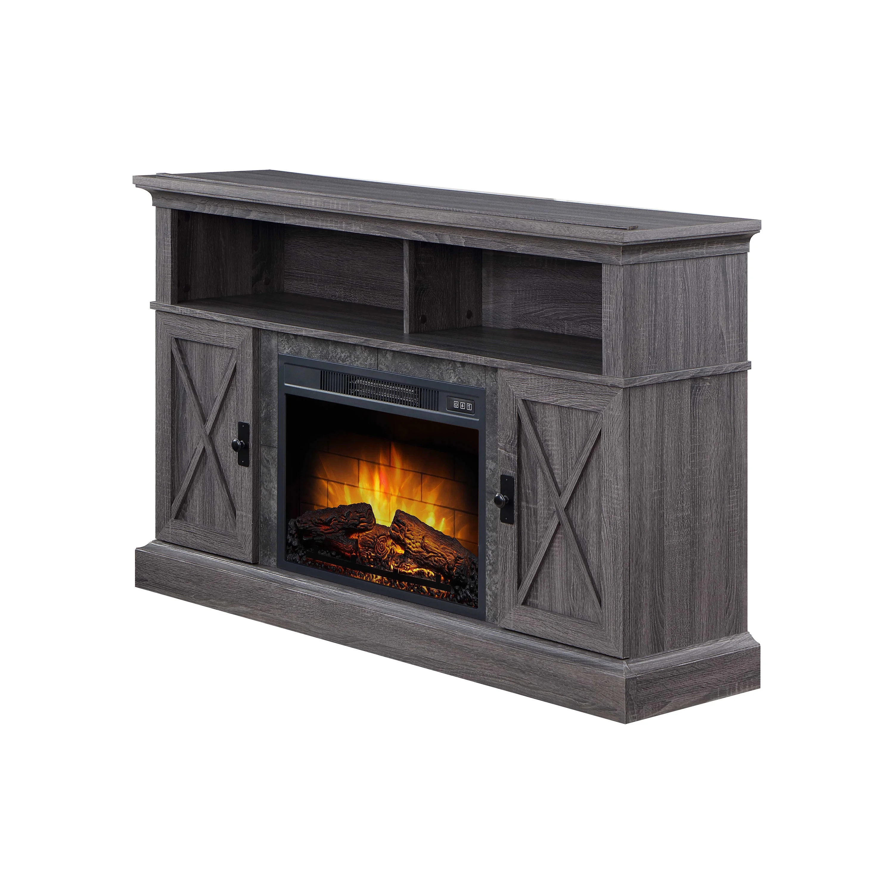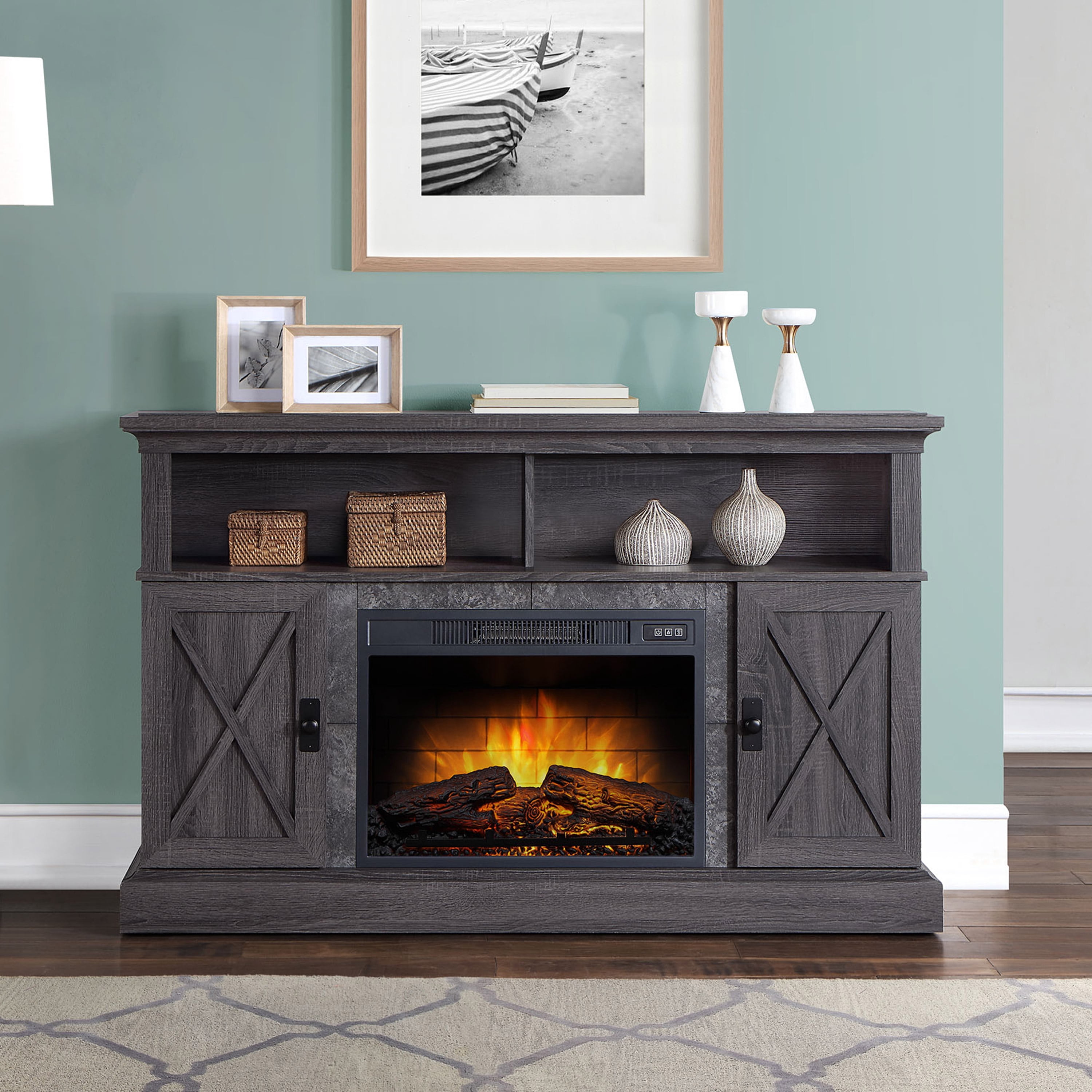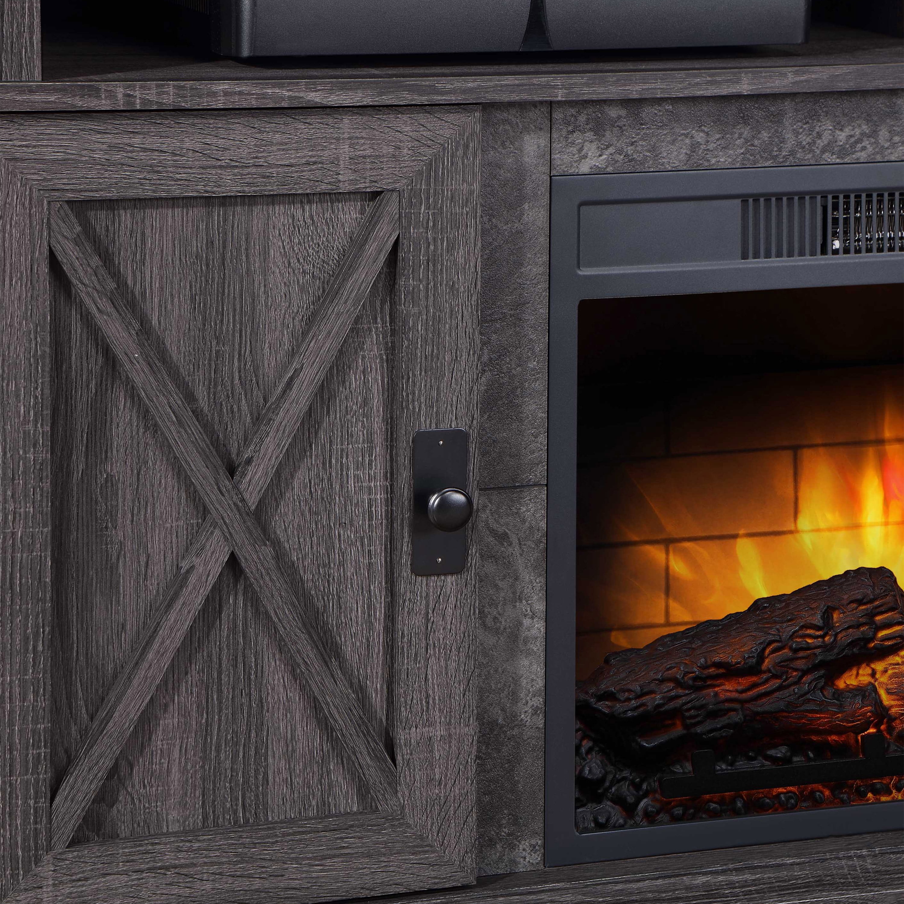 There’s nothing like a cozy fireplace to sit by! The Kellum Fireplace TV Stand will give you the warmth and ambience of a fireplace without the hassle or mess. The 23” insert heats up to 400 square feet and has independent flame and ember effect settings. The fireplace is also equipped with a unique Quantum Flame Technology that creates a 3D flame effect giving your fireplace even more of a real flame feel. The Kellum console also provides you with plenty of storage options with two spacious side cabinets that include adjustable shelves and 2 large upper shelves for housing audio/video components or displaying family mementos. The back of the shelf has a convenient cable cutaway to help keep your cords and cables out of site. The cabinet doors feature an “X” design that helps give the console a rustic farmhouse look. With two available finishes for you to choose from you can pick the color that works best with your home decor style. The faux granite surround and gunmetal hardware are the extra little touches that give this console it’s character. Enhance your living room or family room space with the Kellum Media Fireplace Console.