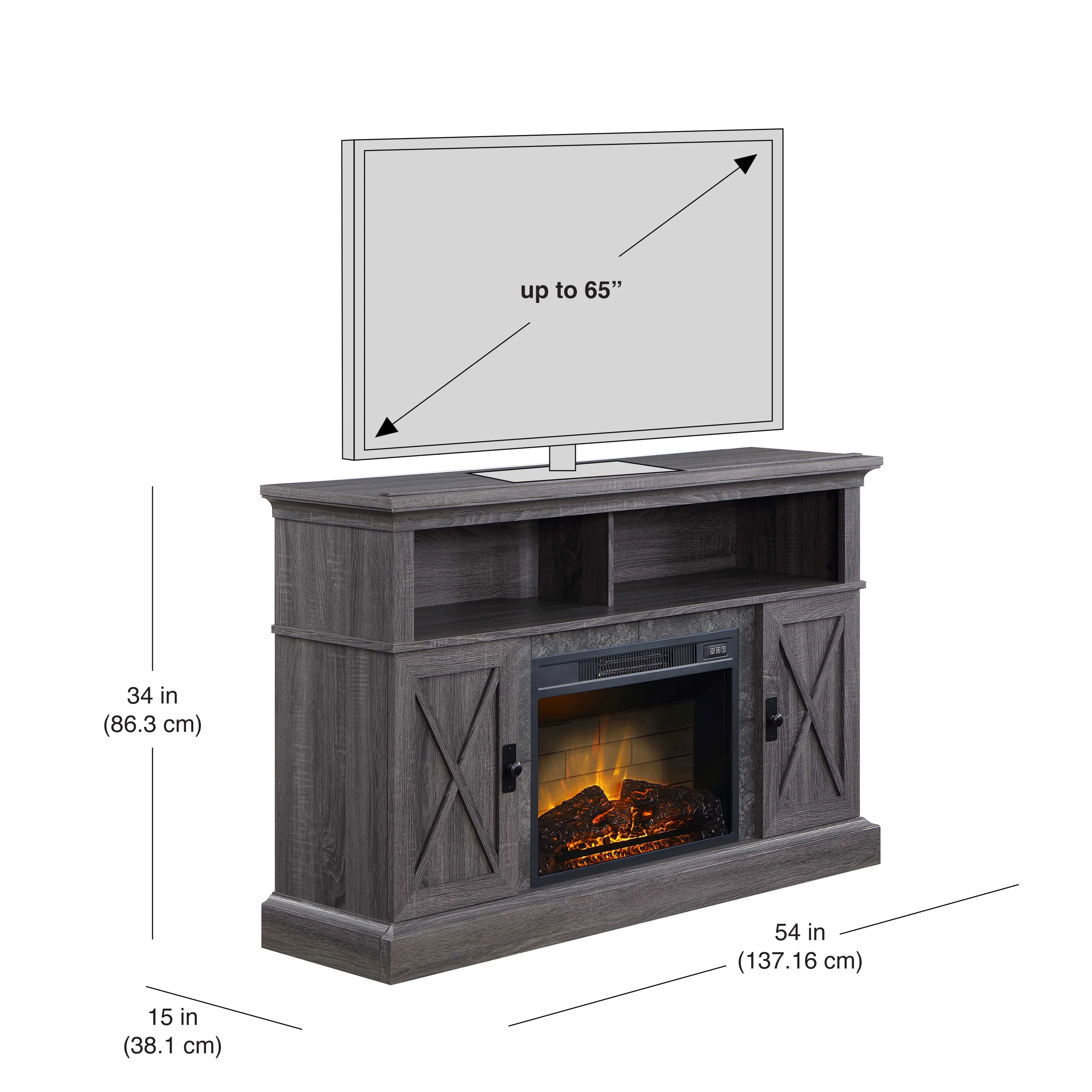 Fits most flat-panel TVs up to 65” and 80 lbs (36 kgs) Decorative faux stone fireplace surround Open compartment for audio/video components Spacious side cabinets and adjustable shelves 23″ wide insert heats up to 400 square feet QuantumFlame® Technology Easy-to-use remote control Independent flame and heat control Enjoy flame display with or without heat Plugs into a standard electrical outlet Available Finishes: Gray Product Dimensions: 54 in W x 15in D x 34in H (137.16 cm x 38.1 cm x 86.3 cm) Product Weight: 107.8 lb (49 kg) Packaging Dimensions: 58.5in x 13in x 20.5in Packaging Weight: 126.5 lb (57.5kg) Model# WMFP54EC-26GR