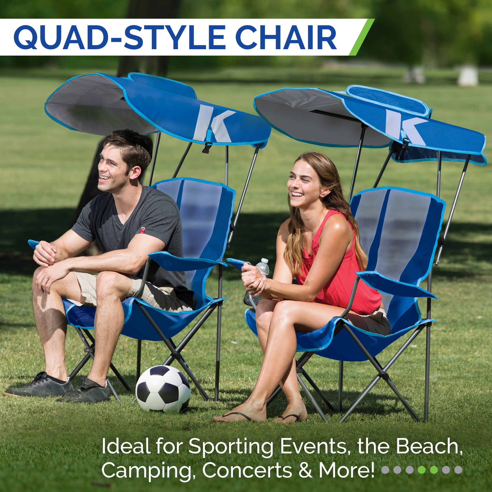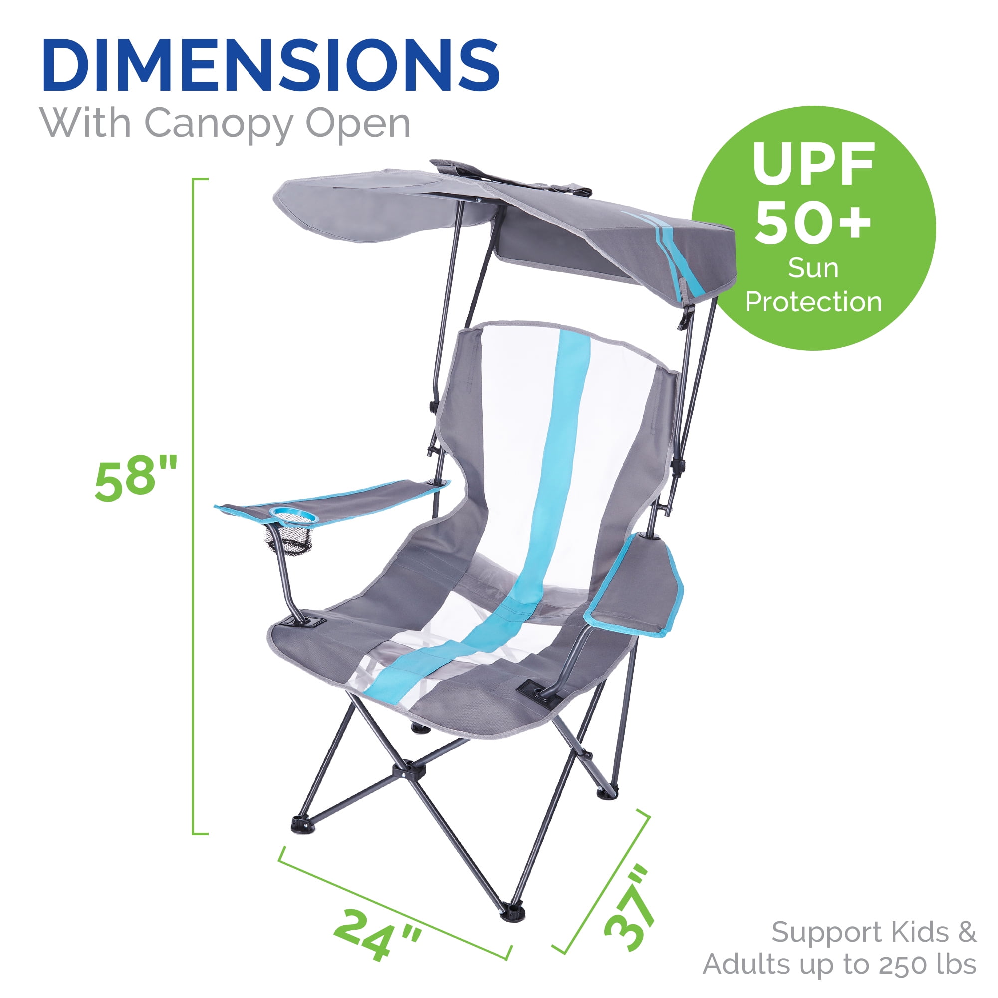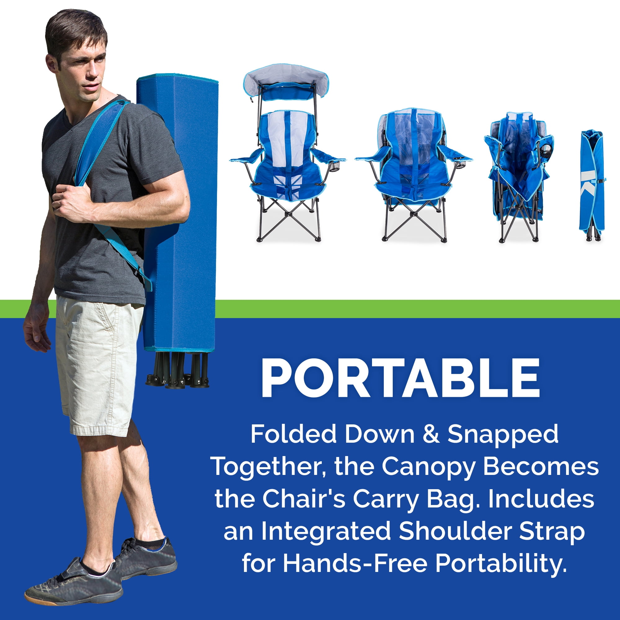 OUTDOOR CANOPY CHAIR: Converts from a quad-style camp chair into your own personal canopy-covered outdoor oasis RETRACTABLE SUN CANOPY: Protects you from the elements with 50+ UPF sun protection, and it can be lowered behind the chair while you are still seated when you want to catch some rays PORTABLE AND EASY TO CARRY: Canopy becomes the carry case when folded secured by a durable snap-lock buckle, and the attached shoulder strap provides hands-free portability – no carrying bag needed! VERSATILE USES: Perfect companion for your family camping trips, tailgating, and for watching the kids from the sidelines INCLUDES ONE LAWN CHAIR: Measures 37″L x 24″W x 58″H and can support kids and adults up to 250 lbs.