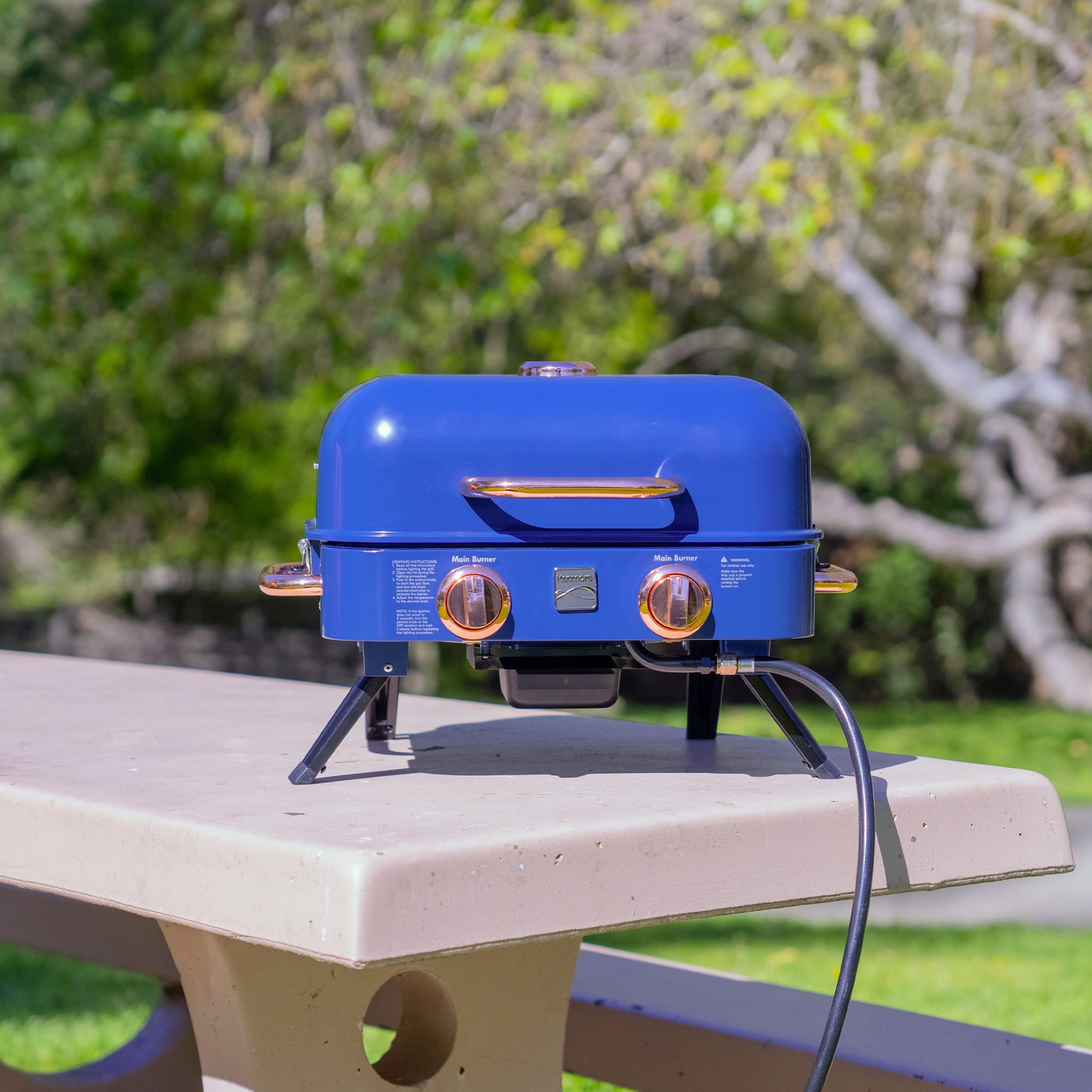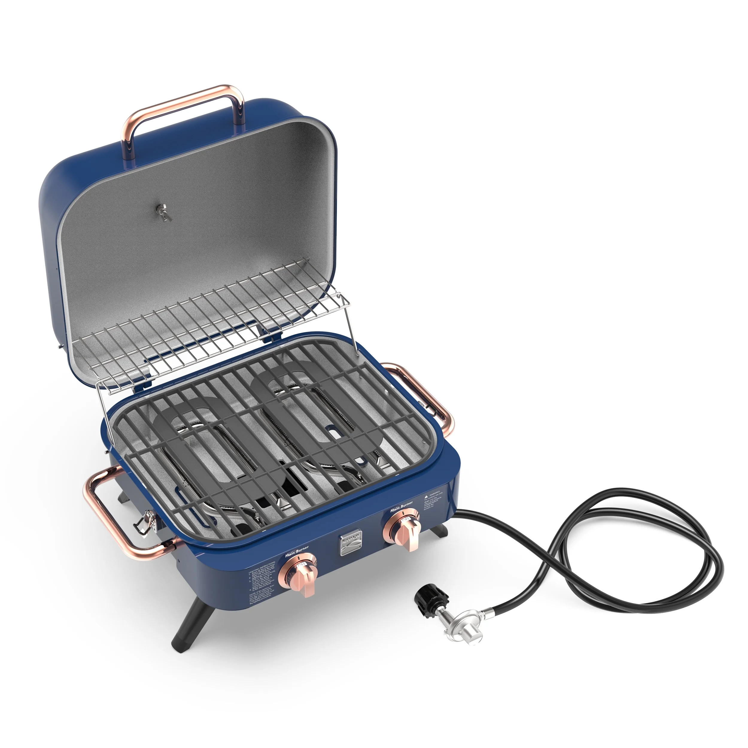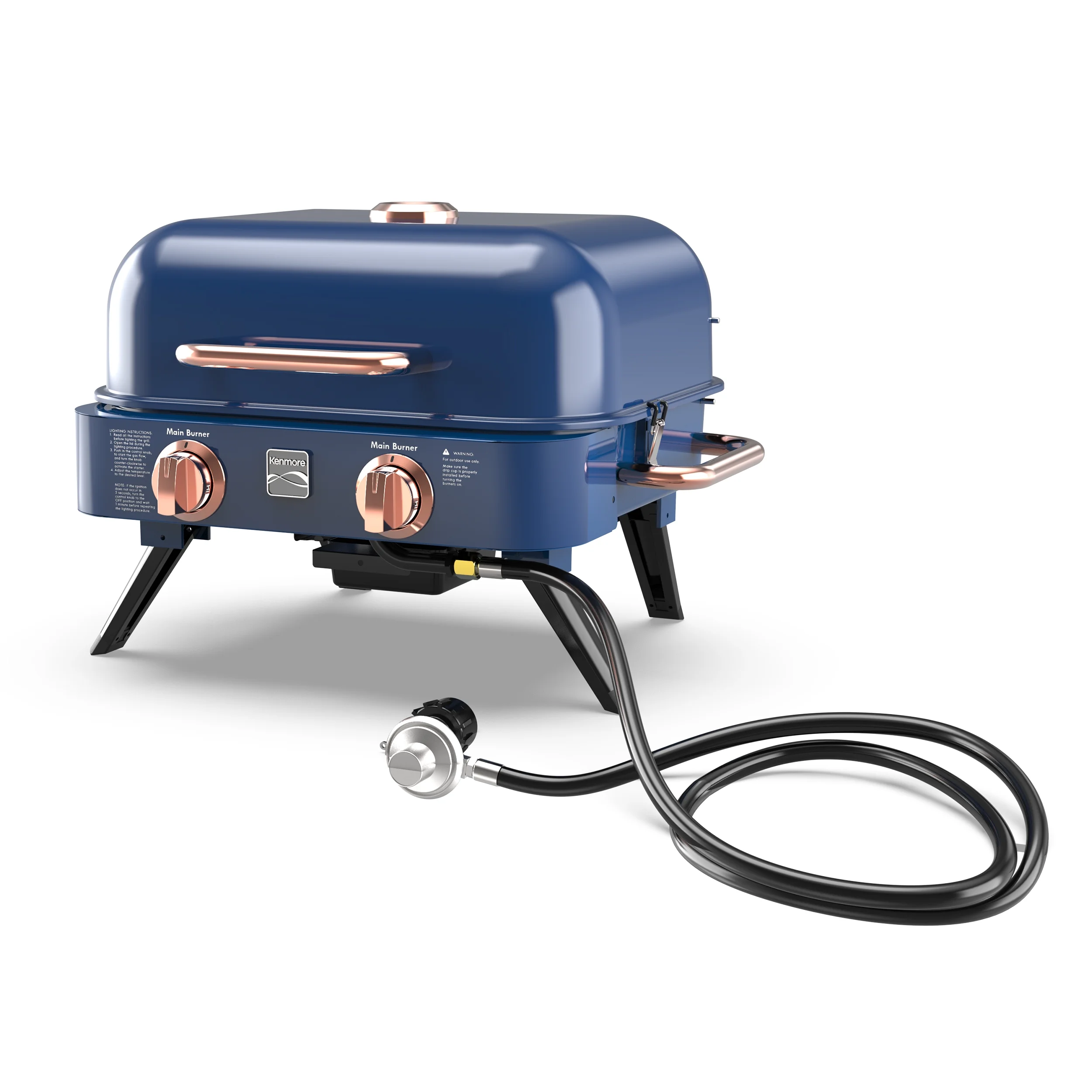 Elevate your outdoor cooking experience with the new Kenmore 2-Burner Portable Tabletop Retro Gas Grill. This two-burner small propane gas grill is designed for on-the-go grilling, boasting a generous 343 square inches of barbeque grilling surface—perfect for sizzling up to 9 burgers at once. With its sleek retro design and tabletop versatility, this small compact BBQ grill not only delivers style but also functionality. Equipped with flamethrower ignition and a warming rack, the Kenmore 2-Burner portable gas grill offers a total of 14,000 BTUs of heating power. Its compact size and side handles make it an ideal companion for camping, fishing, glamping, tailgating, outdoor adventures, parks, picnics, road trips, and BBQs on the go. Whether you’re embarking on family escapades or celebrating outdoor events, this portable outdoor gas grill ensures a memorable and flavorful experience. Experience the convenience of quick and efficient barbecue grilling wherever your journey takes you. Invest in the Kenmore 2-Burner Retro Portable Gas Grill for a perfect blend of style, portability, and impressive outdoor cooking capabilities.