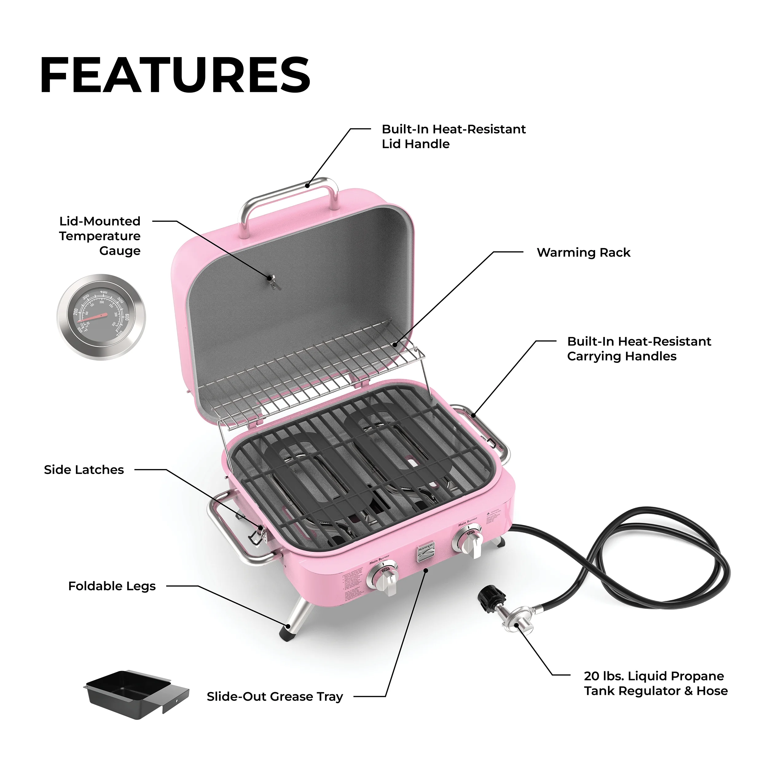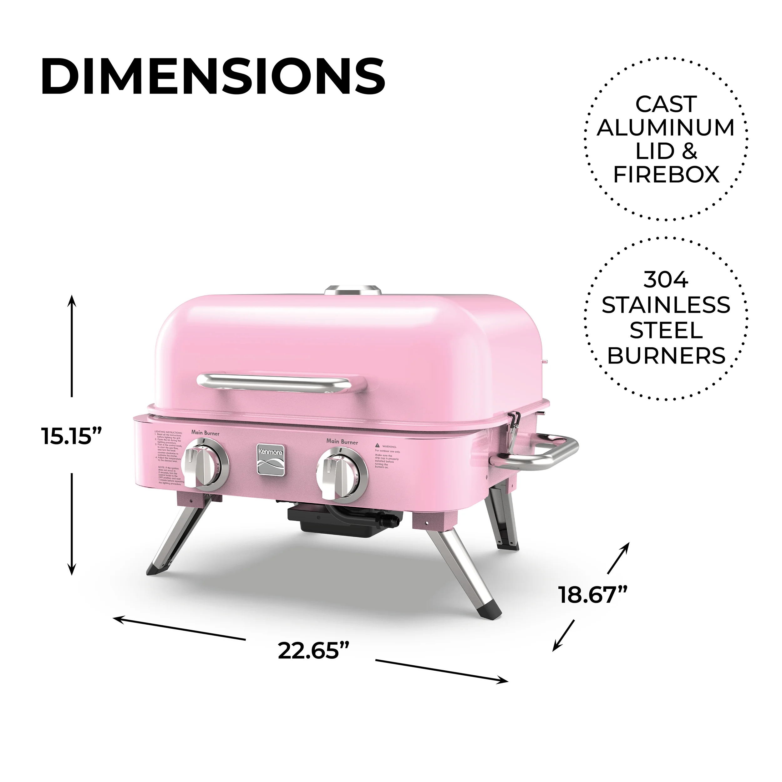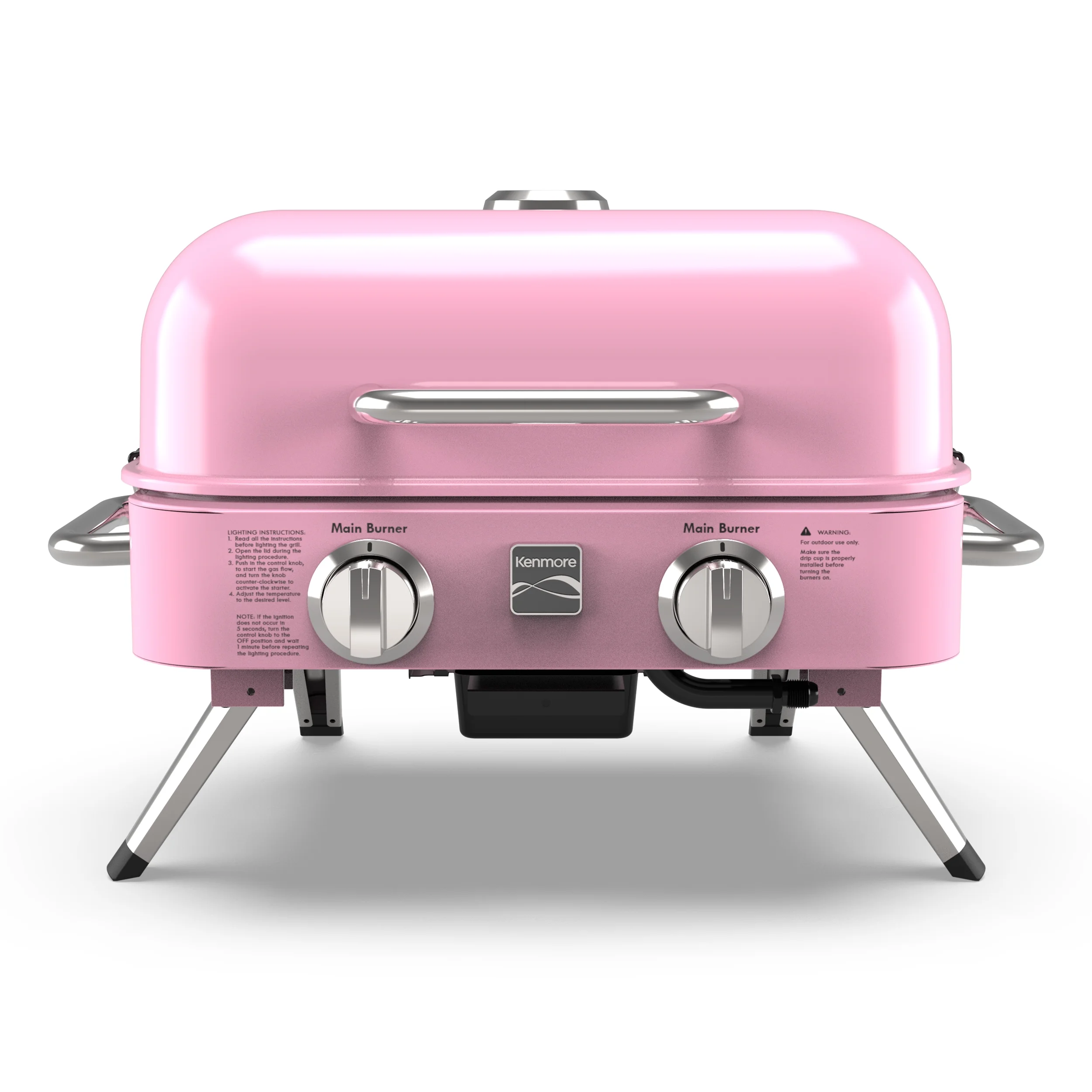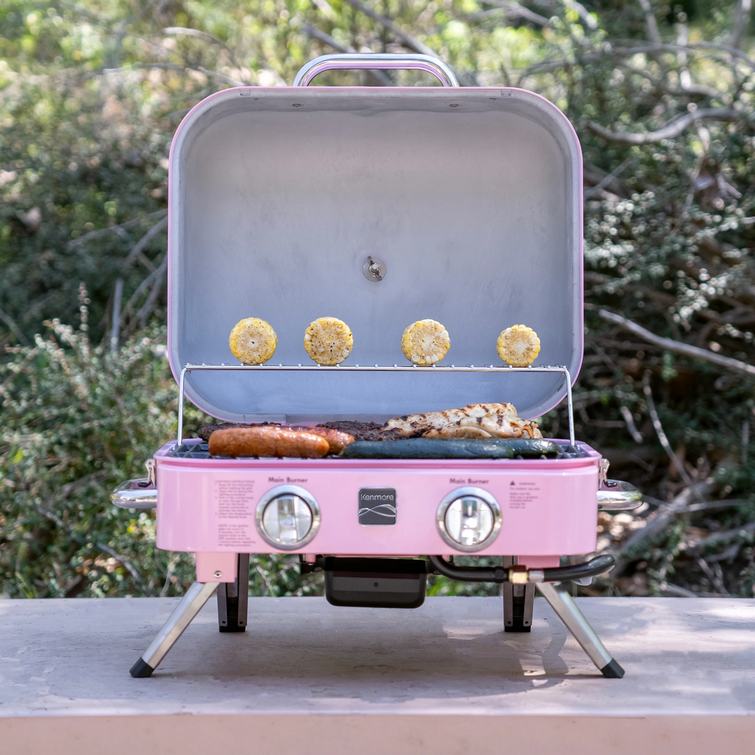 Elevate your outdoor cooking experience with the new Kenmore 2-Burner Portable Tabletop Retro Gas Grill. This two-burner small propane gas grill is designed for on-the-go grilling, boasting a generous 343 square inches of barbeque grilling surface—perfect for sizzling up to 9 burgers at once. With its sleek retro design and tabletop versatility, this small compact BBQ grill not only delivers style but also functionality. Equipped with flamethrower ignition and a warming rack, the Kenmore 2-Burner portable gas grill offers a total of 14,000 BTUs of heating power. Its compact size and side handles make it an ideal companion for camping, fishing, glamping, tailgating, outdoor adventures, parks, picnics, road trips, and BBQs on the go. Whether you’re embarking on family escapades or celebrating outdoor events, this portable outdoor gas grill ensures a memorable and flavorful experience. Experience the convenience of quick and efficient barbecue grilling wherever your journey takes you. Invest in the Kenmore 2-Burner Retro Portable Gas Grill for a perfect blend of style, portability, and impressive outdoor cooking capabilities.