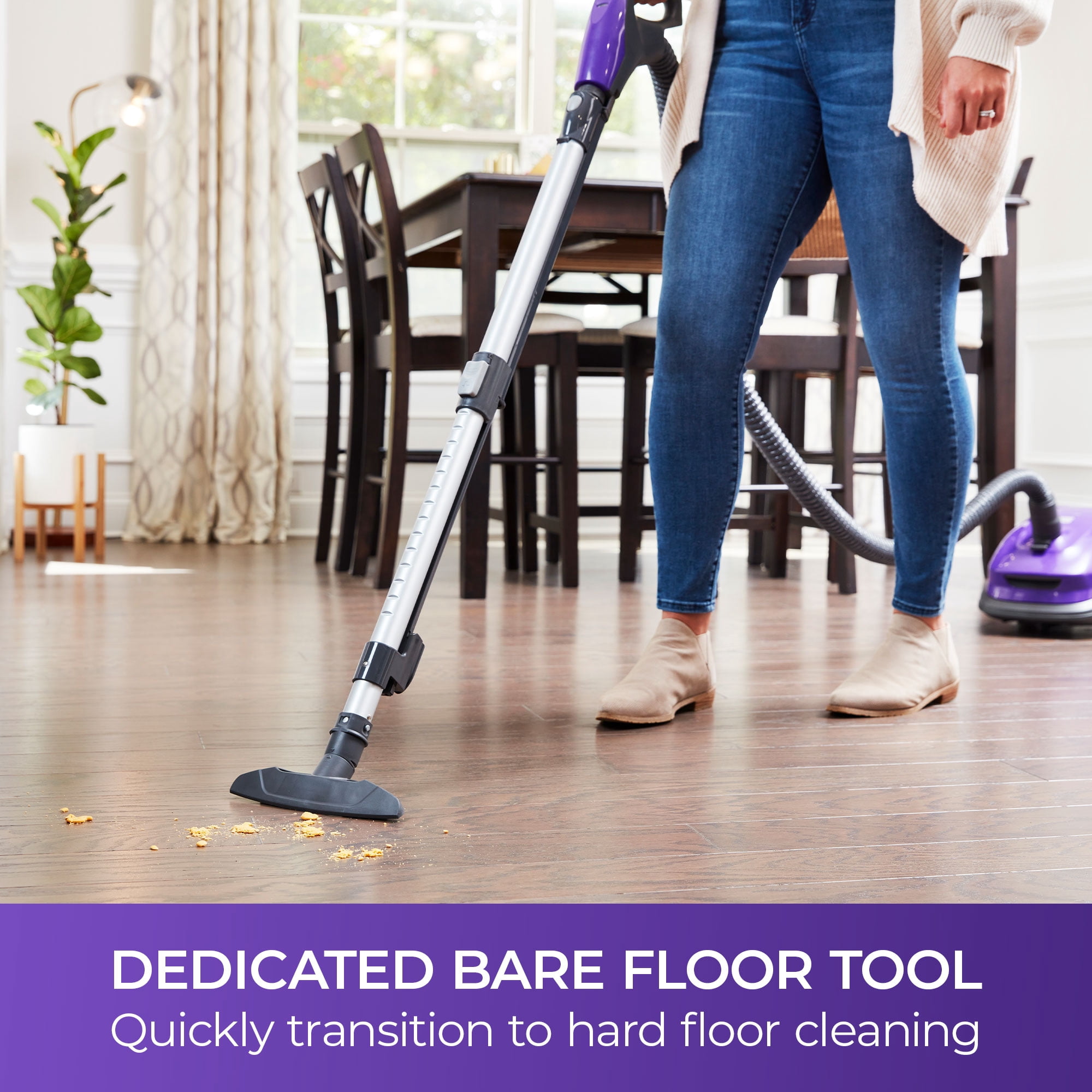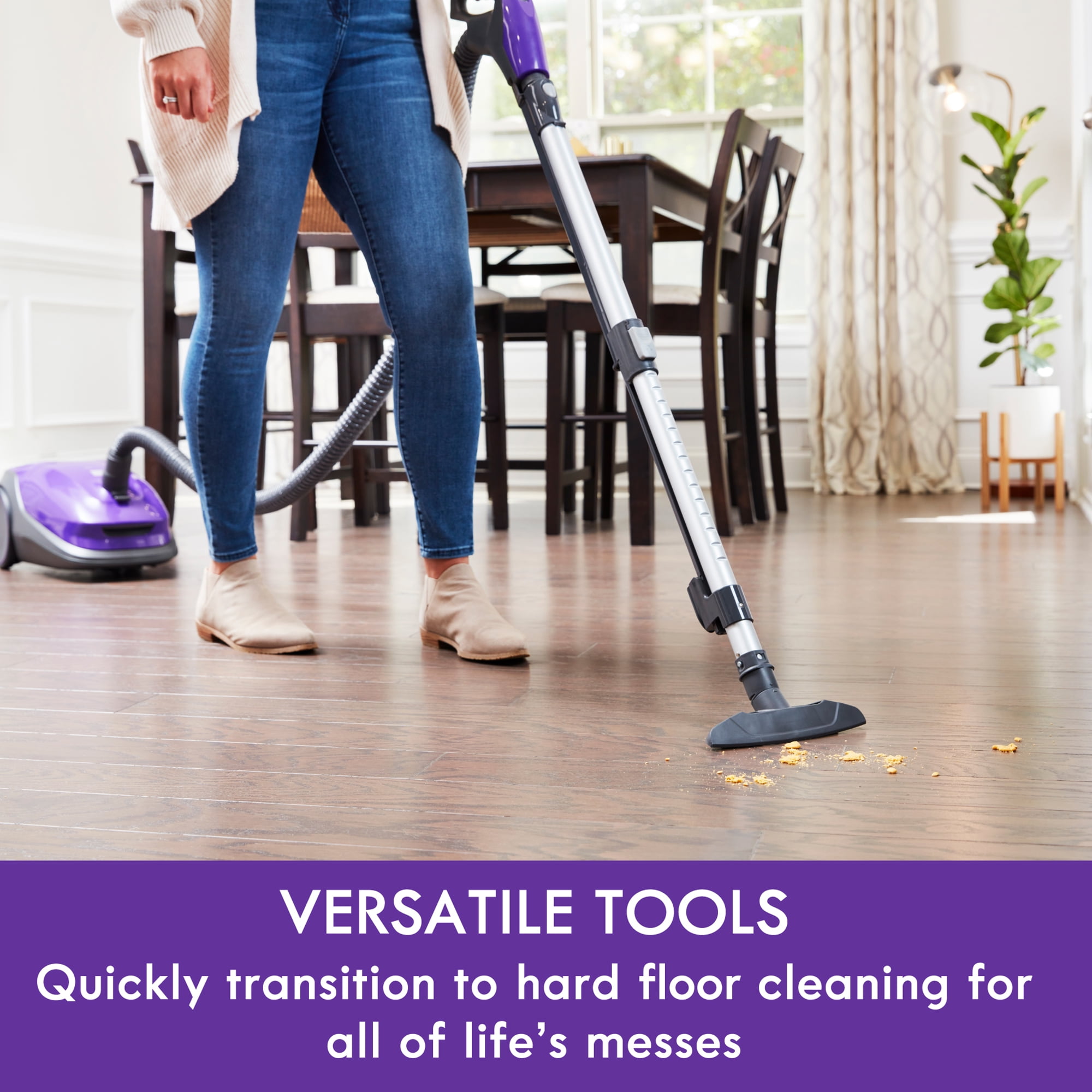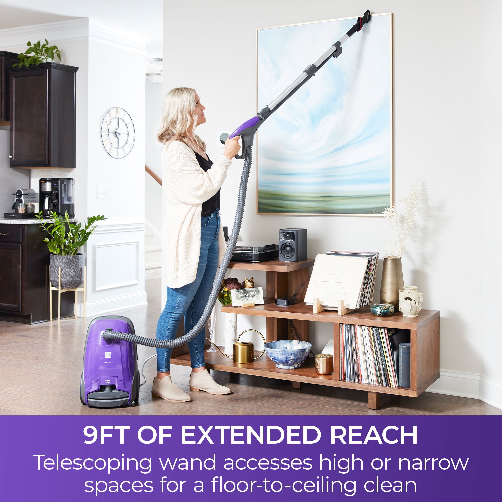 AllergenSeal System Power Where You Need It – Whole home clean with 2 dedicated floor nozzles and powerful 2-Motor system – HEPA filtration captures 99.97 percent of debris, trapping dust, pet dander, pollen and other allergens so exhaust air is clean and you can breathe easier 4 height adjustments for optimal airflow and cleaning efficiency Features 360 hose swivel with telescoping wand automatic cord rewind. Dimensions: 26 x 16.2 x 13.5 inches