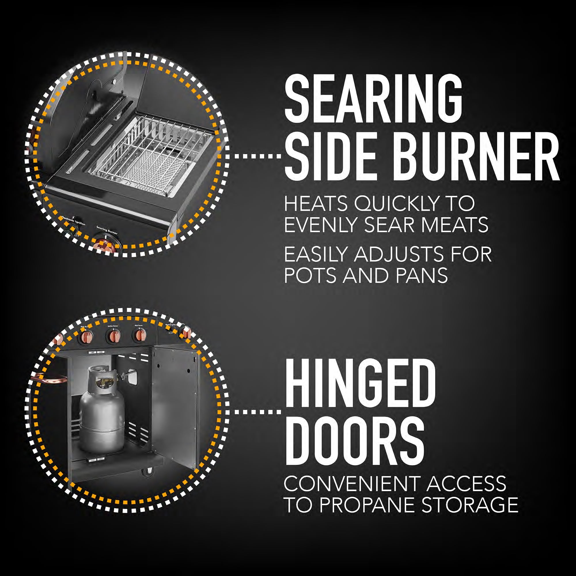 Powerful Kenmore 4-burner outdoor propane gas grill Easy 1-button electronic ignition – fire up your new gas grill with ease when compared to charcoal and pellet grills Enclosed cabinet to keep all your grilling essentials secured Cast iron cooking grates for even heat distribution and heat retention Stylish black gas grill with copper accent 593 square inches of cooking space (primary cooking surface – 425 sq in; secondary cooking area, warming rack, 168 sq in) 4 separate burners for extra versatility to try out new grill techniques or experiment with different heat zones Convertible to natural gas with separate conversion kit (Part #PP-20400-SS; not included, sold separately) and requires professional installation Searing side burner for grilling steaks, scallops, fish, and other delicious meats and seafood Protect your new Kenmore gas grill investment with a matching Kenmore grill cover (Part #PA-20281; sold separately)
