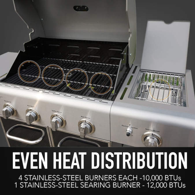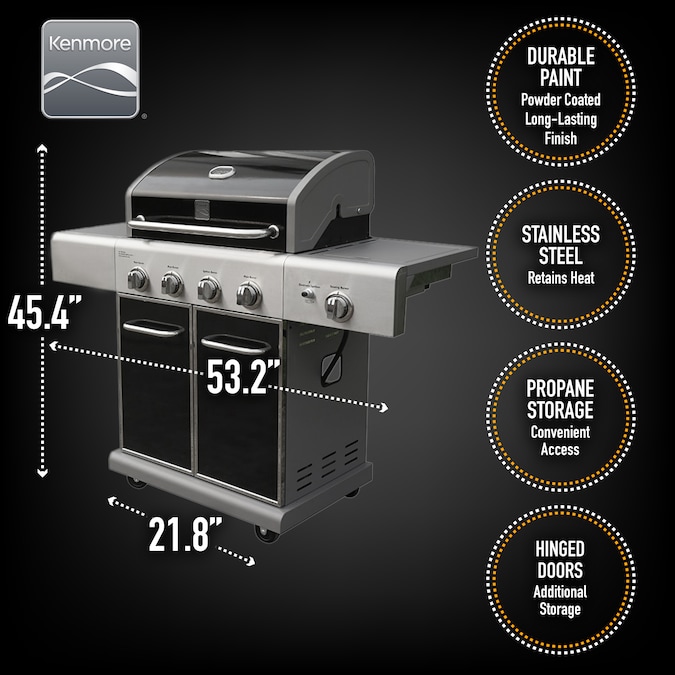 - Kenmore 4-burner BBQ grill, liquid propane gas grill with side searing burner in black and stainless steel trim, 53.2” W x 21.8” L x 45.4” H, 88.2 lbs