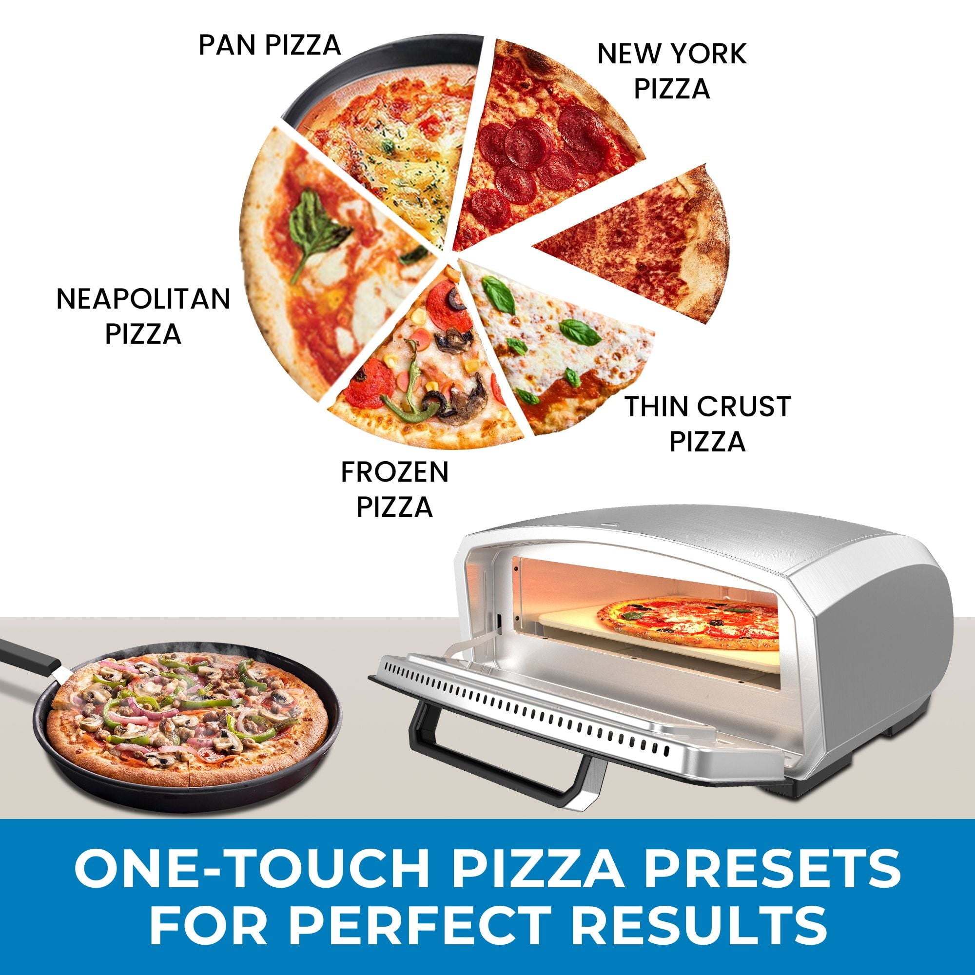 Product Features 13-inch pizza ready in 2-3 minutes Weather-resistant design rated for outdoor use Ultra-high heat up to 850°F for wood fired taste & texture 5 one-touch programs for Neapolitan, Pan/Deep-Dish, New York, Thin Crust, and Frozen Pizza stone & pizza peel included Dual element radiant heat for even cooking & crispy crust Preheats within 20 minutes Manual timer and temperature setting with simple dial controls Sleek black glass front with clear LED display Stainless steel housing Viewing window and interior light