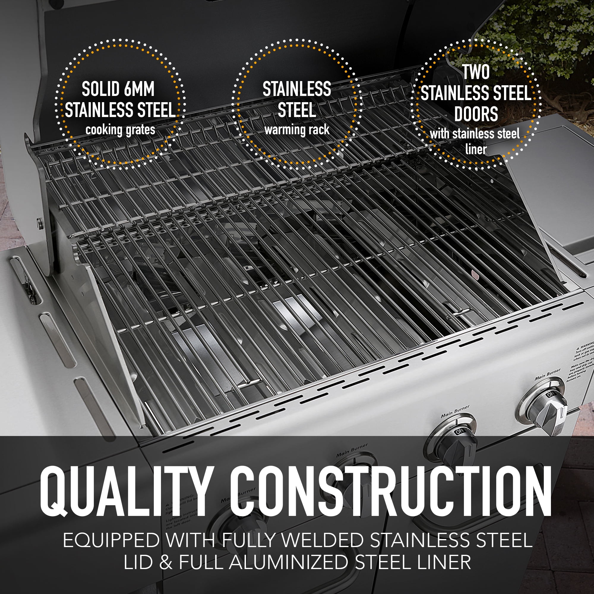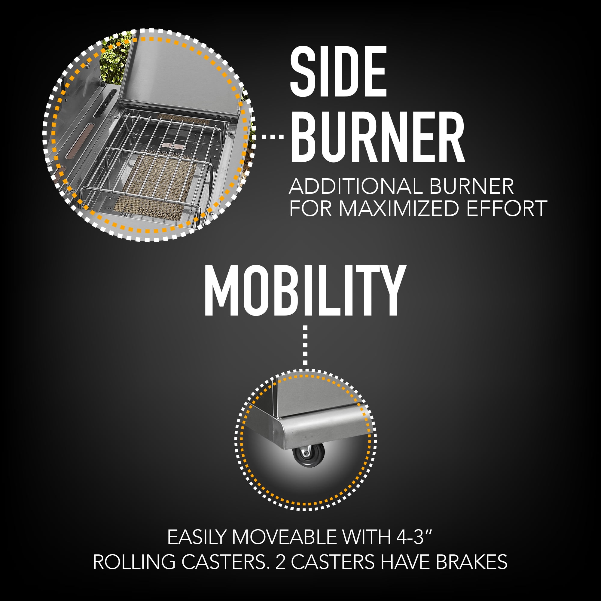 MULTIPLE BURNER GAS BBQ: 4 main burners made of stainless-steel tube. Each carries 10, 000 BTU. Includes one 12, 000 BTU Searing side burner. Total BTU is 52,000 GRILL SIZE: Total cooking surface of 606 square inches. Primary cooking surface of 432 square inches and secondary cooking surface of 174 square inches. QUALITY CONSTRUCTION: Equipped with the following features this grill is sure to last: Fully welded stainless steel lid & full aluminized steel liner, solid 6mm stainless steel cooking grates, stainless steel warming rack, two stainless steel doors with stainless steel liner, full stainless steel side panels & stainless steel bottom panel and aluminum grease box. MOBILE: Easily moveable with 4-3” rolling casters. 2 casters have brakes. EASY TO START: Electronic ignition makes starting this grill as easy as pushing a button with individualized ignition system. Convertible to Natural Gas with Conversion Kit, Part # PP-20400-CS (sold separately) and Requires Professional Installation; Expert Assembly Not Included
