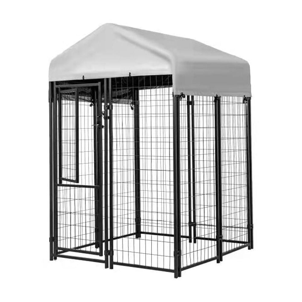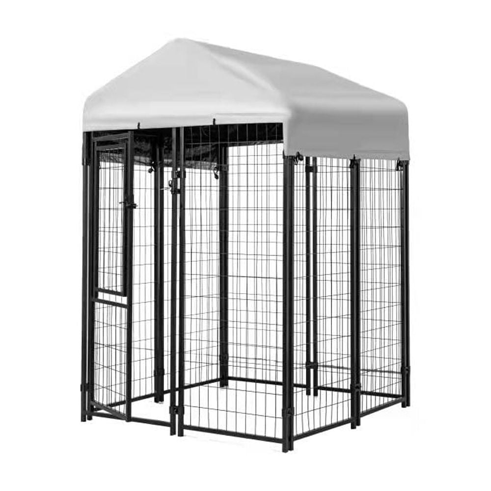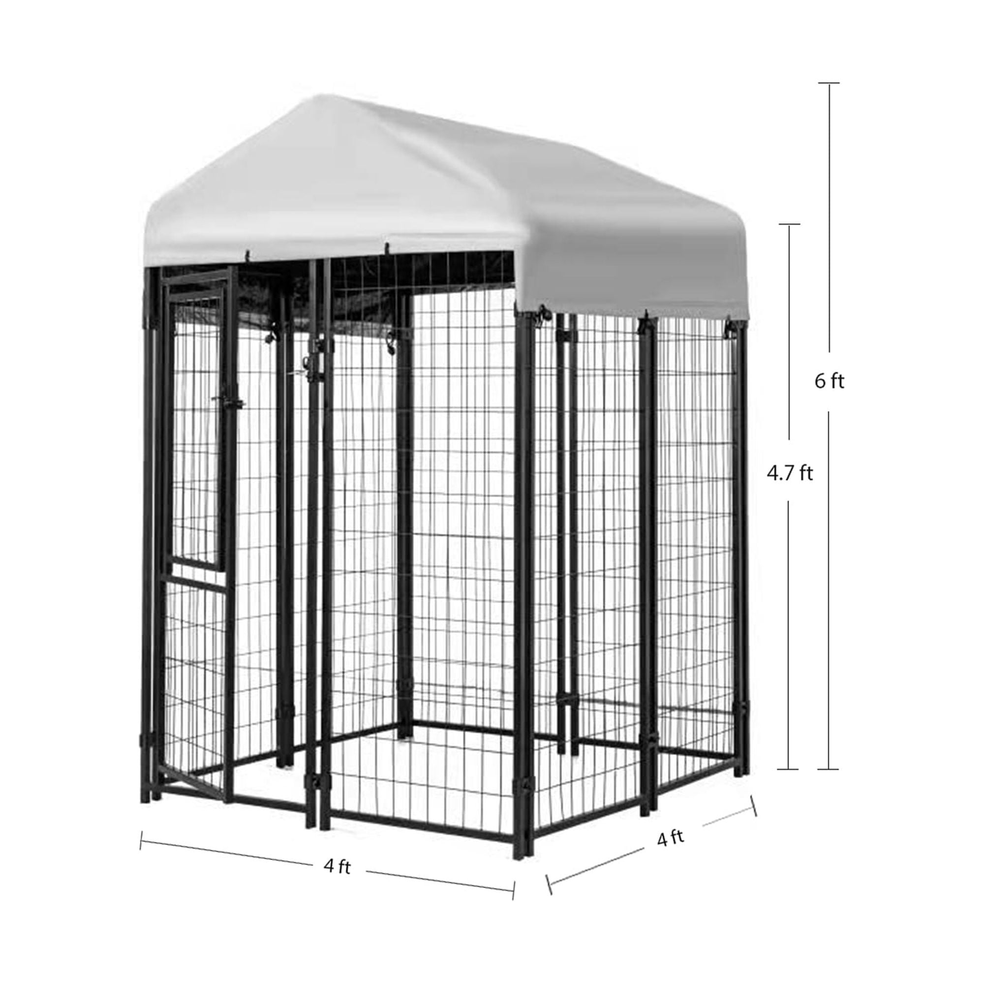 The KennelMaster 4 ft. x 4 ft. x 6 ft. kennel takes the complication out of assembling and installing an animal enclosure. Constructed of sturdy 12-gauge wire, this kennel is built to handle climbing, chewing, digging, and clawing. This solid steel kennel keeps your pet safe, while the waterproof cover provides shade from direct sunlight and shelter from rain. The Hammertone powder-coated finish resists rusting and prolongs the life of your kennel, in addition to offering a professional textured, finished look. The kennel gate features an additional, smaller access door within the gate which allows you to place food, toys, blankets, or other objects inside your pet’s kennel without fully opening the gate, ensuring your pet remains securely inside. It is very easy to assemble this kennel, and no tools are required. Also available in two larger sizes: Medium 6 ft. x 4 ft. x 6 ft. model and large 8 ft. x 4 ft x 6 ft. model.