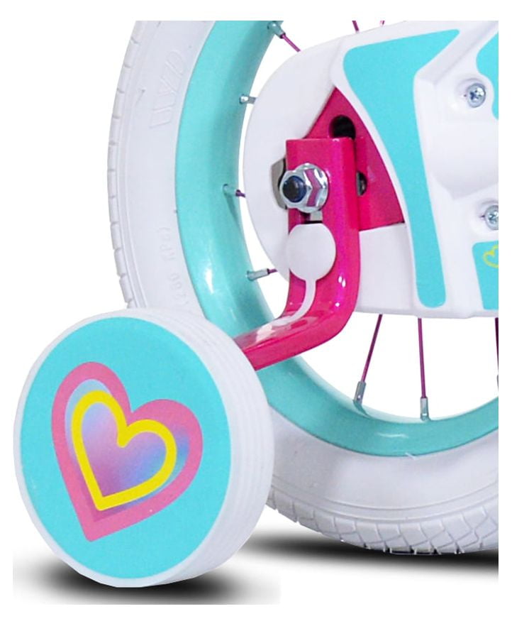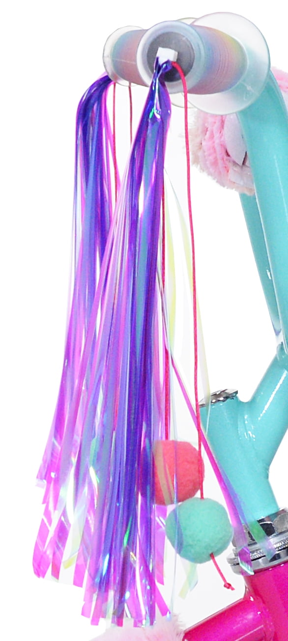 Removable training wheels included 12″ white tires with blue sidewalls Furr-tastic attachment on the top tube Furr-tastic mounted bag Fun, colorful cat graphics Pink spokes Colorful and handlebar streamers