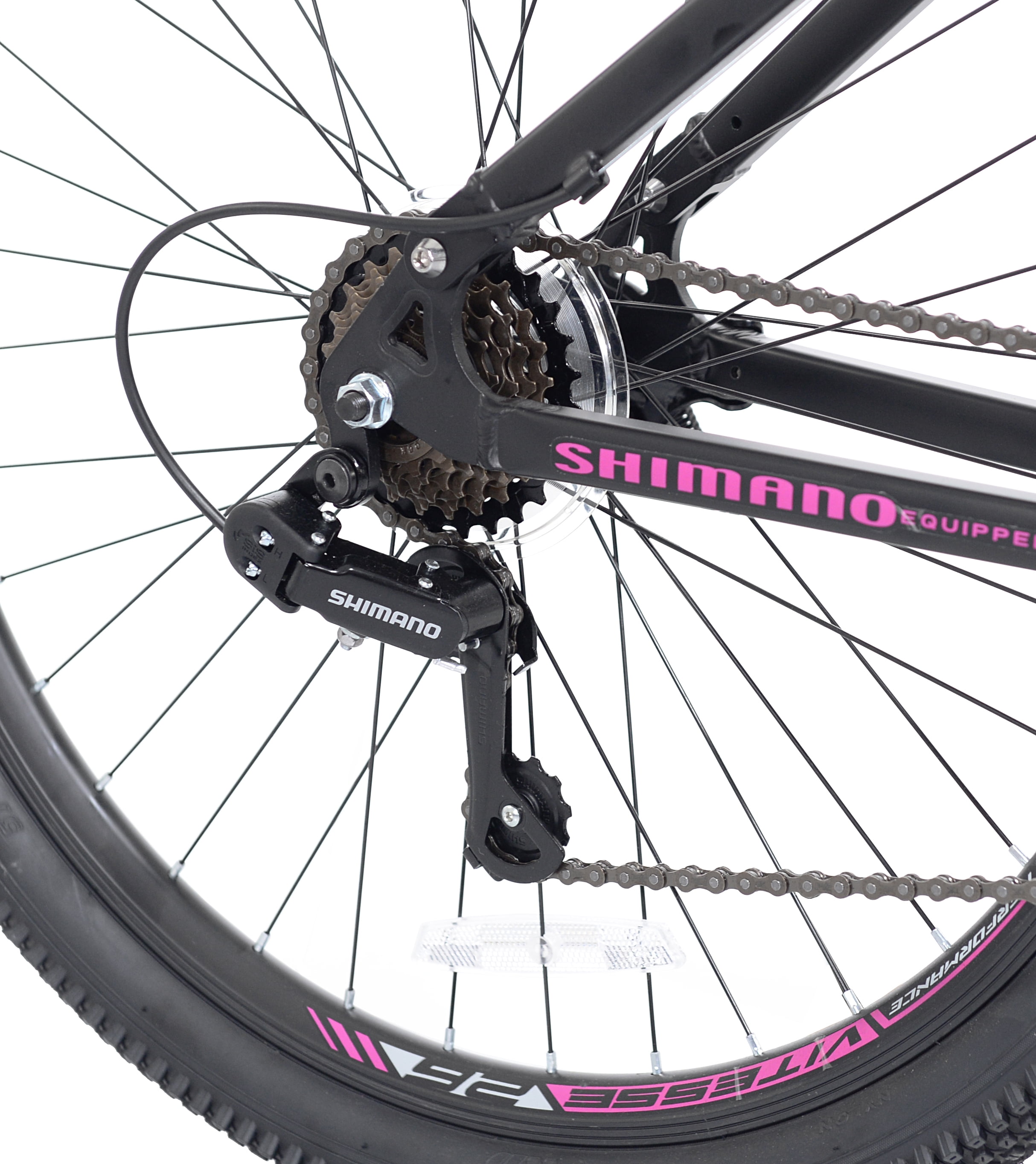 Aluminum frame mountain bike Designed for women 5’2″ and taller Quick-release seat post – for easy seat height adjustments Front disc brakes and rear linear-pull brakes- for steady stopping power 21-speeds with Shimano rear derailleur – just twist to shift Traditional plastic pedals Front and rear suspension Ideal for adult females