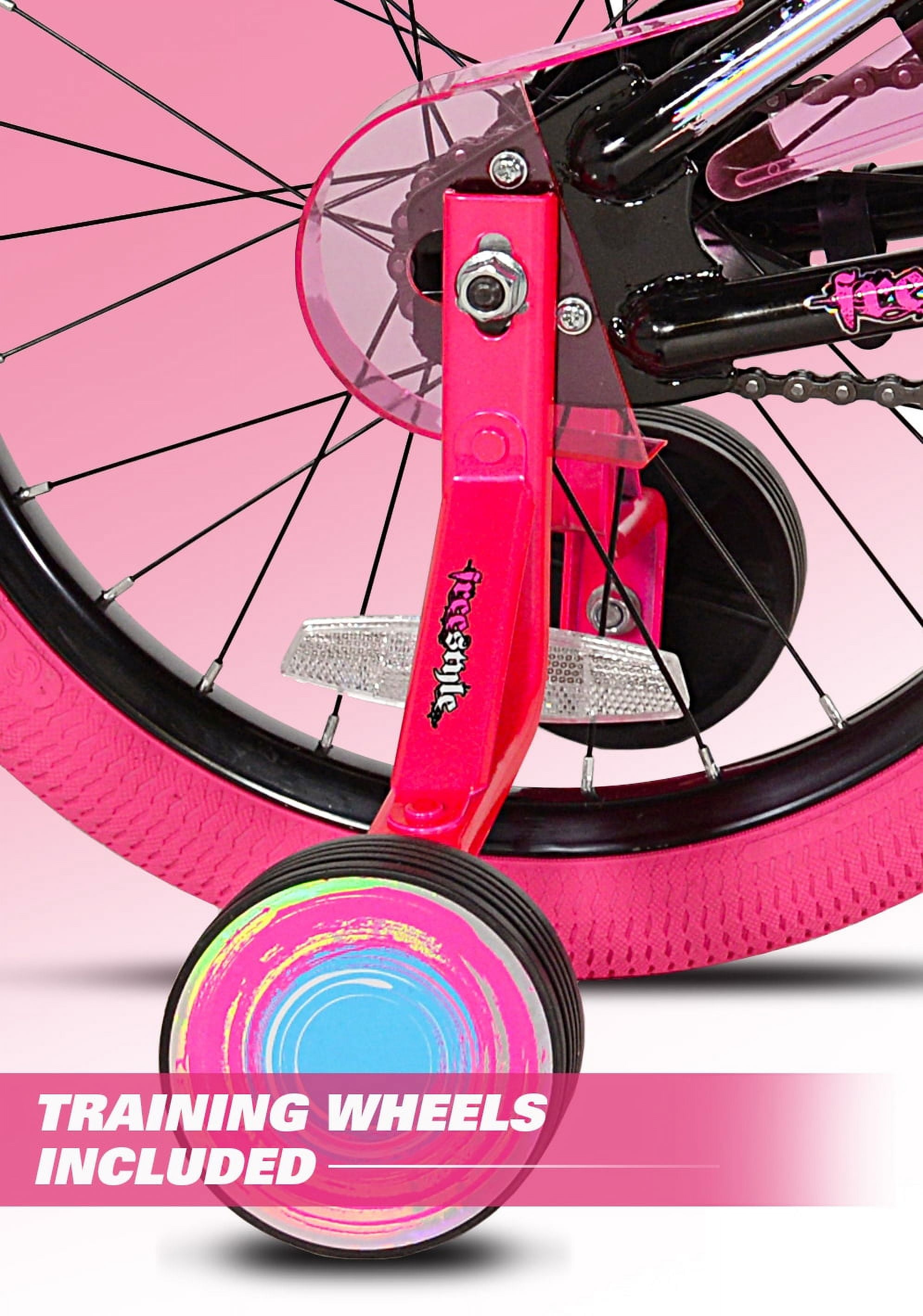 Over-sized steel frame Rear foot brake plus dual front and rear side-pull handbrakes High-rise BMX handlebars with a secure 4-bolt stem Front pegs, training wheels, and fashion bag included Padded adjustable seat Adjustable training wheels Bike for young female 18-inch wheels 18″ child bicycle