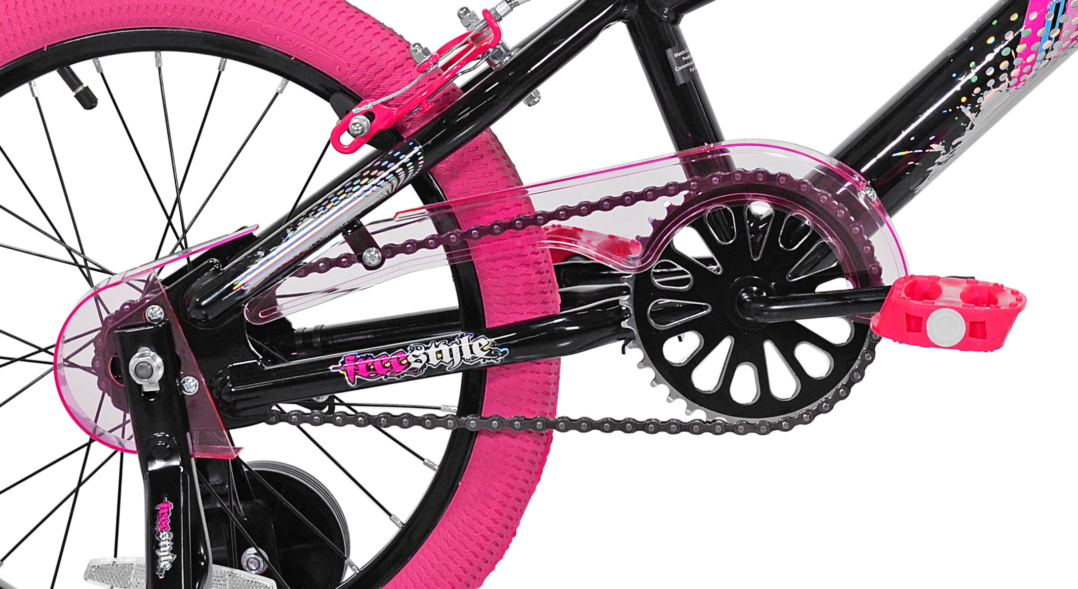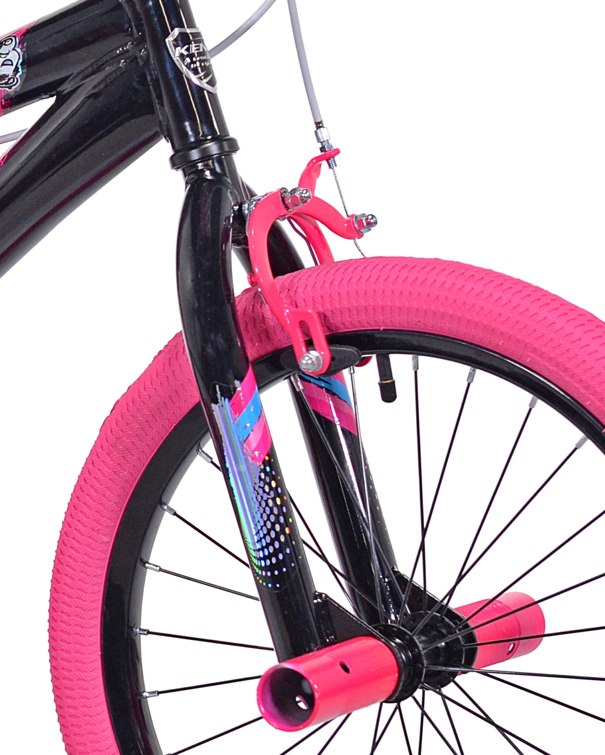 The Kent sparkles 18-inch child bicycle is so fun for kids to ride. It is ideal for girls that have just moved onto their first two-wheeler with an oversized steel frame, it provides sturdiness and stability for new riders. It is painted with a stylish black color with hot pink, cool graphics, and pink tires also add a fun accent. This girl’s/female bike comes with matching Training-Wheels that can be used to build confidence while little ones are learning to ride. It also has adjustable high-rise BMX-style handlebars and the seat height can be adjusted easily without the use of tools via the lever-activated quick-release. This bike fits most kids 3’8″ in height and up and it features a rear foot brake plus dual front and rear side-pull handbrakes. They can be used to keep the bike under control for greater safety. Low-profile tread street tires and a padded seat smooth out the ride. This unit features front axle pegs and a matching handlebar-mounted carrying bag to create a unique look.