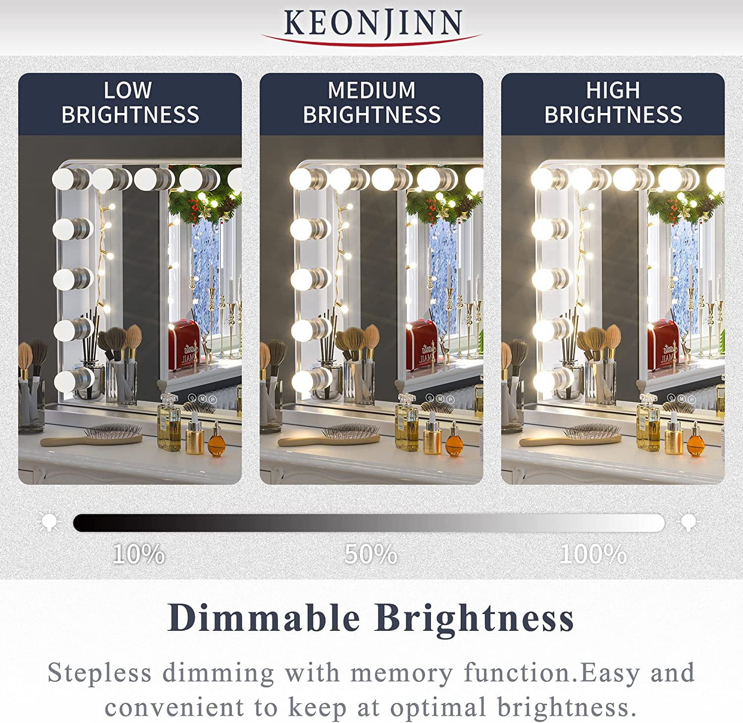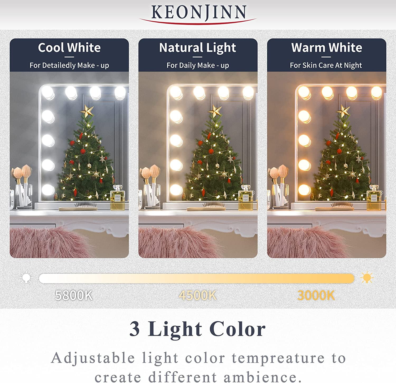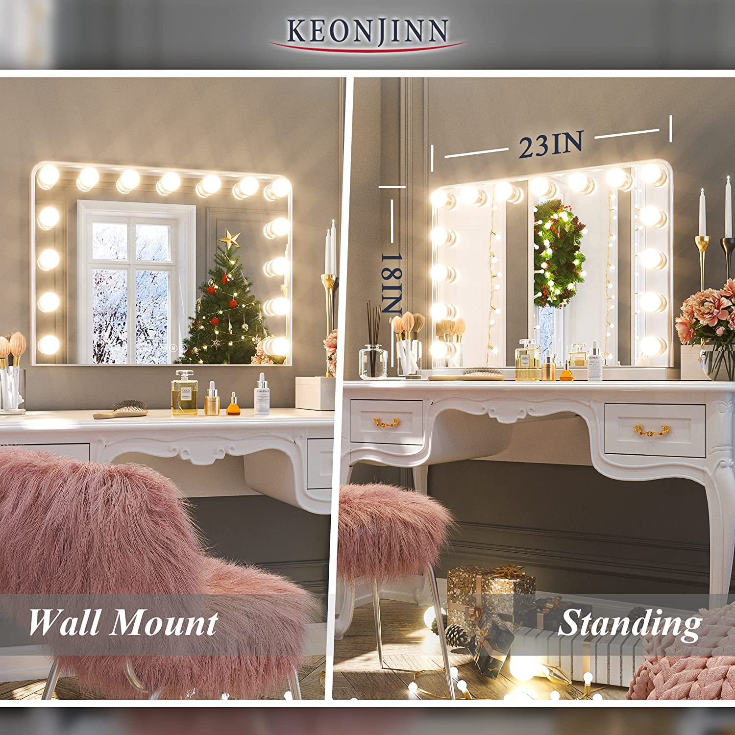 [3 Color Lights & Memory Function] The black vanity mirror with lights for bedroom is surrounded by 15 LED bulbs and can be adjusted in 3000K-5800K, 3 modes (cool, natural, and warm). Brightness can be adjusted to meet your different makeup lighting requirements. With memory function to remember your setting preferences. [Plug-in Replaceable Blubs] The black Hollywood vanity mirror bulbs are replaceable. If the bulb fails, you can simply replace it with 2 extra bonus bulbs. Our vanity mirror with lights has a longer lifespan than other non-replaceable makeup mirrors. [USB Charging Port] Use Keonjinn vanity mirror with lights to enjoy makeup time with ease. A USB charging port(5V, 1.5A) on the right side of the Hollywood mirror provides convenient charging for your phone/pad. [Hollywood Mirror with Black Frame] With unique elegant metal frame and base, it is suitable for dressing rooms, bedrooms, makeup studios and salons. Just what you need to create the perfect relaxing atmosphere! The Hollywood mirror with lights will definitely light up the mood in your room. [Wall Mounted & Tabletop] The large vanity mirror with lights can be placed on the tabletop with a detachable metal base, and can be wall mounted with two back holes. Comes with a small 10x magnifying mirror and the accessories needed for installation.