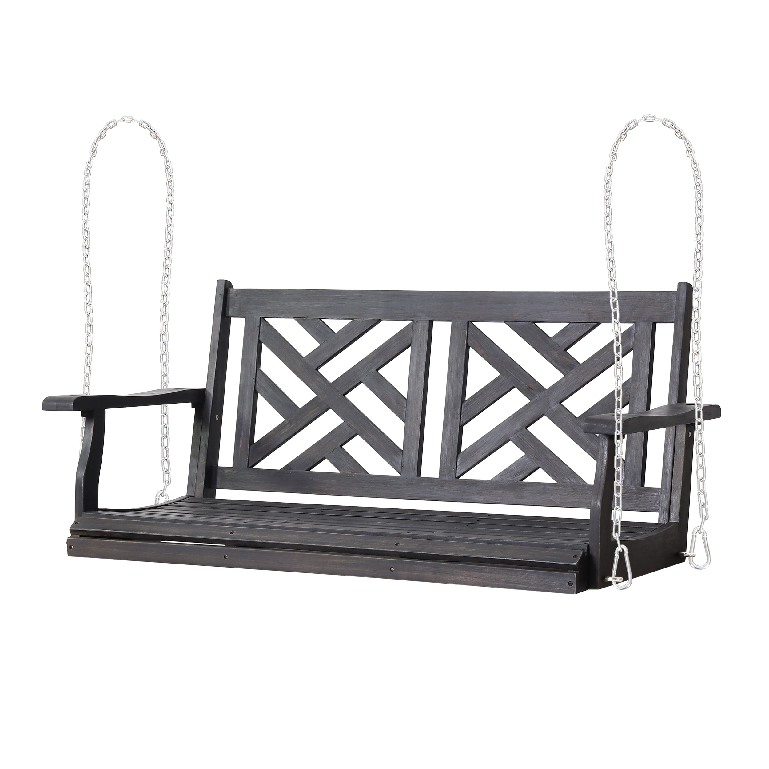 Includes: One (1) Porch Swing Material: Acacia Wood Chain Material: Iron Multiple Color Options Assembly Required Dimensions: 25.25 inches deep x 49.25 inches wide x 22.00 inches high Seat Dimensions: 20.25 inches deep x 43.25 inches wide x 3.25 inches high Arm Height: 12.50 inches Weight Capacity: 800 lbs