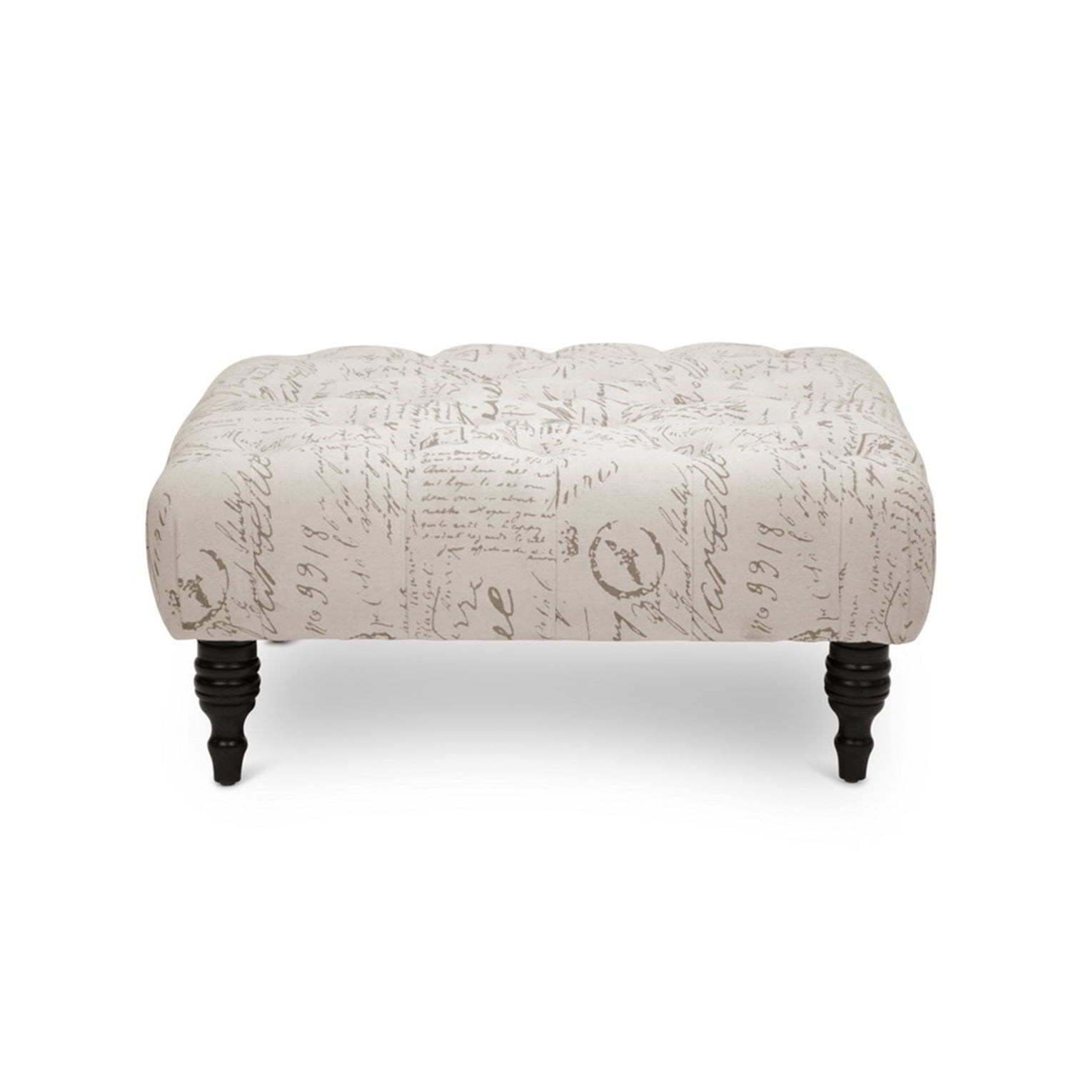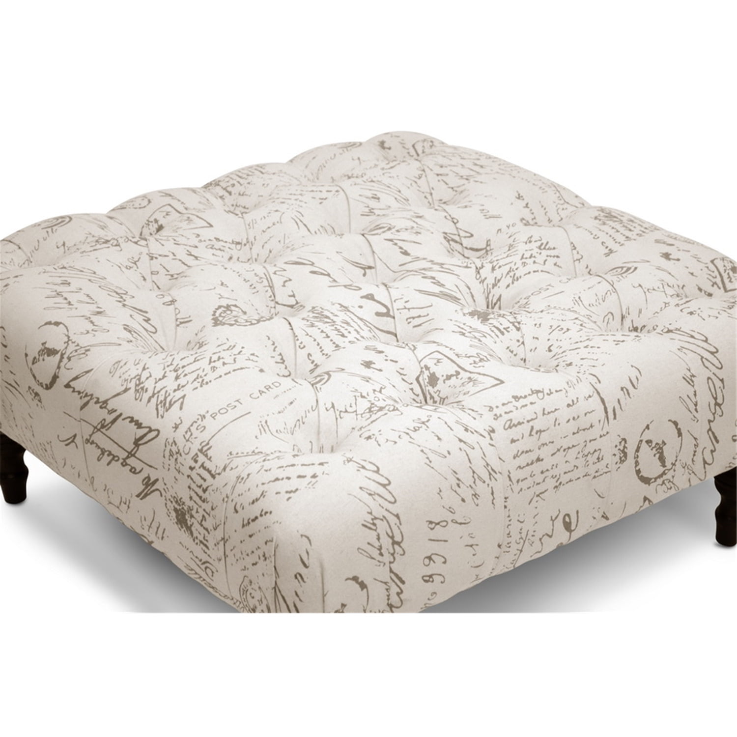 Whether used as a modern coffee table, contemporary ottoman, or both, Keswick is a keeper. You will love the beautifully button-tufted beige script print upholstery and the black turned wood legs. Made in China with a eucalyptus wood frame and polyurethane foam cushioning, this upholstered ottoman requires assembly and should be spot cleaned. A solid beige linen and solid dark gray linen option of this style are also offered (sold separately). Features: Color: beige Made of linen, solid wood, eucalyptus wood and foam Modern style Button tufted Polyurethane foam padding Black legs with non-marking feet Product Weight: 25lbs Specifications: Product Dimensions: 15.75″ H x 35.25″ W x 35.25″ D