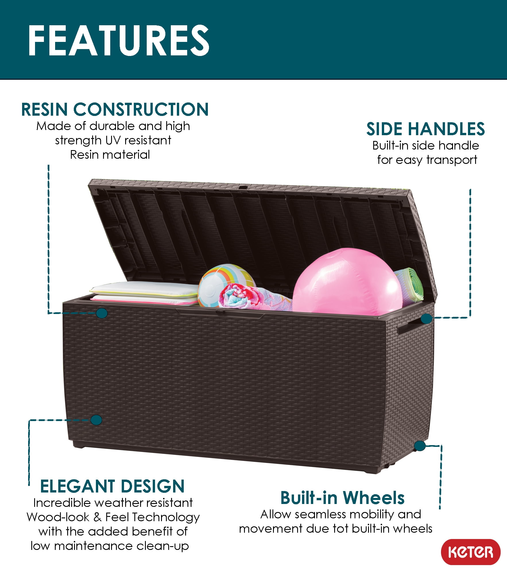Lockable lid (lock not included) Easy to move around and reposition thanks to built-in handles and rollers Natural-look rattan-style texture Easy assembly takes just 15 minutes without additional tools Heavy-duty lid (holding up to 250 kg/551 lbs.) can seat two adults