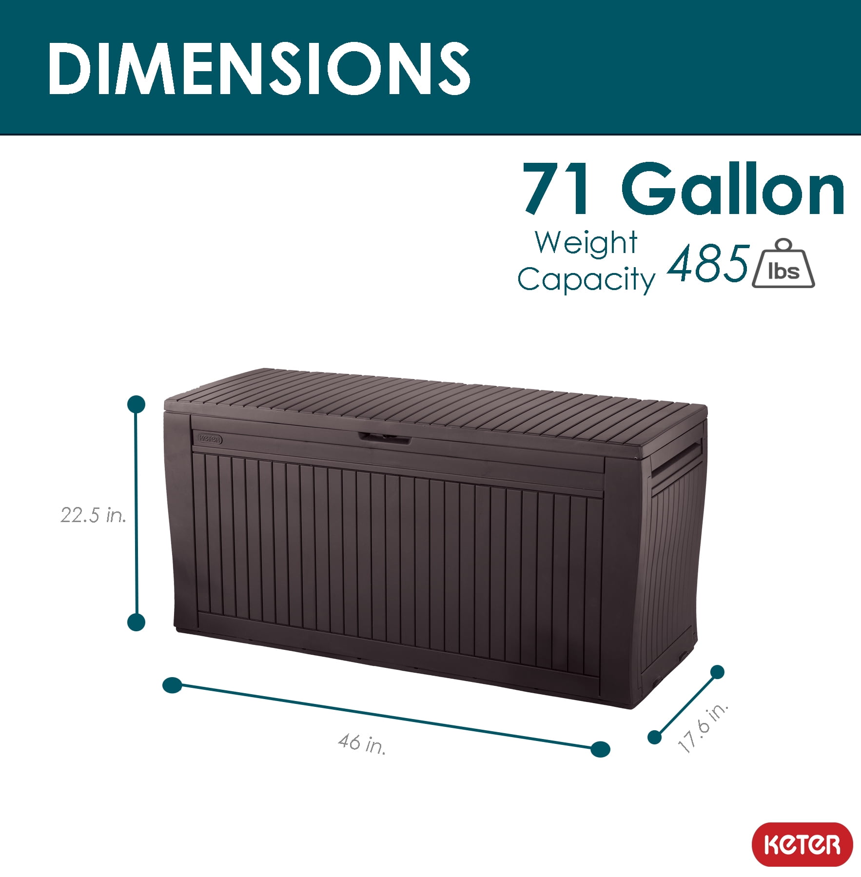 Dimensions: 46 in. L x 17.6 in. W x 22.5 in. H 71 gallon storage capacity All-weather, waterproof and UV protected – will never warp, dent, rust or peel Natural wood grain texture matches any outdoor living decor Quick and easy assembly – no tools required