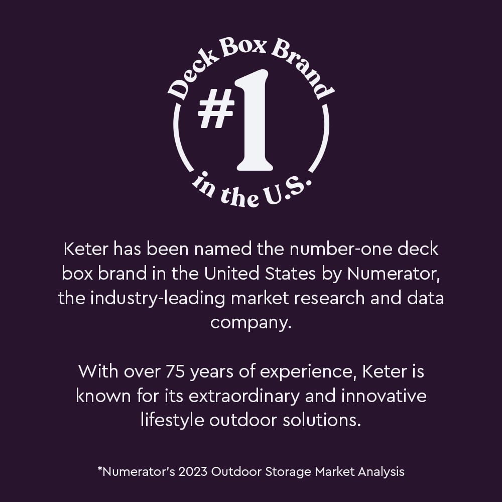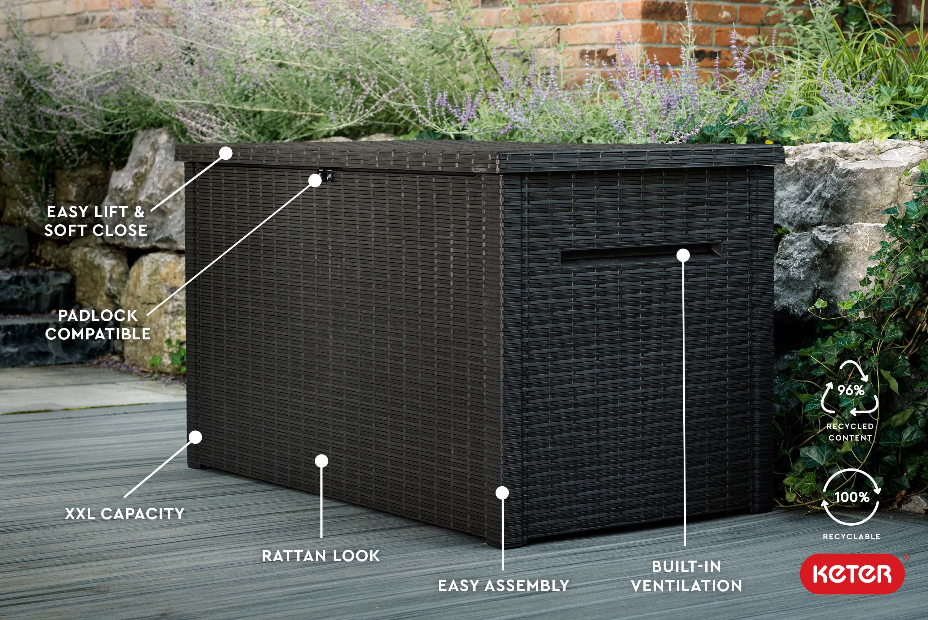DIMENSIONS: Exterior: 57.5 in. L x 32.67 in. W x 33.85 in. H / Interior: 51.9 in. L x 28.3 in. W x 31.1 in. H XXL CAPACITY: Extra large storage capacity can hold up to 230 gallons RESIN CONSTRUCTION: It’s made out of all weather-resistant resin with an appealing rattan texture DURABLE AND STRONG: Weather-resistant polypropylene construction prevents rusting, peeling and denting – unlike real rattan HYDRAULIC PISTONS: Easy lift and soft close mechanism pulls the top completely open and shuts slowly with minimal effort – easy for kids to use and no smashed fingers LARGE CUSHION STORAGE: Perfect storage solution for large and bulky items you want to keep on hand EASY ASSEMBLY: Simple and quick assembly only needing a screwdriver will have this together in a snap VERSATILE STORAGE: Perfect place to store outdoor patio furniture cushions, outdoor toys, pool accessories, and beach towels BETTER WITH KETER: This product is made from 96% recycled materials and is 100% recyclable. At Keter, sustainable and durable solutions are at the core of what we do.