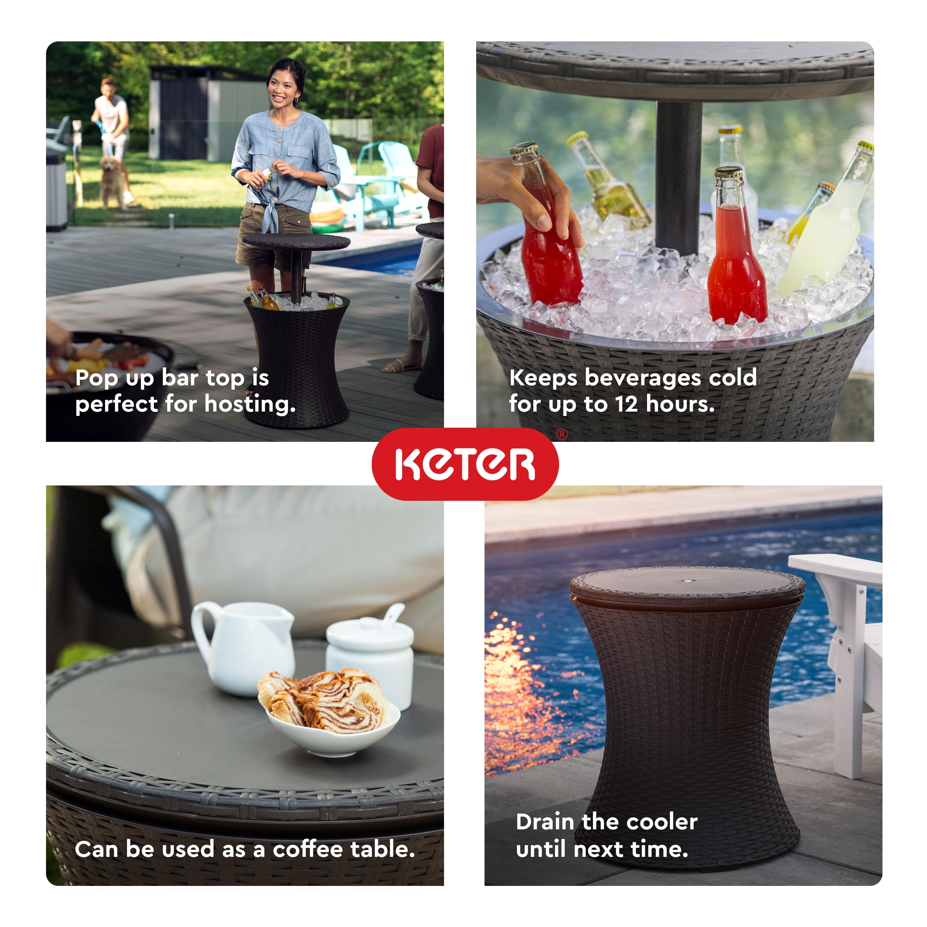 IDEAL SIZE: Dimensions: 19. 5 D x 33. 2 H in. POP UP TOP: Lid elevates upwards 10 inches above the rim for use as a cocktail table HIDDEN COOLER: 7. 5 gallon drink storage capacity to handle up to forty 12 oz. cans with ice RESIN CONSTRUCTION: It’s made out of all weather-resistant resin with an appealing rattan-look texture EASY CLEANUP: Drainage plug for easy cleanup in a pinch GIFTS FOR DAD: The perfect gift and bar accessory for the #1 BBQ Grill Master in your life VERSATILE USE: Use as a patio coffee table, bar table, drink cooler, and raised hot tub table