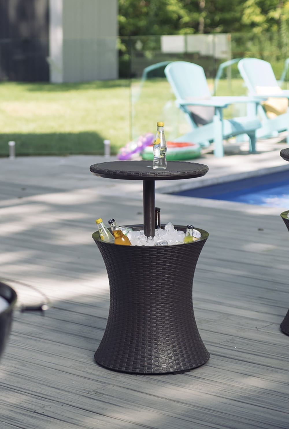 Keter Pacific 7.5 Gallon Cool Bar, Resin Outdoor Patio Beverage Cooler Table, Extra Storage, Rattan Look Dark Grey. The top rises smoothly from 22.5 inches to 33.2 inches in overall height and locks into place to prevent it from falling when topped with food and drinks!