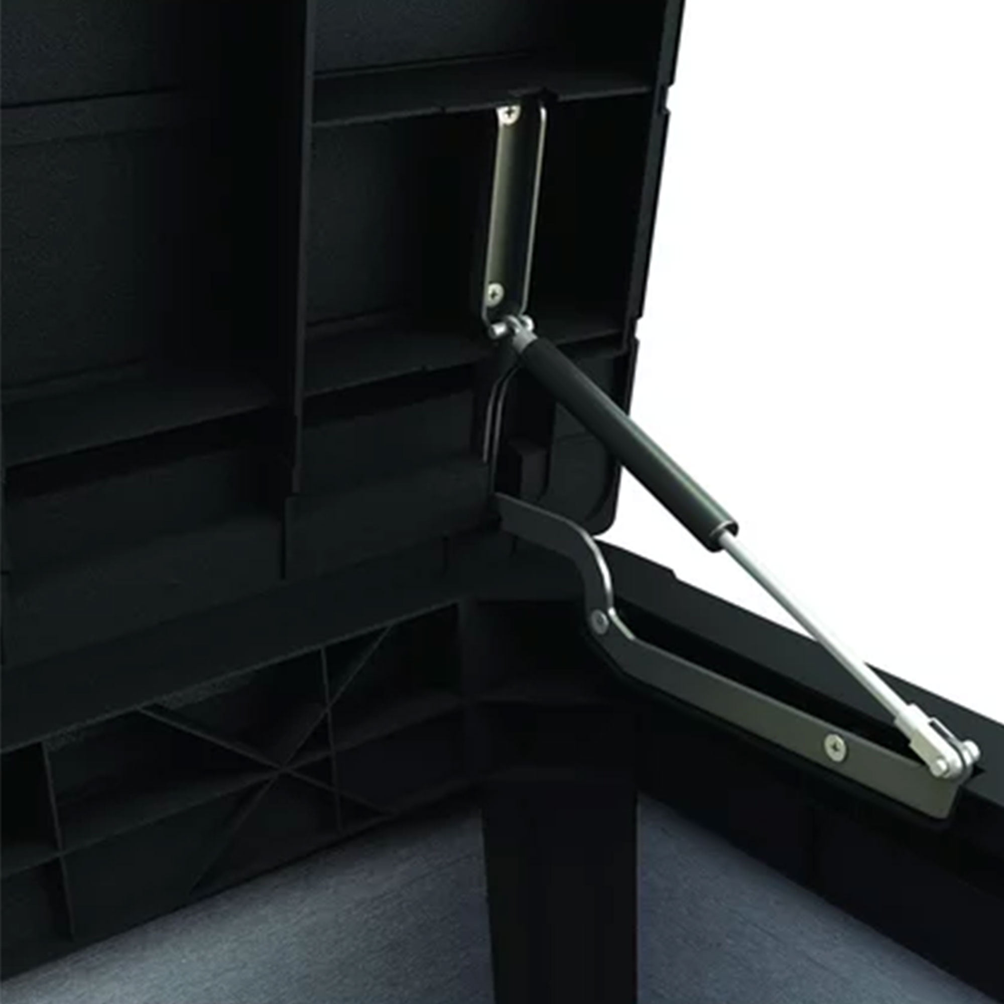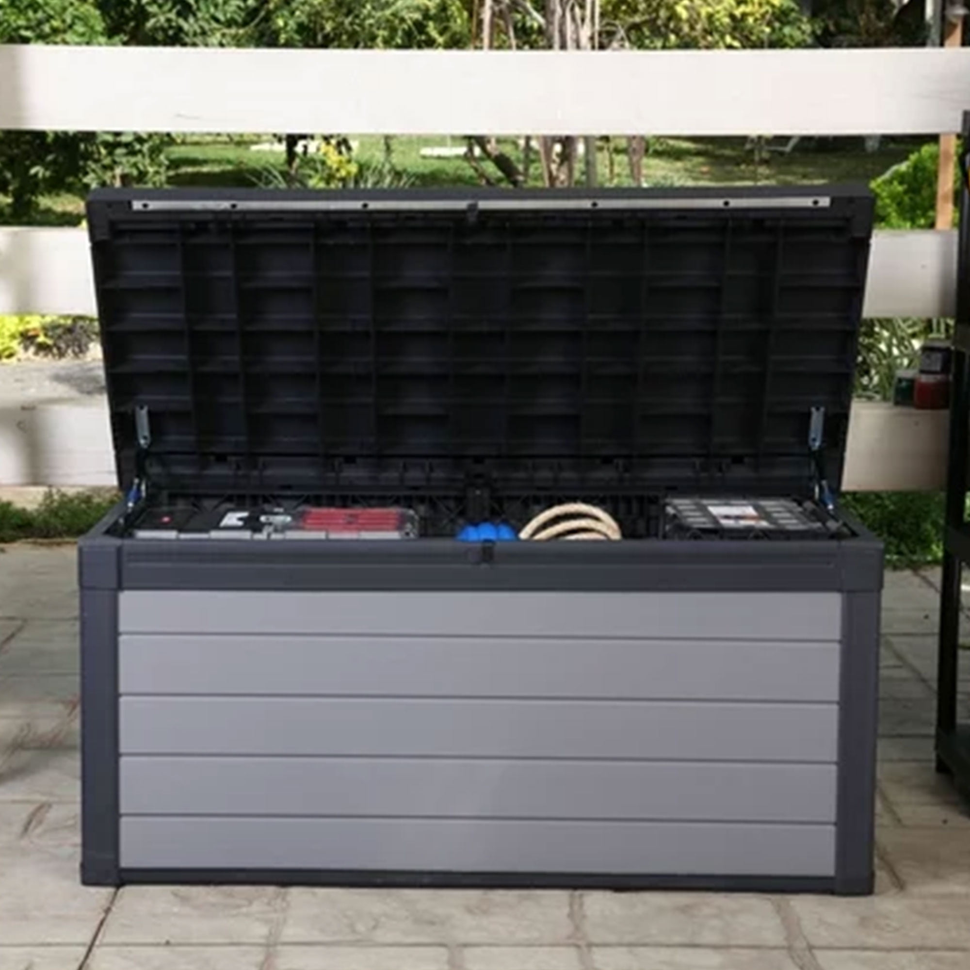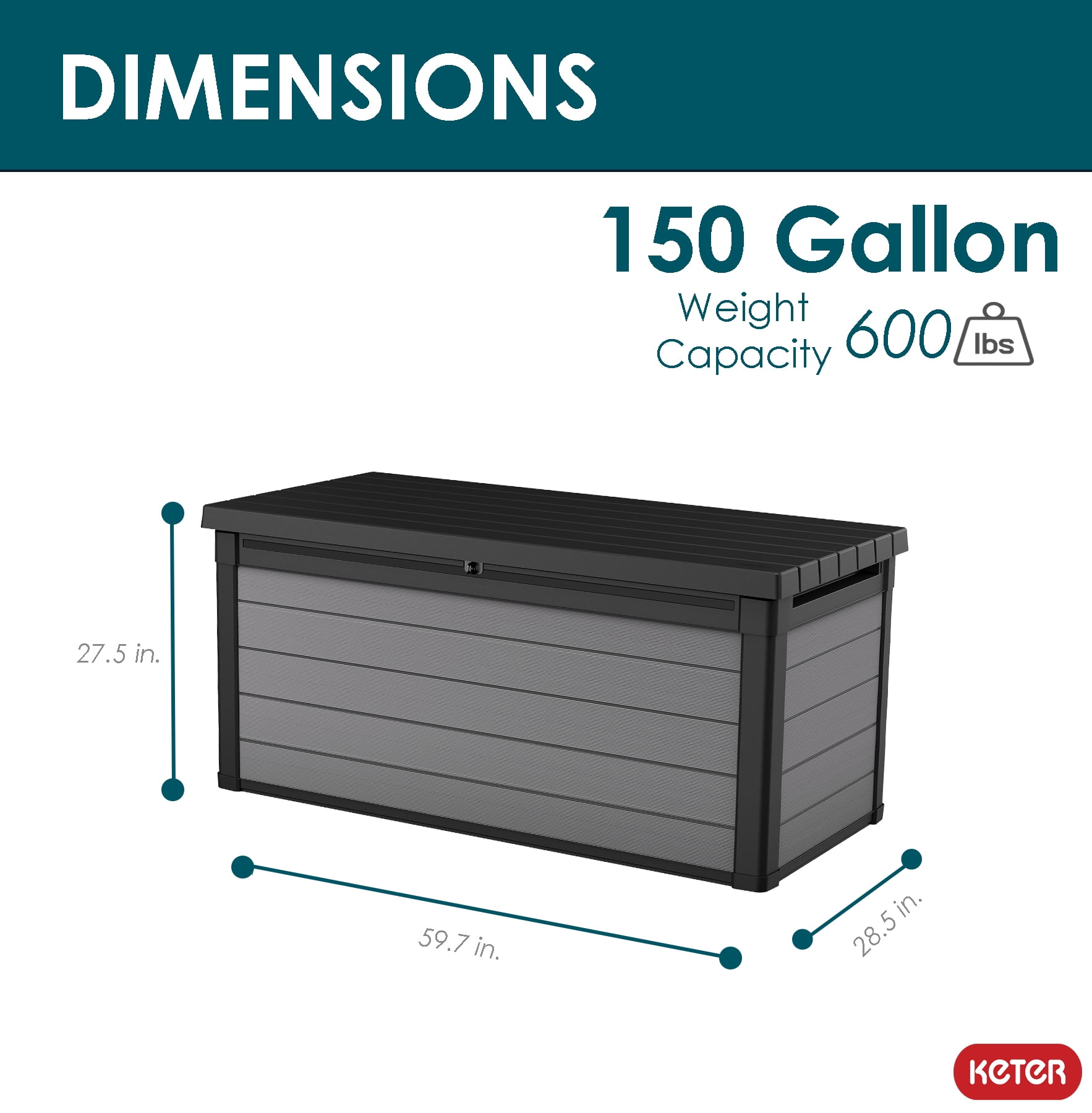DIMENSIONS: Exterior 59. 7 in. L x 28. 5 in. W x 27. 5 in. H / Interior: 56. 2 in. L x 25 in. W x 25. 1 in. H IDEAL STORAGE: Generous and large 150 gallon storage capacity RESIN CONSTRUCTION: It’s made out of all weather-resistant resin with an appealing wood-look texture DURABLE AND STRONG: Weather-resistant polypropylene construction prevents rusting, peeling and denting – unlike real wood HYDRAULIC PISTONS: Easy lift and soft close mechanism pulls the top completely open and shut slowly with minimal effort – easy for kids to use and no smashed fingers ATTRACTIVE DESIGN: Beautiful and classy grey color, dual tone wood-like panel appearance that will match any exterior color schemes EXTRA SEATING: Can also be used as a bench for extra seating in a pinch – 600 lbs. maximum weight capacity on lid VERSATILE STORAGE: Perfect place to store outdoor patio furniture cushions, toys, pool accessories, and towels