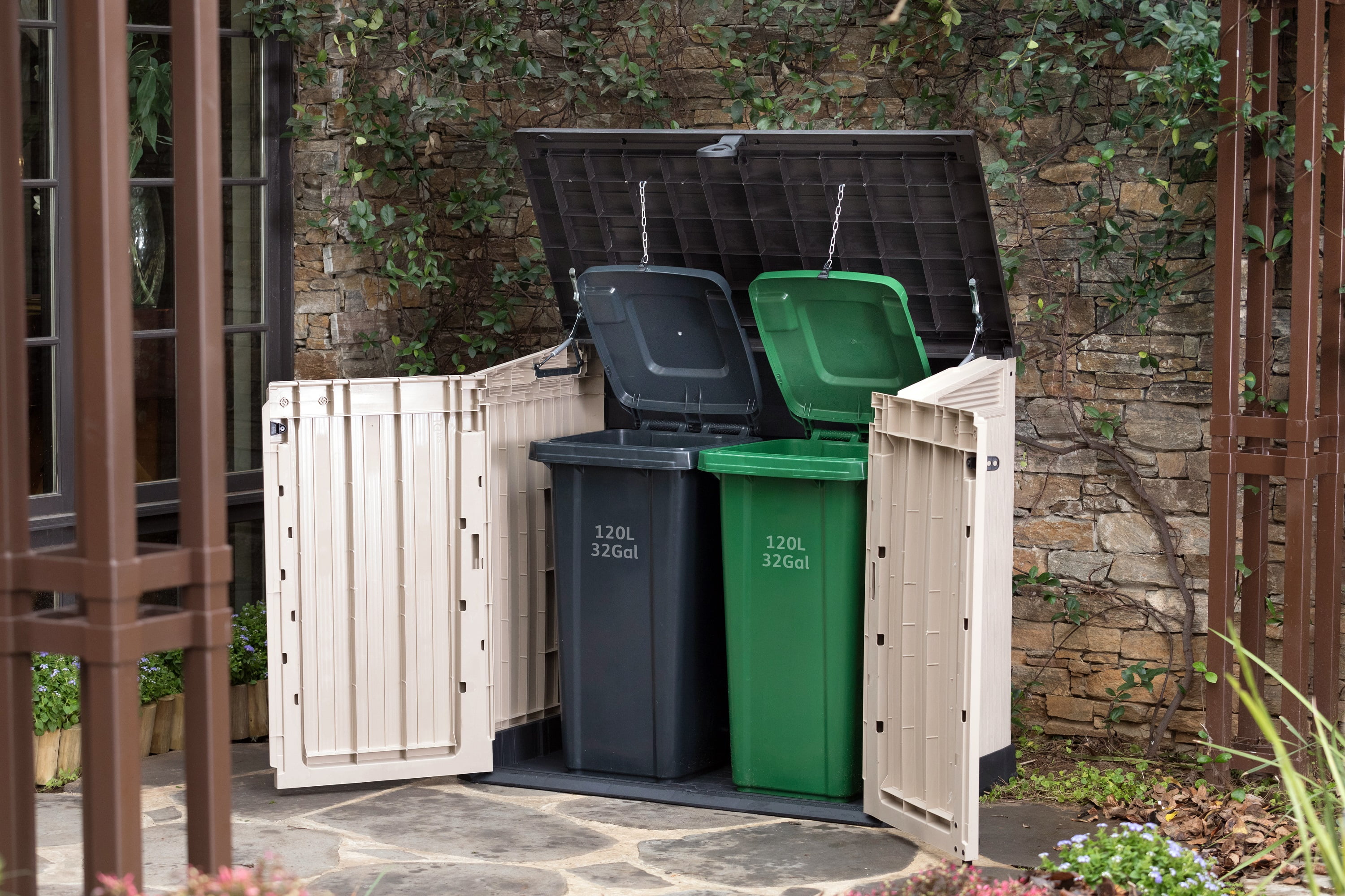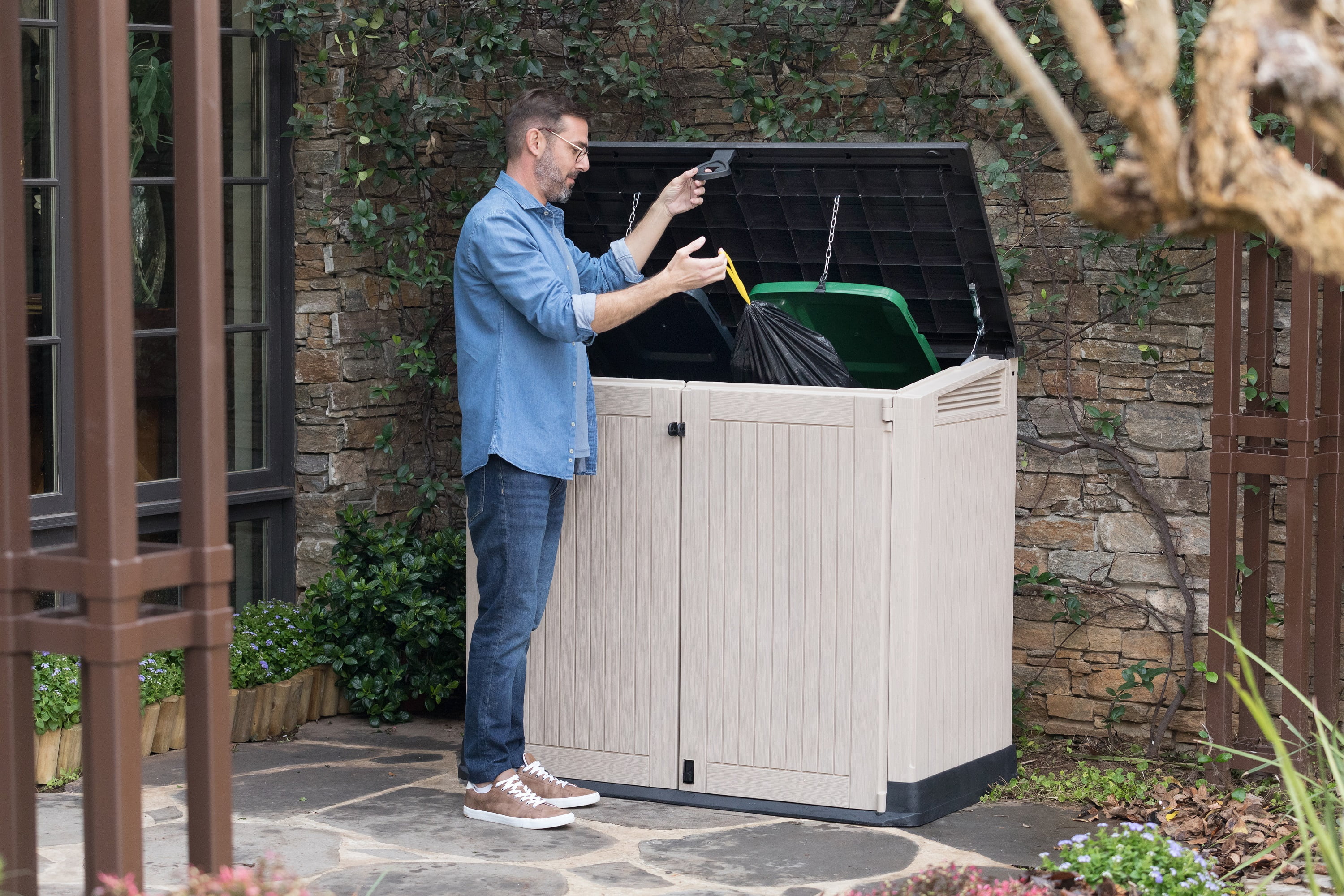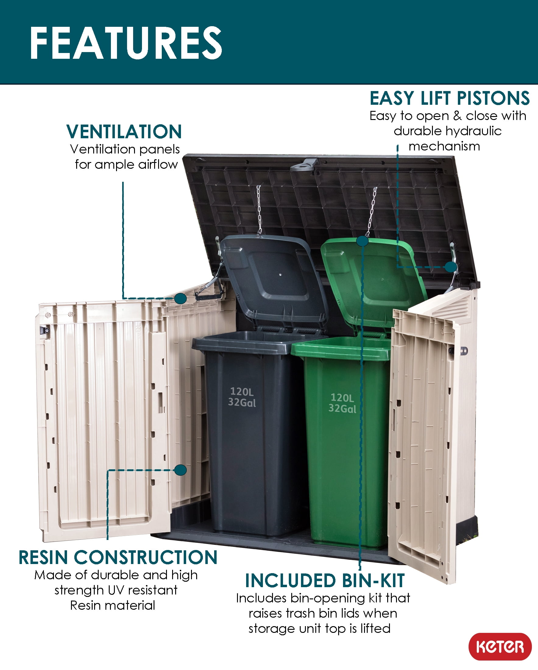 Ideal storage both indoors and outdoors with 845 L/30 cu. ft. capacity Can Store Two 32-Gallon Trash Cans Durable, weather-resistant construction that’s built to last Opens from the top or the front for convenient access Built-in floor panel keeps items clean and dry Built-in support for shelf (Shelf not included)