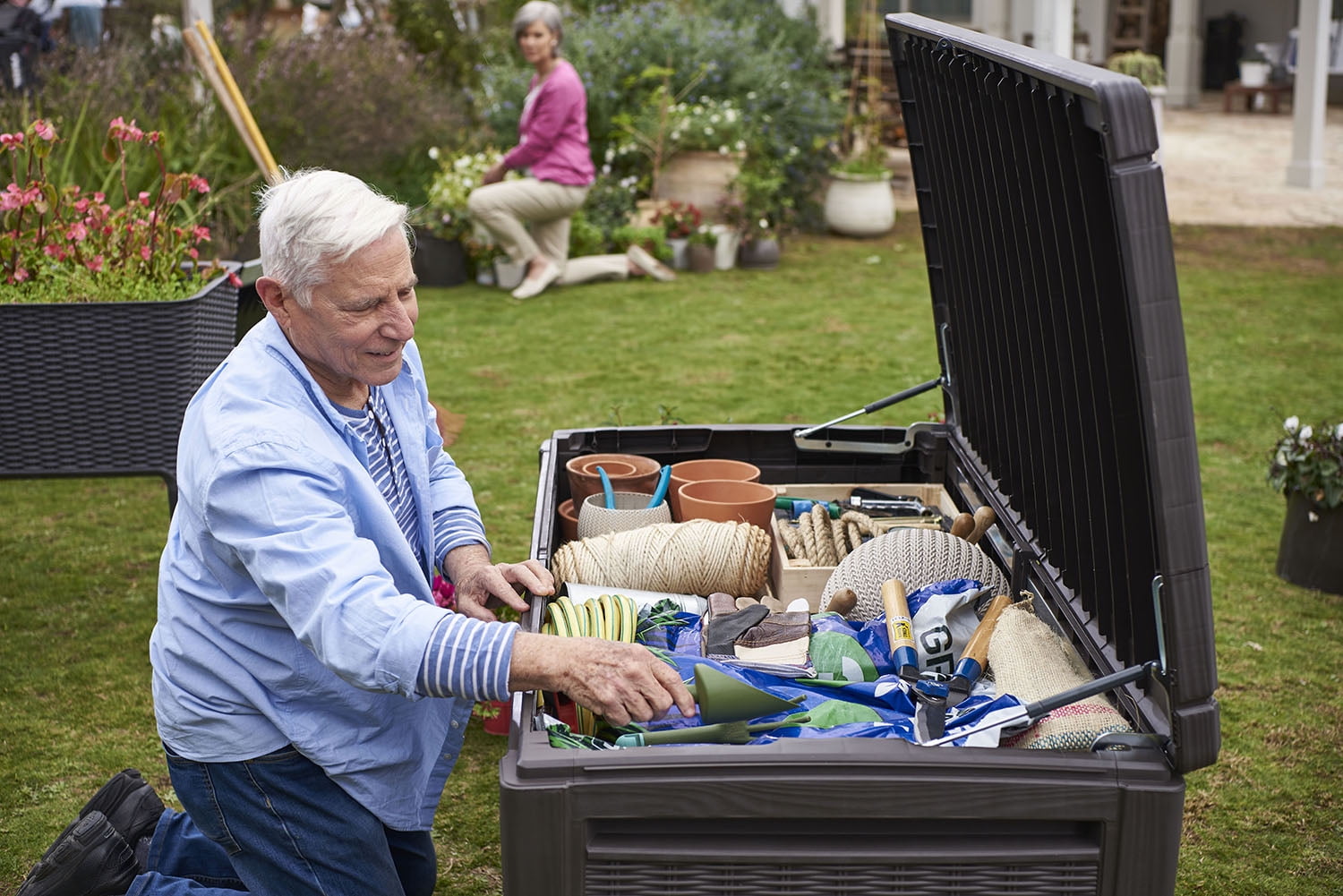 When choosing patio storage, you can’t go wrong with the Keter Sumatra 135-gallon resin deck box, available in either brown or anthracite. The exterior measures 57″ L x 28.7″ W x 25″ H, and the interior measures 54″ L x 26″ W x 22″ H. We design each box to provide a dry and ventilated environment for your stored items, whether they’re patio furniture, outdoor cushions, garden tools, pool toys, or other accessories. The sturdy, fade-free resin construction is weather-resistant and presents a convincing wicker-storage-chest look. Best of all, our Sumatra deck box also doubles as comfortable, beautiful furniture, with a weight capacity of up to 770 lbs. and space for 2 adults. Now you can entertain all of your loved ones without navigating outdoor clutter or running out of seating. For over 70 years, Keter has been inspiring people to create amazing spaces in their homes and gardens with innovative, high-quality products. We strive to create versatile, tough products that will enhance your space and your experiences. Build an outdoor oasis for you and your family or a firepit for a nightly couples retreat. We make it easy to entertain friends and neighbors. Your yard is a blank canvas, and you are the artist. Make it your own.