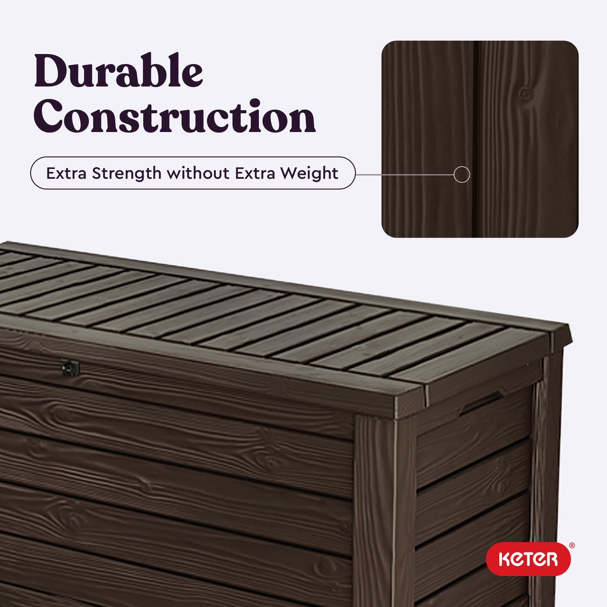 LARGE OUTDOOR STORAGE BOX: Fashionably store your outdoor furniture cushions, pool floats, and more. This outdoor storage bench offers lots of convenient, lockable storage space and has enough room to seat 2 adults. VERSATILE DECK BOX: This multipurpose outdoor storage container has a large interior with a 150-gallon storage capacity and gives you extra seating for those big backyard parties or a place to rest after working in your yard. DURABLE & ATTRACTIVE RESIN CABINET: This deck storage box is attractive and rugged and is made from strong, durable resin with a wood-plank look. It has an easy-lift mechanism for an effortless open and a quiet close. ALL-WEATHER-RESISTANT: The all-weather-resistant materials make this low-maintenance patio storage easy to use and enjoy for years to come. Unlike real wood, the thick exterior resin prevents rusting, peeling, and denting. BETTER WITH KETER: We are driven to invent. We create lifestyle solutions for use in and around the home in ways that only we can. We design using sustainable and innovative technologies to create products that enhance people’s spaces and elevate their experiences.