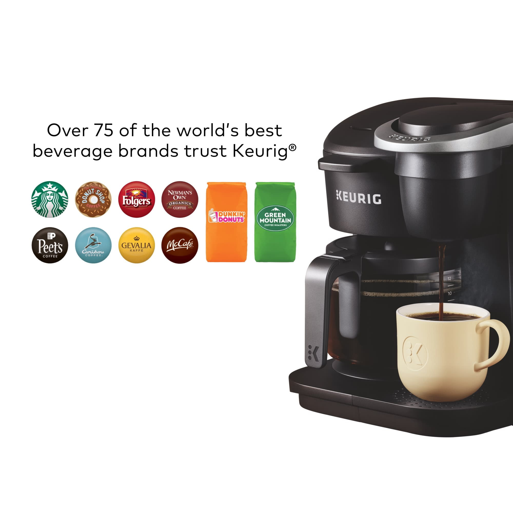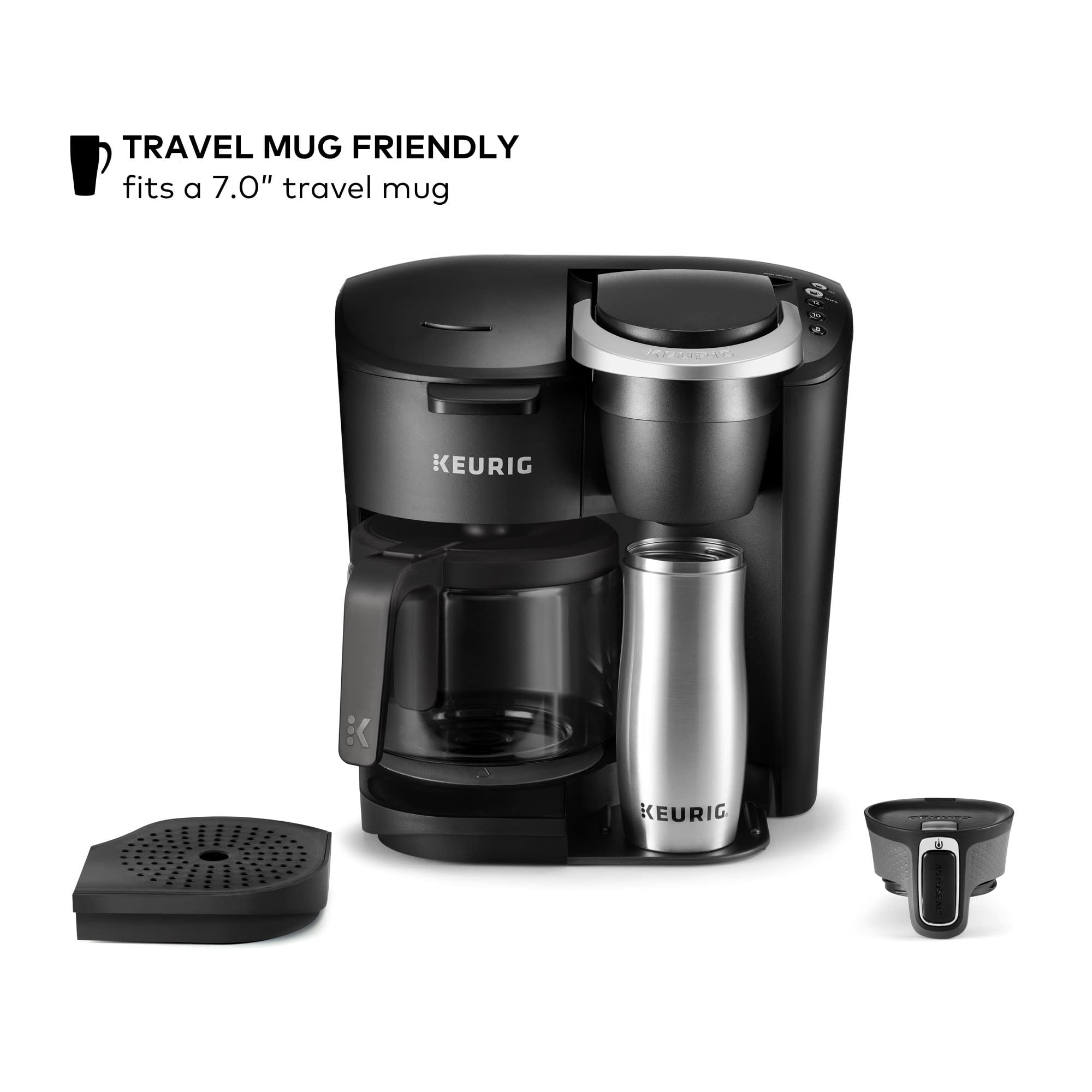 BREW A CUP AND A CARAFE: Use both ground coffee and K-Cup® pods. BREWS MULTIPLE CUP SIZES: Brew an 8, 10, or 12-cup carafe and an 8, 10, or 12 oz. cup. 60oz. SINGLE RESERVOIR: The 60 oz. water reservoir is shared between the single serve and carafe brewing, saving you time and simplifying your morning routine. Removable reservoir makes refilling easy. 12-CUP GLASS CARAFE: Included with your brewer along with a heating plate to keep coffee hot. PAUSE & POUR: Automatically pauses your coffee maker mid-brew for 20 seconds, allowing the carafe to be poured. ENERGY EFFICIENT: Auto off feature for both your brewer and your heating plate: turns your brewer off 1 minute after the last single cup brew and turns your heating plate off 2 hours after the last carafe brew. TRAVEL MUG FRIENDLY: Accommodates travel mugs up to 7.0” tall. COMPATIBLE WITH THE MY K-CUP® UNIVERSAL REUSABLE COFFEE FILTER: Brew your own ground coffee (sold separately). SIMPLE BUTTON CONTROLS: Just insert any K-Cup® pod or ground coffee and use the button controls to brew a delicious cup and carafe. One coffee maker