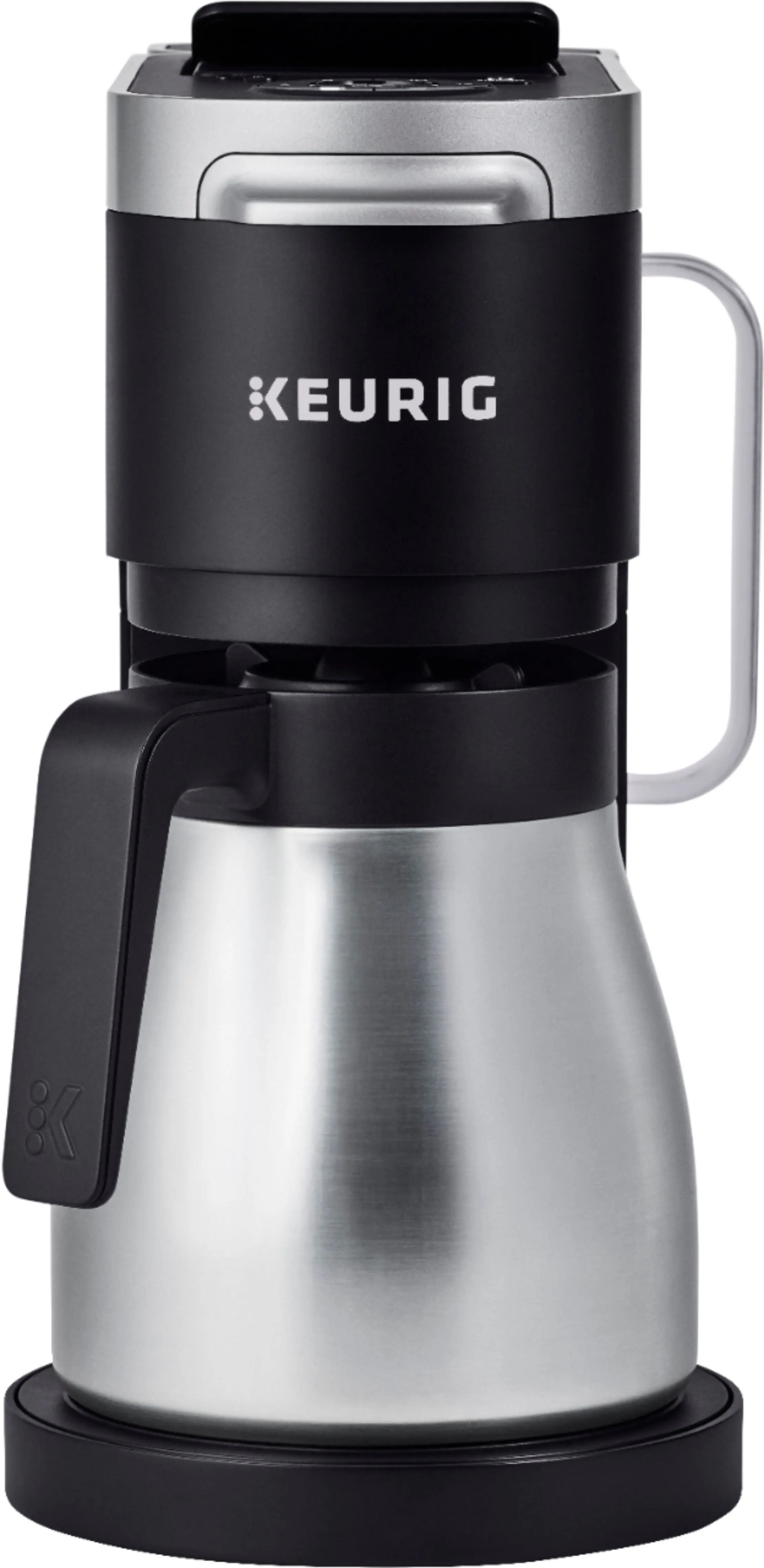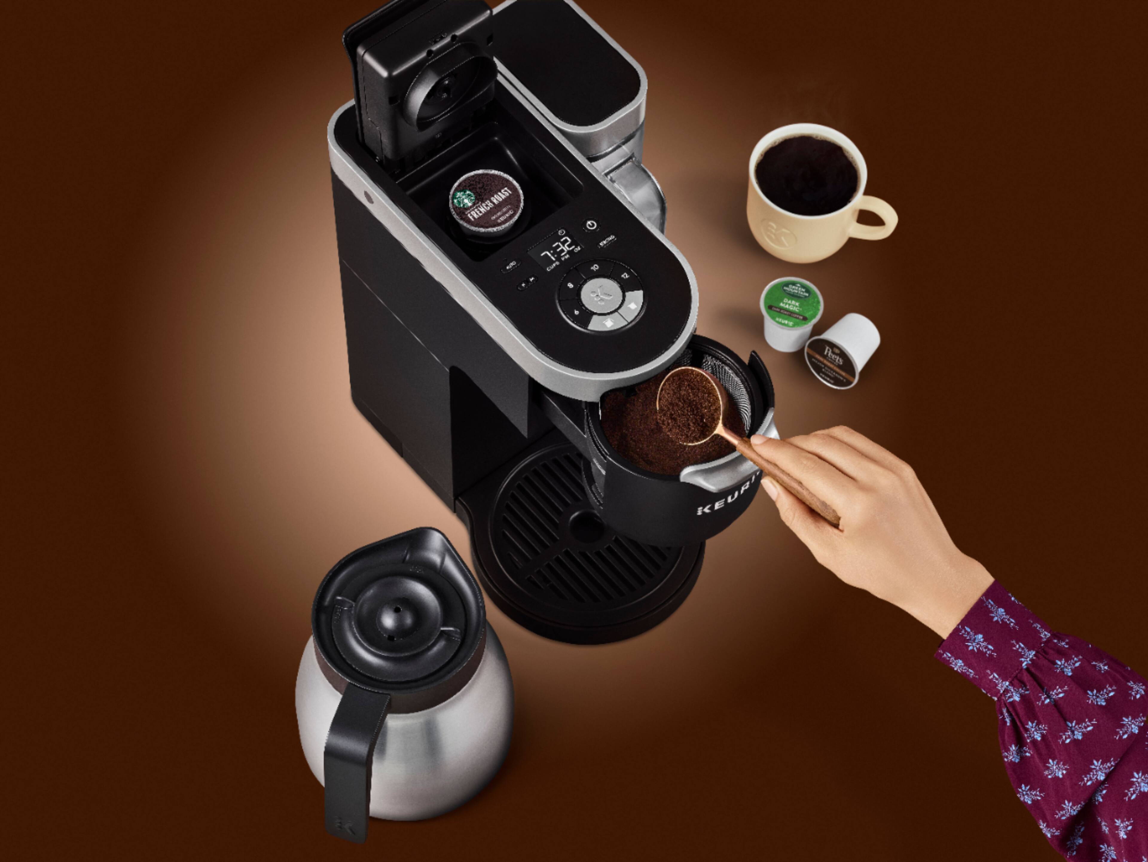 Serve up a single cup or share a carafe with this Keurig K-Duo Plus coffee maker. Combining a single pod option with a full-pot brewer, this forward-thinking machine includes a 12-cup thermal carafe to keep your coffee warm. Programmable function lets you wake up to fresh coffee, while the Pause & Pour feature on this Keurig K-Duo Plus coffee maker means you can grab a cup before the brewing cycle has finished.
