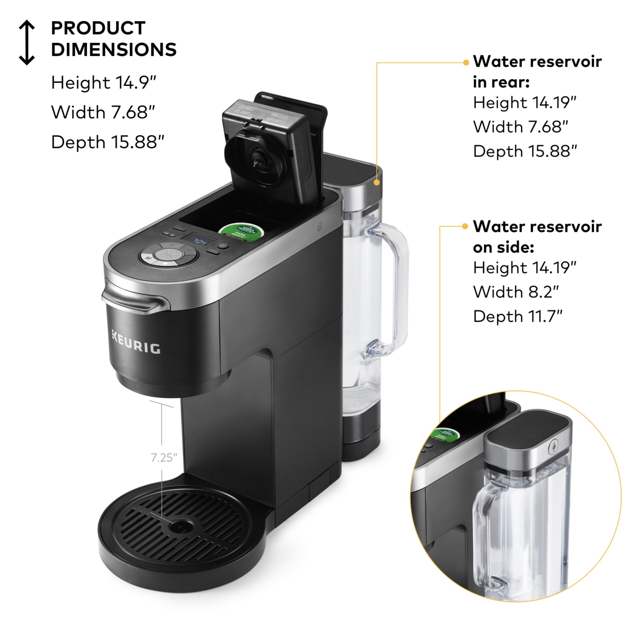 BREW A CUP AND A CARAFE: Use both ground coffee and K-Cup® pods. STRONG BREW: Brew a stronger, more intense single cup and carafe. BREWS MULTIPLE CUP SIZES: Brew a 6, 8, 10, or 12-cup carafe and a 6, 8, 10, or 12 oz. cup. MULTI-POSITION 60 oz. WATER RESERVOIR: Can be positioned to the right, left, or along the back of the brewer to optimize counter space. 12-CUP THERMAL CARAFE: Included with your brewer and keeps coffee warm for up to 2 hours. PROGRAMMABLE CARAFE AUTO-BREW: Program your coffee maker to automatically brew a carafe up to 24 hours in advance. PAUSE & POUR: Automatically pauses your coffee maker mid-brew for 20 seconds, allowing the carafe to be poured. SMART START: Your coffee maker heats, then brews in one simple process. No need to wait for it to heat before selecting your cup size. ENERGY EFFICIENT: Auto off feature turns your brewer off 5 minutes after the last brew to save energy. TRAVEL MUG FRIENDLY: Accommodates travel mugs up to 8.0” tall. COMPATIBLE WITH THE MY K-CUP® UNIVERSAL REUSABLE COFFEE FILTER: Brew your own ground coffee (sold separately). SIMPLE BUTTON CONTROLS: Just insert any K-Cup pod or ground coffee and use the button controls to brew a delicious cup and carafe. COMPATIBLE WITH MESH FILTER: A reusable coffee filter you can use to brew your perfect carafe. Included with your K-Duo Plus® coffee maker. One coffee maker