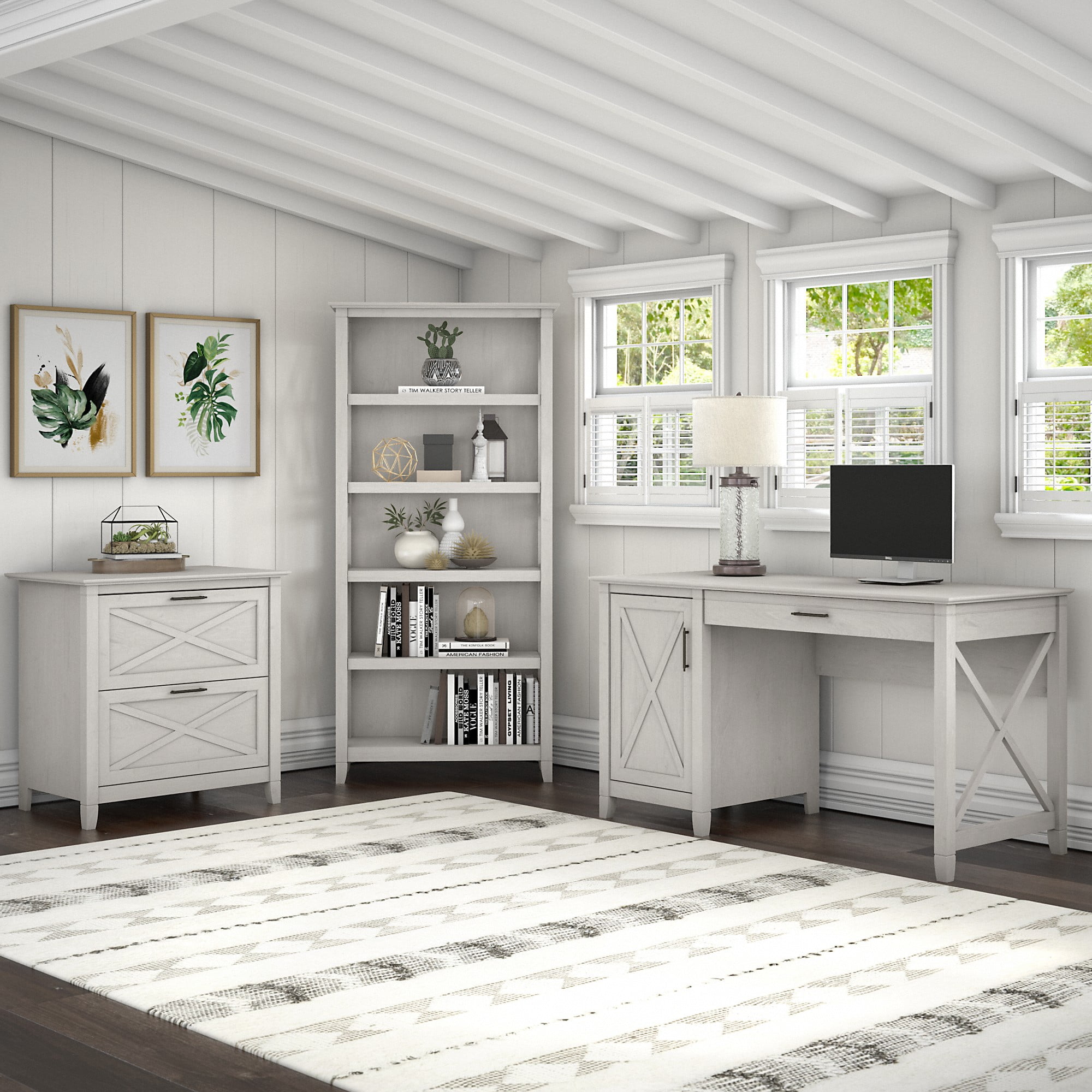 Designing your ideal home office is a breeze thanks to the Bush Furniture Key West Computer Desk with Storage. The 54W x 24D work surface offers plenty of room to spread out with a computer and paperwork as you surf the web, pay bills or check the mail. A pull out keyboard tray features a flip down front that folds up neatly when not in use. The drawer also provides a convenient place to keep your laptop or tablet and opens on smooth full-extension ball bearing slides. A built-in storage cabinet includes one adjustable shelf to accommodate reference materials and office supplies of various sizes. The sturdy and attractive post leg design allows the Computer Desk to support up to 200 pounds, so you can keep books and other equipment close by while you work. This home office desk is tested to meet ANSI/SOHO quality standards for safety and performance and is backed by a 1 Year Warranty. Features: Computer Desk’s durable 54W x 24D desktop provides plenty of room to spread out with materials Keyboard or laptop tray features a cut out hole for wires to pass through and a flip down front that folds up neatly when not in use Storage cabinet includes one adjustable shelf to accommodate a variety of work materials Work surface easily supports a computer, books and more with a 200 pound weight capacity Unique X pattern accents on the cabinet door and side panel give the office desk with storage a relaxed appearance Sturdy and attractive post leg design withstands years of use in a home office or living room Multiple finish options allow you to choose the perfect farmhouse style for any living space Surface accepts Desktop Organizers (sold separately) for convenient storage of paperwork and supplies Tested to meet ANSI/SOHO quality standards for safety and performance Backed by the Bush Furniture 1 Year Manufacturer’s Warranty Specifications: Product Dimensions: 54W Single Pedestal Desk: 54.02″W x 23.70″D x 30.00″H Product Weight: 98.8 lbs Assembly Required: Yes Product Color: Linen White Oak