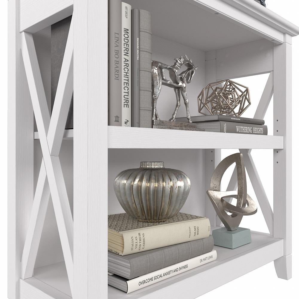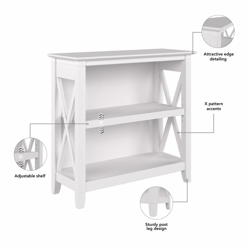 32W x 13D x 30H Small 2 Shelf Bookcase offers a convenient storage and display solution for virtually any work or living space Low bookcase has one adjustable shelf and one fixed shelf to accommodate items of various sizes Each shelf supports up to 35 pounds Thoughtfully designed for maximum stability and includes hardware to anchor the small bookshelf to a wall Height matches coordinating Key West Desks (sold separately) for an extended work surface when placed side by side Post leg design and unique X pattern accents convey a casual look that works well with cottage, coastal and modern farmhouse style Available in your choice of slightly distressed Washed Gray, Bing Cherry, Pure White Oak and Cape Cod Gray finish options Bush Furniture’s commitment to safety includes rigorous testing that meets or exceeds ANSI/SOHO standards Backed by a 1 Year Manufacturer’s Warranty See the full Key West Collection for coordinating items available, including storage, home office and bathroom furniture