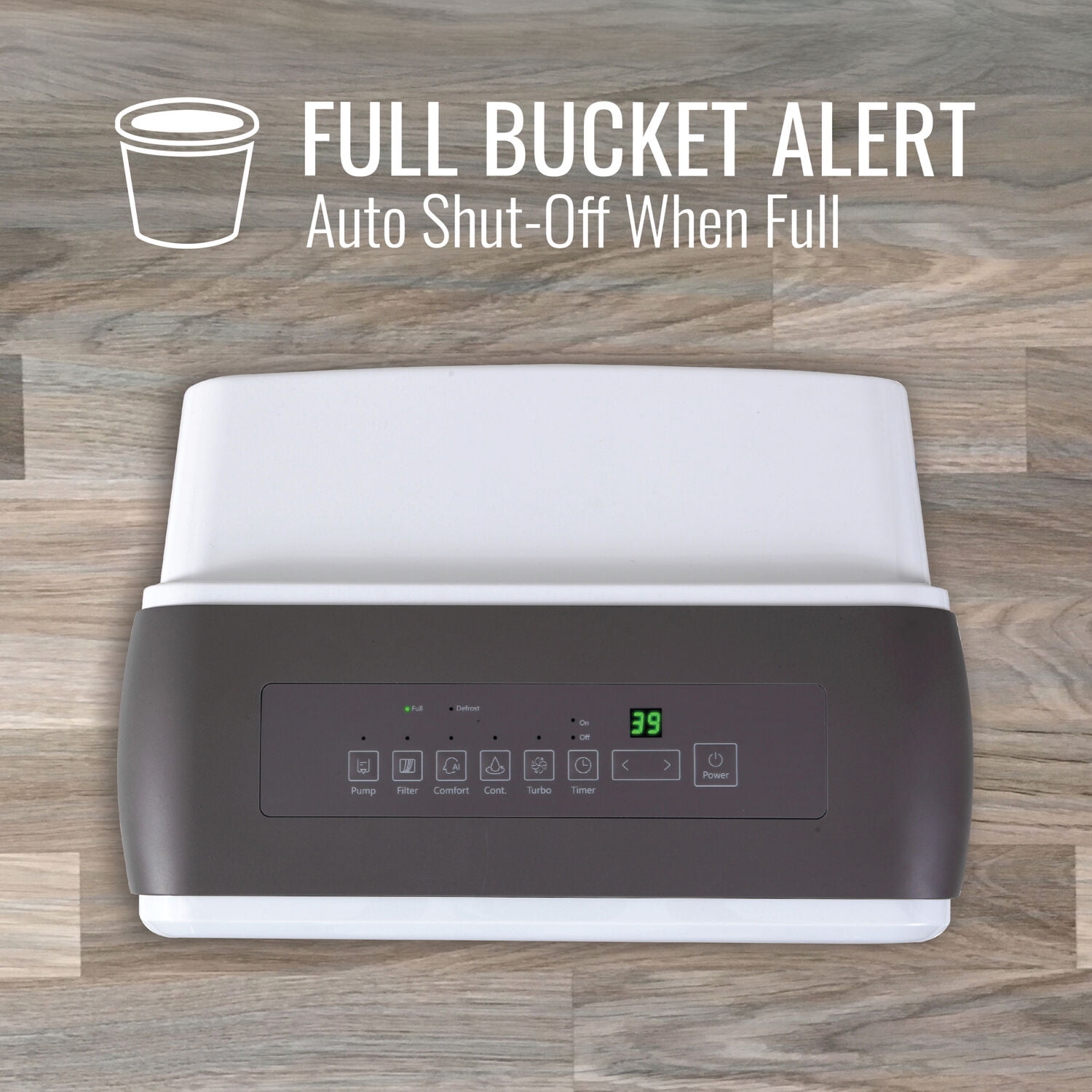 Removes up to 22 pints of moisture from the air per day Designed to dehumidify a room up to 1500 square feet Electronic controls with LED display and 24-hour timer Use in the attic, bedroom, basement, or bathroom of your home to control humidity Auto-restart saves your settings during a power outage Settings include Normal, Turbo and Auto-Defrost 0.8-gallon water tank with transparent water level indicator Convenient full bucket alert with automatic shut-off