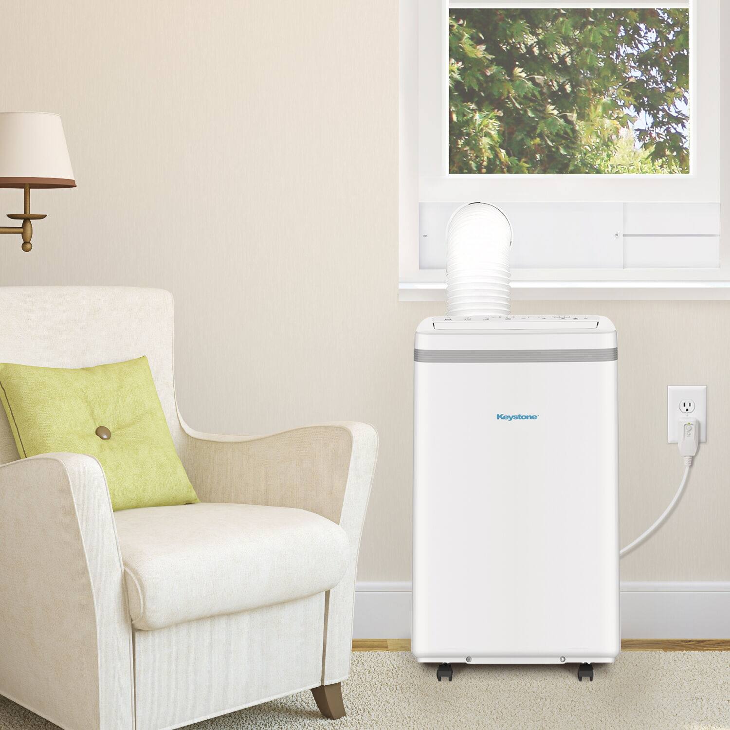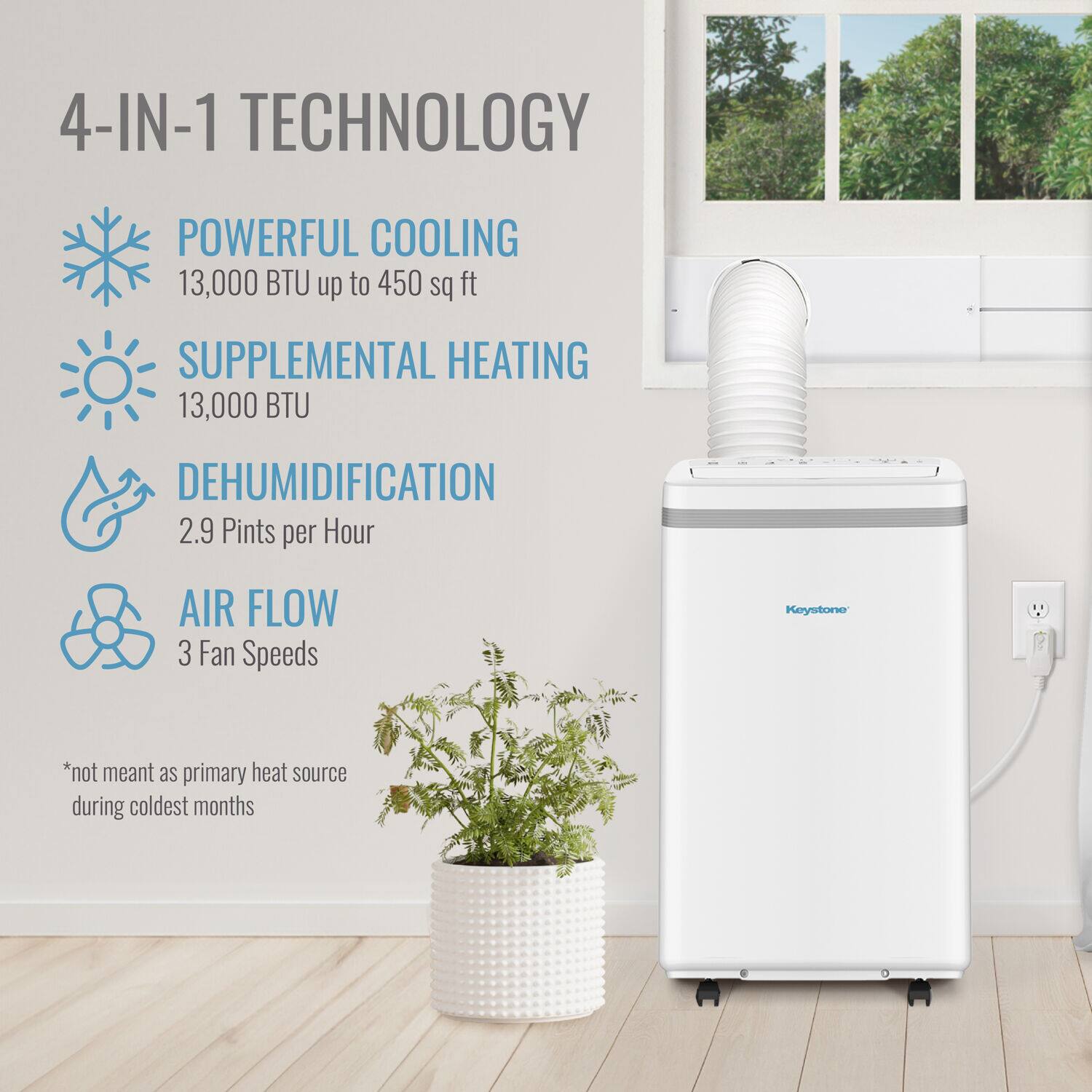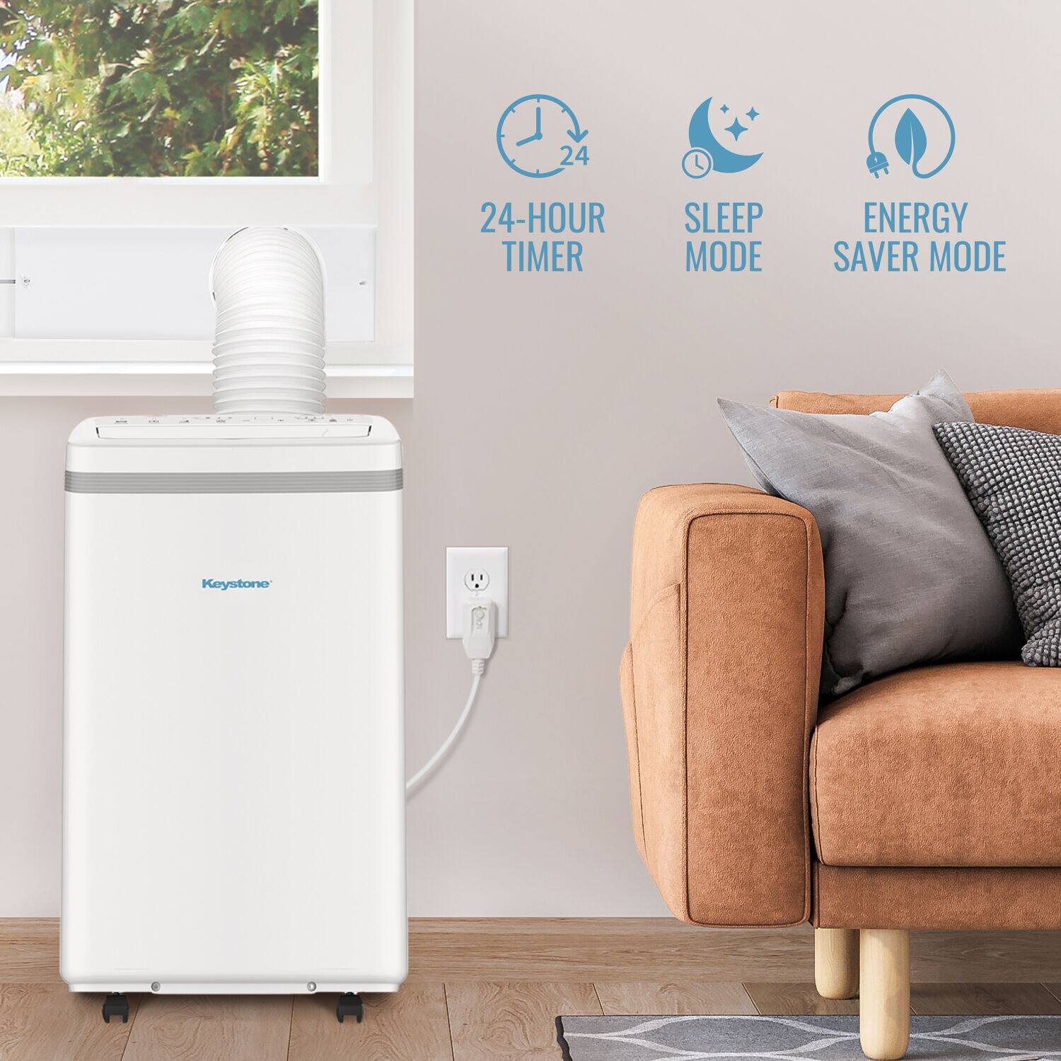 Stay cool and comfortable with Keystone’s top-rated portable AC unit. This windowless portable air conditioner boasts 13,000 BTU ASHRAE / 8,000 BTU DOE cooling power, perfect for spaces up to 450 square feet. Its dehumidification capability of 2.9 pints per hour ensures a cool and dry environment all day long. Plus, with 13,000 BTU ASHRAE / 8,000 BTU DOE of supplemental heating, this portable air conditioner is your go-to solution for both hot and cold days. Ideal for rooms such as apartments and bedrooms, this best portable air conditioner offers versatile cooling and heating options to keep you comfortable year-round. Easy to move with side handles and caster wheels, this portable AC unit also includes energy-saving features like an energy saver mode and a programmable 24-hour timer. Control your comfort from anywhere with the included remote. Trust Keystone for quality and affordability, backed by a 1-year warranty.