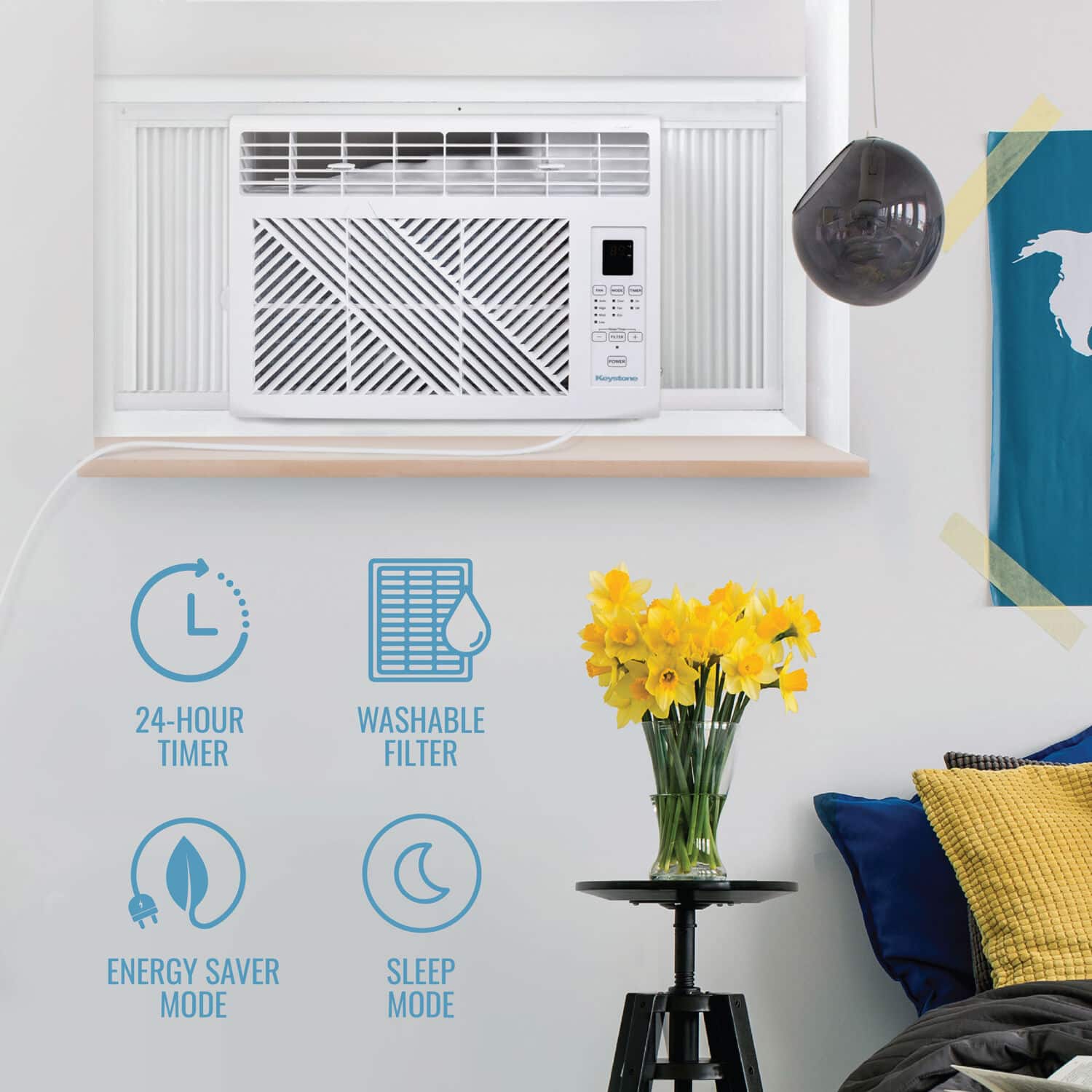 With reliable air conditioning units, Keystone produces consistent cooling to keep you comfortable, even on the hottest days. This 6,000 BTU window-mounted air conditioner can effectively cool rooms up to 250 square feet with dehumidification up to 1.4 pints per hour to remove moisture from the air. Perfect for small-sized living spaces like apartments, bedrooms, and much more. A remote is included so you can control your cooling from across the room. Money saving features include energy saver mode, sleep mode, and a programmable 24-hour timer. You’ll know when it’s time to easily remove and clean the mesh filter with the Check Filter alert. Keystone not only provides a 1-year warranty but ensures that you stay cool and comfortable at a cost-conscious price.