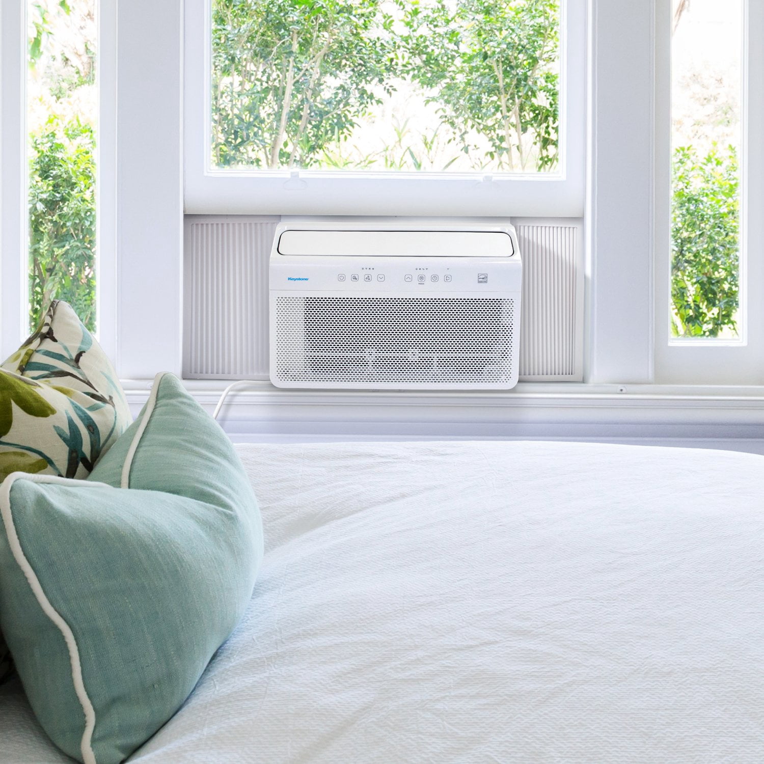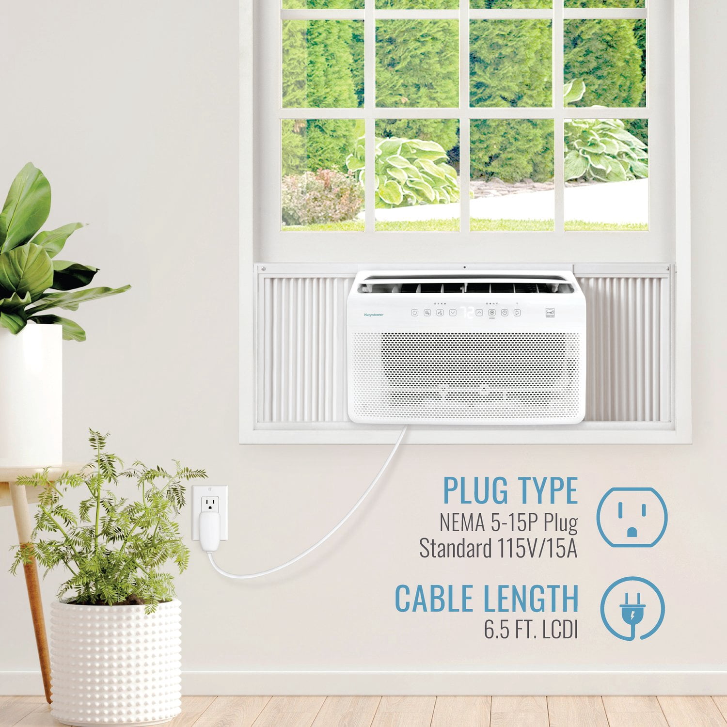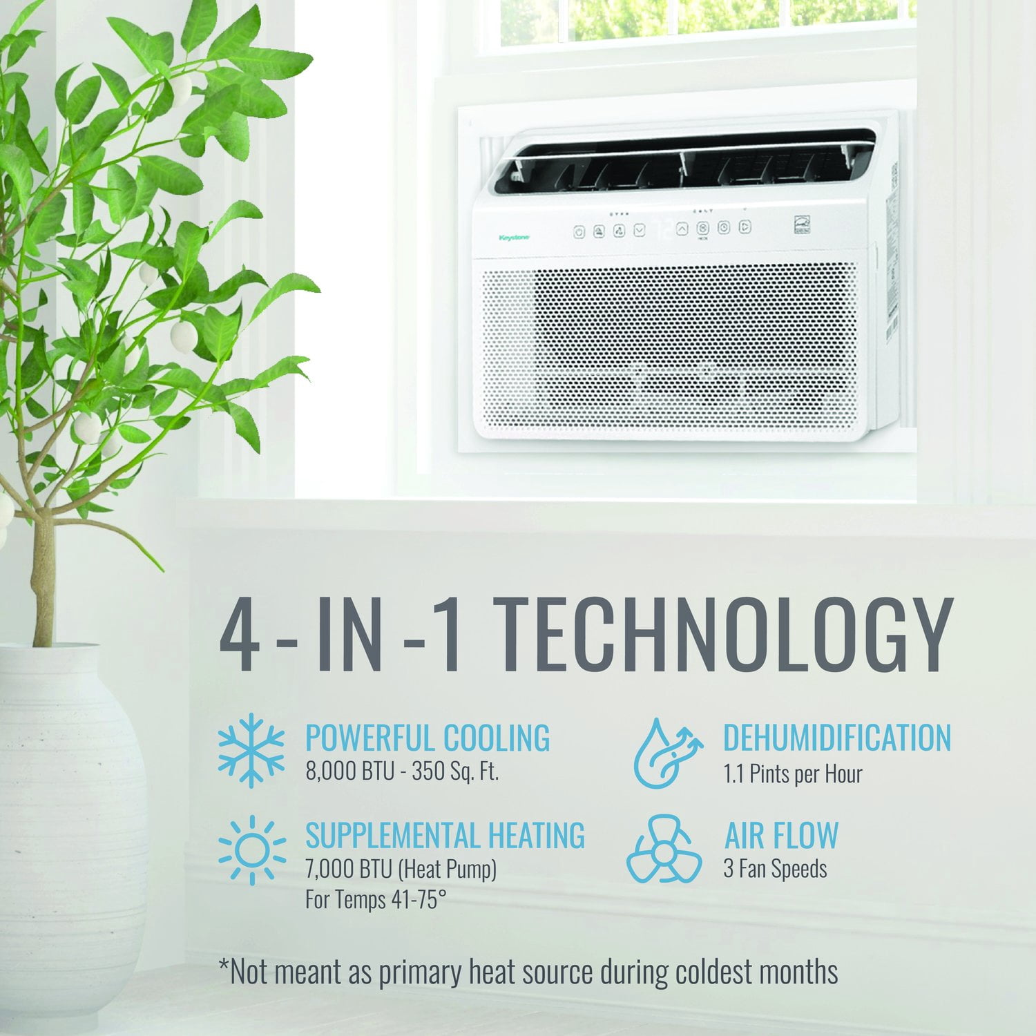 Keystone 8,000 BTU 350 Sq. ft. Window Mounted Inverter Air Conditioner with 7,000 BTU Supplemental Heat , KSTAW08INV-HC Features inverter technology for energy efficiency Dehumidifies up to 1.1 pints per hour 3 fan speeds 6.5-ft. power cord with LCDI plug using standard 115V electrical outlet located on front left-facing side