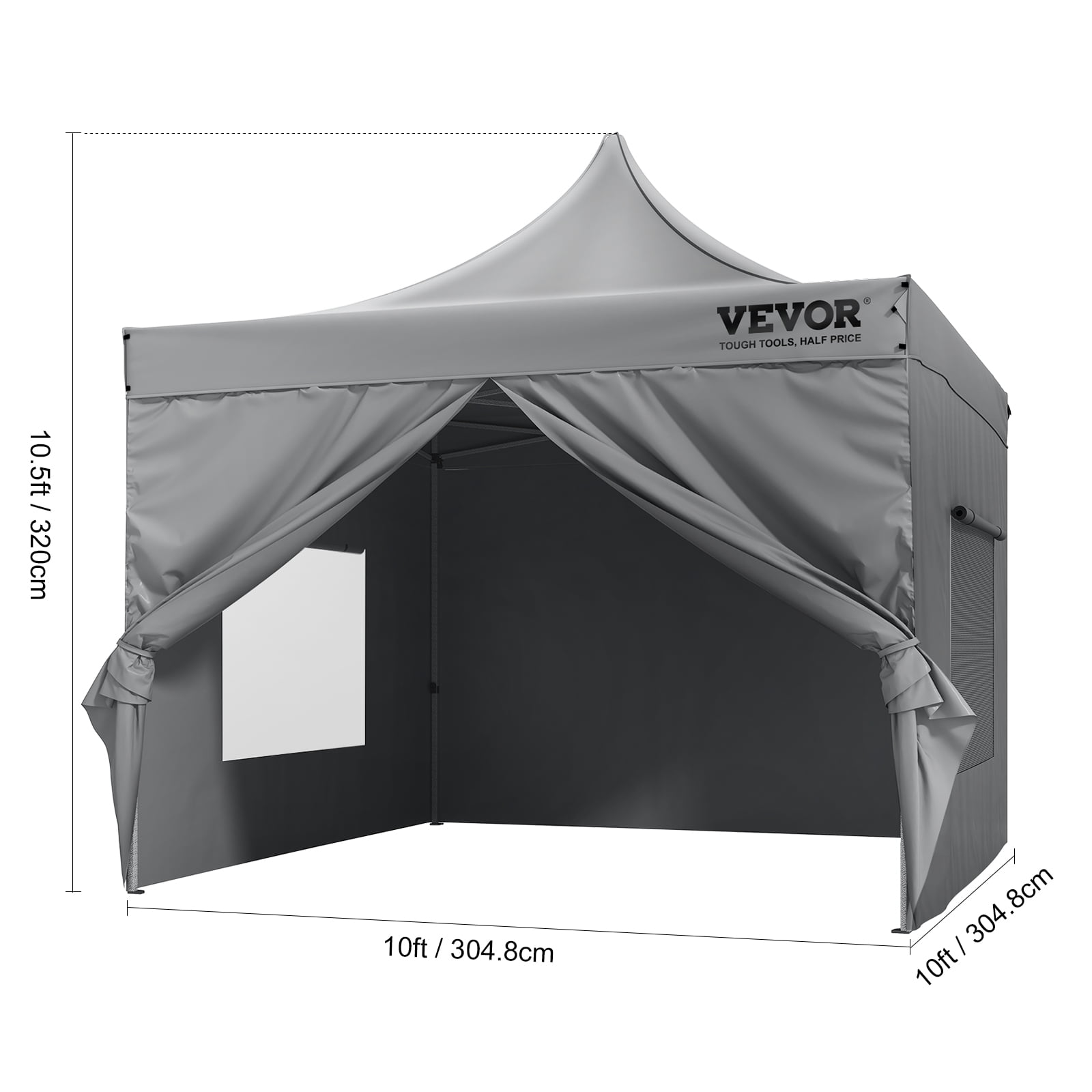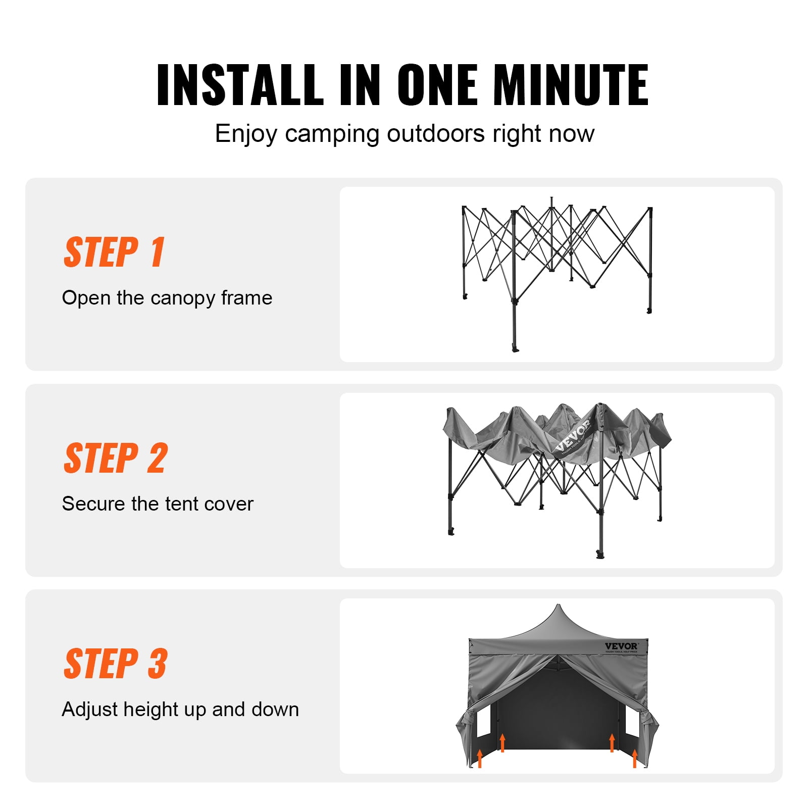 Extra Large Pop up Canopy: This 10×10 pop up canopy tent can be assembled in one minute, providing a temporary gathering place of 100 square feet. With three adjustable heights and a maximum internal height of over 9 ft, it offers a spacious standing room. This canopy with sidewalls comfortably accommodates 6-8 people, providing sun shade for a comfortable gathering. High-Performance Canopy Fabric: The all-season gazebo cover has been upgraded to 500D PU-coated silver fabric, providing UPF 50+ UV protection and CPAI-84 rated flame-retardant protection. The top cover features added edging, while waterproof stickers on all sides allow rainwater to slide off instantly, preventing accumulation or leaks. Enjoy immersive gatherings even in rainy weather. Seamless Velcro Connection: The detachable sidewalls are connected by seamless velcros, convenient and quick to assemble or disassemble. You can easily remove or install sidewalls, providing a well-ventilated space on hot summer days, or building a stable temporary shelter on windy or rainy days. Take it Anywhere: Easily carry and store this gazebo tent with its storage bag on wheels. The storage size is only 63.4 x 9.8 x 9.8 inches, fitting most vehicle trunks. The specialized accessory bag can hold 8 medium-sized ground nails and 4 ropes, ensuring that accessories are neatly stored and not easily lost. Quick and Easy Assembly: Setting up this outdoor shade canopy is a breeze: simply take the assembled frame out of the bag, open it, place the canopy cover, and extend the legs. Not only serves as a camping tent or patio canopy, but our instant pop up tents are also ideal for outdoor activities, such as backyard party, picnics, parking your car, setting up a stall, and enjoying a barbecue.
