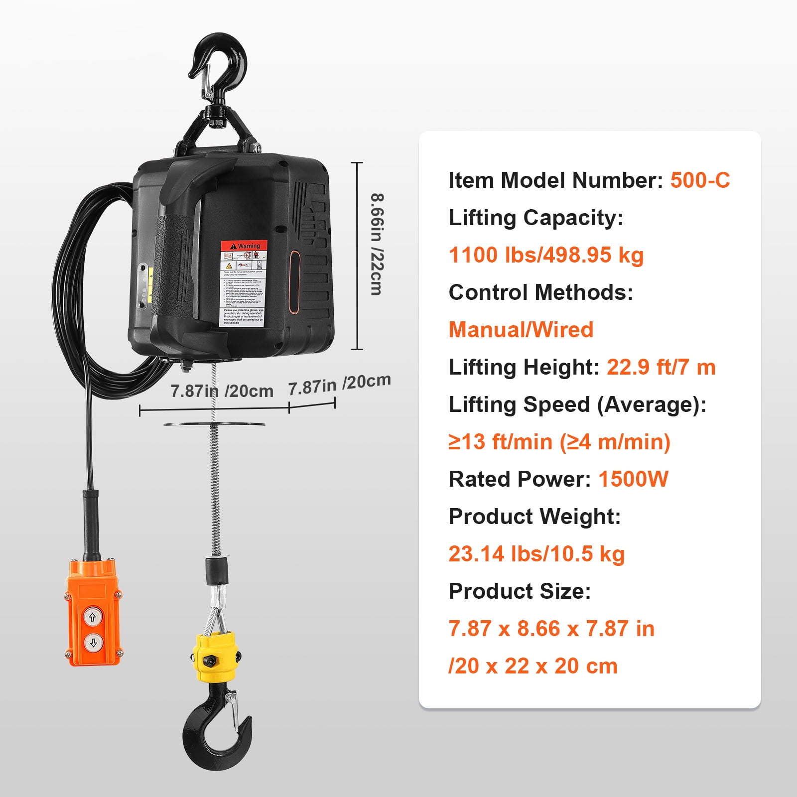 KFFKFF 1100 lbs Capacity Electric Hoist and Winch Combo, 1500W, 22.9 ft Max Lift, 13 ft/min, Includes Wired Remote for Easy Operation in Garages, Warehouses, and Factories