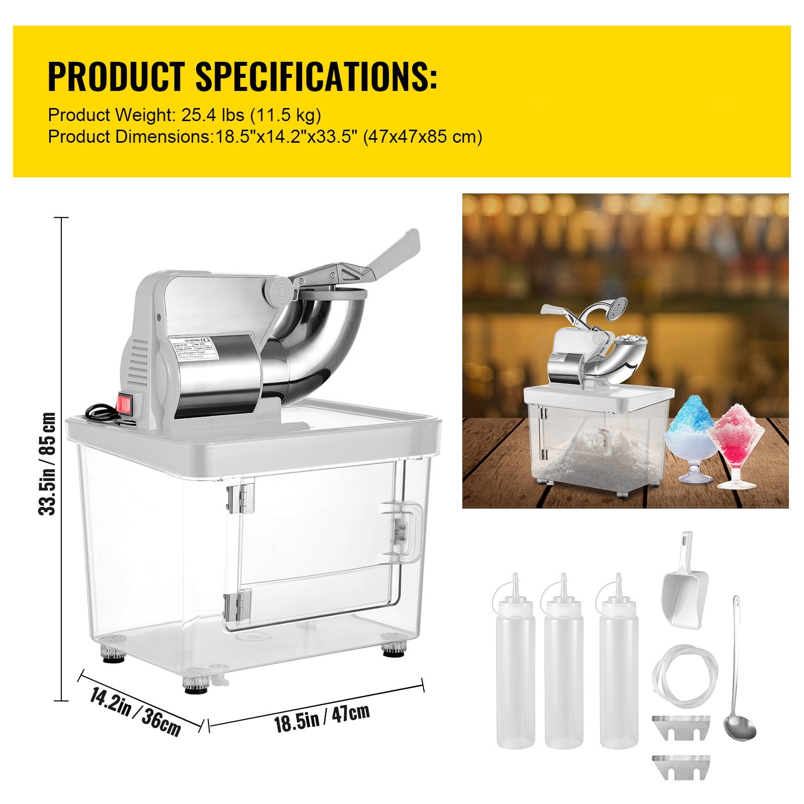 Product Description Commercial Snow Cone Machine Our electric ice shaver features an eyes-pleasing appearance and powerful performance. With the built-in 300W copper motor, it can crush 396.8 lbs (180 kg) of ice each hour, providing you with soft, fluffy, and powdery snow ice and meeting your demands in a relatively short time. Considerate design details and accessories are also integrated, such as the integrated storage box, wide ice inlet, ergonomic handle, waterproof switch, non-skid feet, etc. It is perfect for restaurants, canteens, bars, caf?s, snack stands, etc. Efficient Dual Blades Our snow cone machine features dual stainless-steel blades that are sharp and durable, providing double the shaving efficiency. Crushed ice capacity can reach 396.8 pounds (180 kilograms) per hour. Also comes with an extra set of blades for replacement. Extensive Ice Barrel This snow cone maker features a wide ice inlet bucket with a diameter of 4.3 inches (11 cm). You can put in small ice cubes or large ice cubes. The more ice you load each time, the more crushed ice you get. The lattice design lid increases the contact area and avoids splashing. 300W Copper Motor Our electric twin-blade ice crusher features a powerful 300W copper motor that spins at 1450 rpm, giving you high shaved ice output per hour and low noise. Its crushing capacity can meet your needs for shaved ice in a short period of time during peak passenger flow. Well-Built Construction Our machines are ETL certified. All parts in contact with ice are made of food-grade stainless steel and are easy to clean. An extra-large storage box integrated below measures 18.5 in. Effortless Operation The anti-slip handle with ergonomic arc design ensures effortless operation. The switch is covered with a waterproof protective layer, making it safe to operate even with wet hands. User-Friendly Details The door handle makes it easy to open and remove the shaved ice. The water outlet below is used to drain melted ice in time. Anti-slip feet will keep the machine stable during work. Specifications Model: BY-300XTD Color: White Material: Stainless Steel + PC + Silicone Voltage: 110V / 60Hz Rated Power: 300 W Rotating Speed: 1450 r/min Ice Crushing Capacity: 396.8 lbs/h (180 kg/h) Ice Storage Capacity: 9 Gal (34 L) Overall Dimensions: 18.5″x14.2″x33.5″ / 470x360x850 mm Case Dimensions: 18.5″x14.2″x14.2″ / 470x360x360 mm Case Door Size: 11″x8.4″ / 277×213 mm Case Top Thickness: 5 mm Case Wall Thickness: 4 mm Diameter of Ice Inlet: 4.3″ / 110 mm Water Pipe Length: 19.7″ / 500 mm Power Cord Length: 50.4″ / 1280 mm Product Weight: 25.4 lbs / 11.5 kg Package Content 1 x Snow Cone Machine 1 x Extra Set of Blades 1 x Ice Scoop 1 x Stainless-Steel Spoon (60 mm) 3 x Sauce Bottles (700 ml) 1 x Water Pipe