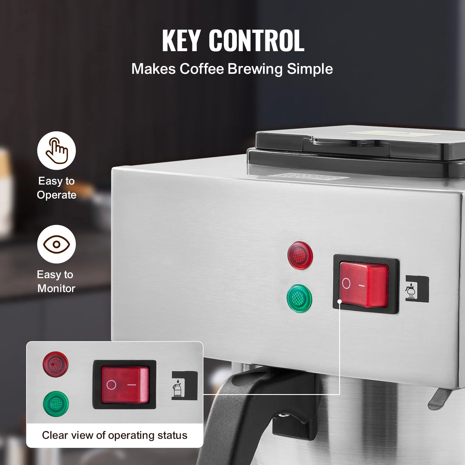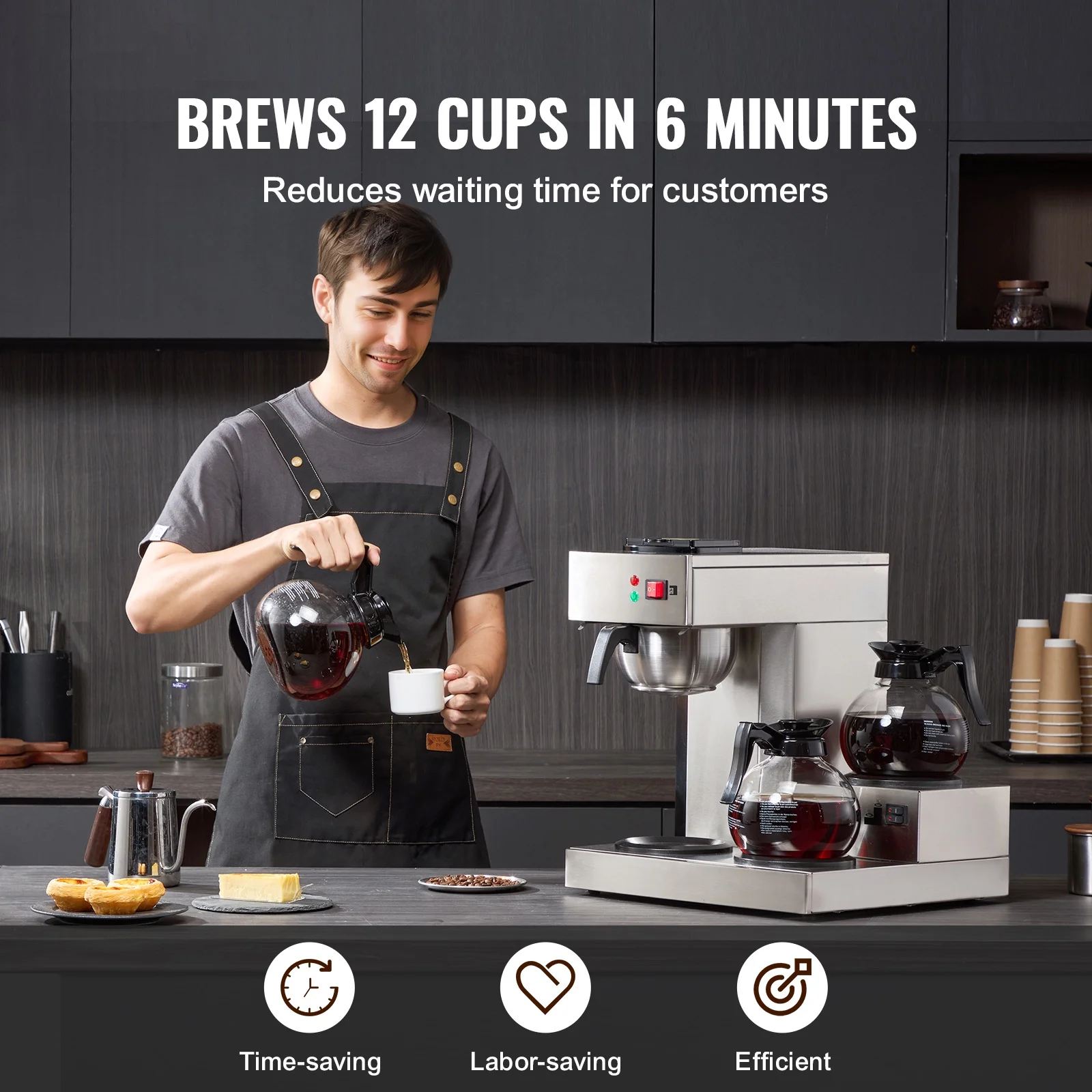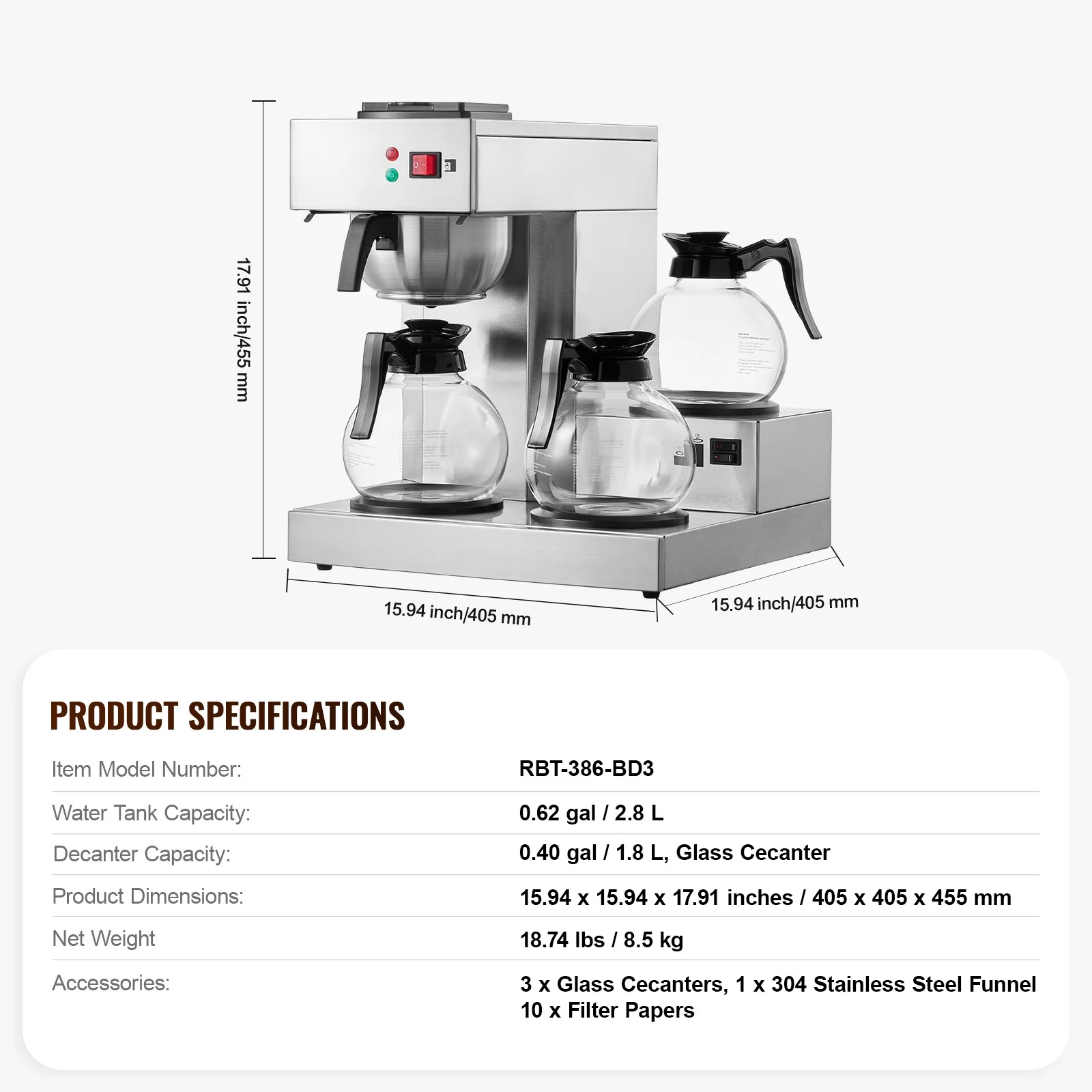 Product Description 12-Cup Commercial Drip Coffee Maker Brewing an entire pot of coffee in less than 10 minutes, this commercial drip coffee maker is designed to meet the coffee demands of a group of 12-13 individuals simultaneously. Say goodbye to waiting in long queues and enjoy your coffee hassle-free! Efficient Coffee Brewing With the ability to brew a full pot of coffee in less than 10 minutes, this commercial drip coffee maker is designed to meet the coffee demands of 12-13 people simultaneously. Say goodbye to long queues and enjoy a hassle-free coffee experience! Long-Lasting Keep Warm Featuring dual warming plates, this commercial coffee machine ensures that 3 glass carafes stay warm throughout the brewing process, guaranteeing you always have access to hot coffee whenever you need it. User-Friendly Operation Simplicity is key with this coffee maker. Its straightforward mechanical buttons and indicator lights make it incredibly easy to use, even for first-time users. Brewing delicious coffee has never been easier! Easy to Clean and Maintain Cleaning and maintaining this coffee maker is a breeze, thanks to its stainless steel body and removable stainless steel funnel. The funnel is made from food-grade 304 material, ensuring both safety and durability. Versatile for Various Settings Whether you’re in a café, office, restaurant, or at home, this drip coffee maker is the perfect fit. Its size and performance make it suitable for a variety of locations, catering to your coffee needs wherever you are. Adjustable Strength Customize your coffee to perfection with this coffee maker. By adjusting the amount of coffee grounds used, you can easily achieve different strengths of coffee. The use of filter paper ensures a clear and smooth coffee without any impurities. Specifications Item Model Number: RBT-386-BD3 Water Tank Capacity: 0.62 gal / 2.8 L Carafe Capacity: 0.40 gal / 1.8 L, Glass Carafe Product Dimensions: 15.94 x 15.94 x 17.91 inches / 405 x 405 x 455 mm Net Weight: 18.74 lbs / 8.5 kg Package Content 1 x Commercial Drip Coffee Maker 2 x Glass Carafe 1 x 304 Stainless Steel Funnel 10 x Filter Paper 1 x Power Cord