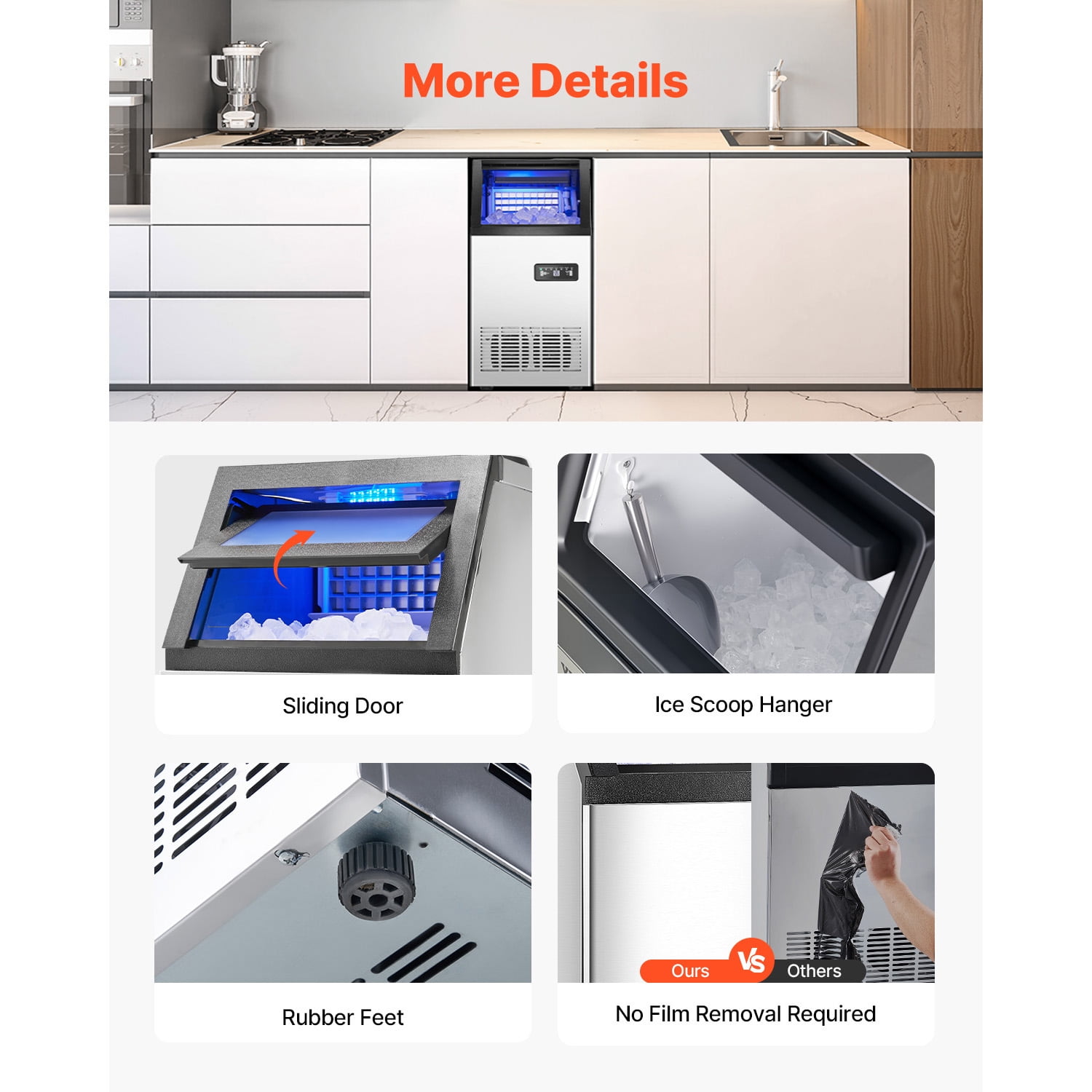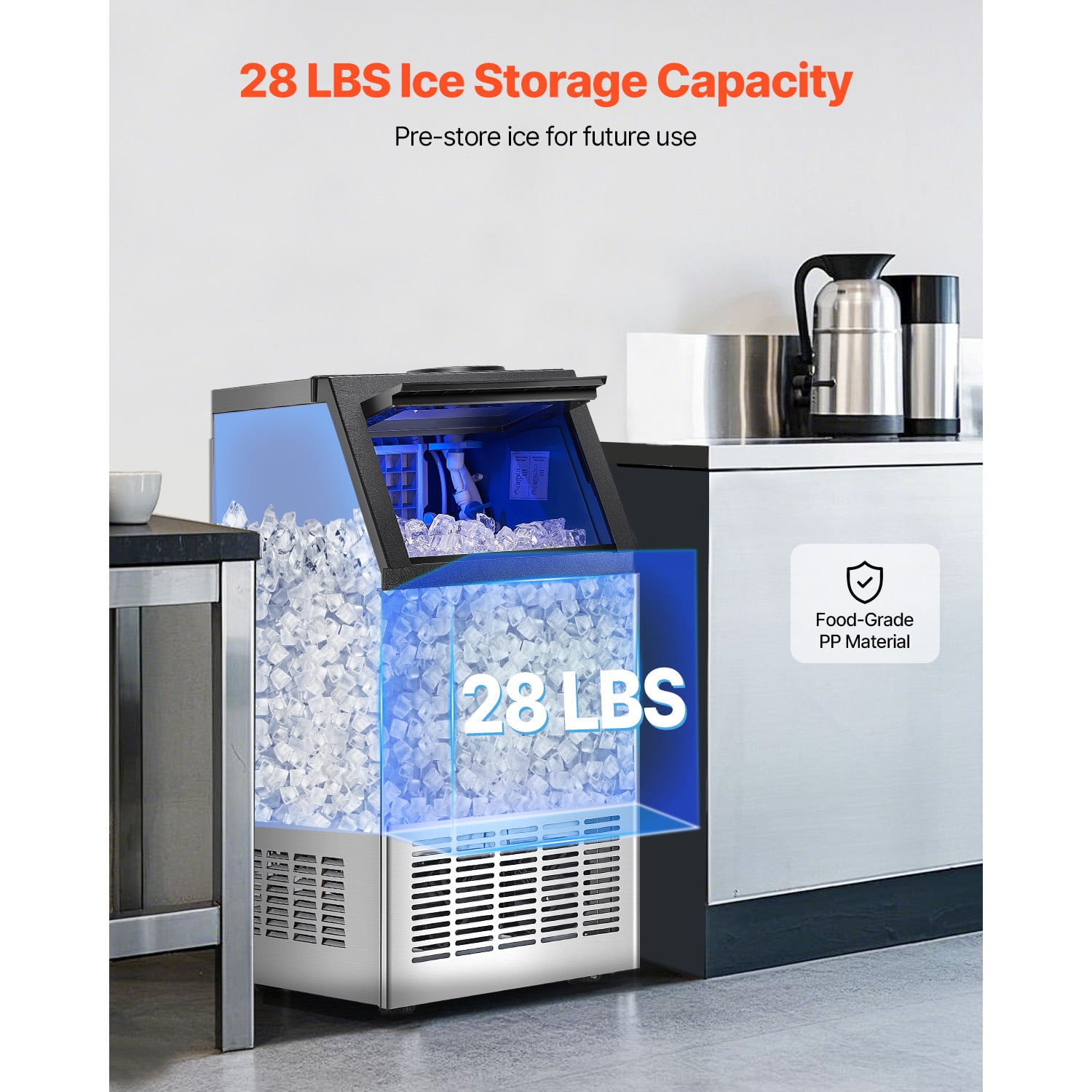 Product Description KFFKFF Ice Maker Machine Introducing our KFFKFF Ice Maker Machine, designed to meet all your commercial ice needs. This efficient machine produces a large quantity of ice cubes, ensuring you never run out. With its spacious ice storage capacity, you can have ice readily available for up to 8 hours. Whether it’s for your home, coffee shop, bar, beverage store, or restaurant, this compact ice maker is the perfect addition to your space. Say goodbye to the hassle of constantly refilling water, as this machine offers 2 convenient ways to add water. Additionally, the auto cleaning feature ensures easy maintenance. The smart control panel allows for effortless operation, making it user-friendly. Enjoy the benefits of efficient and quiet ice production with our KFFKFF Ice Maker Machine. Ice Scoop Hanger Made from high-quality SUS304 stainless steel, the KFFKFF ice scoop has a maximum scooping capacity of 8oz. It is designed with a convenient hanger, allowing you to easily hang it in your ice maker for quick and easy access. 36 PCS Ice Trays Crafted from durable nickel-plated copper material, the KFFKFF ice trays ensure even and fast ice making. With 36 individual compartments, you can make a large quantity of ice in one go, perfect for parties and gatherings. Gravity Drainage Experience quick and efficient drainage with the KFFKFF ice maker. Its gravity drainage system prevents water accumulation, ensuring a clean and hassle-free operation. Say goodbye to the inconvenience of manual draining. Easy Installation Installing the KFFKFF commercial ice maker is a breeze. It features a one-piece cyclopentane foam and a high-quality shell that effectively isolates external heat. With its user-friendly design, you can have it up and running in no time. Low Noise Enjoy a peaceful environment with the KFFKFF ice maker. Operating at a noise level of ≤65dB, it creates a comfortable atmosphere without causing any disturbance. Say goodbye to noisy ice makers that disrupt your tranquility. Compact Structure The KFFKFF light commercial ice maker is designed with a compact structure, making it perfect for spaces with limited room. Whether you want to embed it in a cabinet or place it on a countertop, it will fit seamlessly into your space without taking up too much room. Specifications Item Model Number: SKF-B80FT Number of Ice Trays: 36 PCS Ice Storage Capacity: 28 lbs Max Ice Making Capacity: 120 lbs / 24 H Noise Level: ≤65dB Main Materials: Stainless Steel + PP Product Net Weight: 20.6 kg / 45.4 lbs Product Dimensions: 360 x 430 x 755mm / 14.2 x 16.9 x 29.7 in Package Content 1 x Commercial Ice Maker 1 x User Manual 1 x Drain Pipe 1 x Ice Scoop (304 Stainless Steel) 2 x Zip Ties 1 x Clamp 2 x Seal Rings 2 x Buckles 1 x Rubber Plug 2 x Water Inlet Pipes
