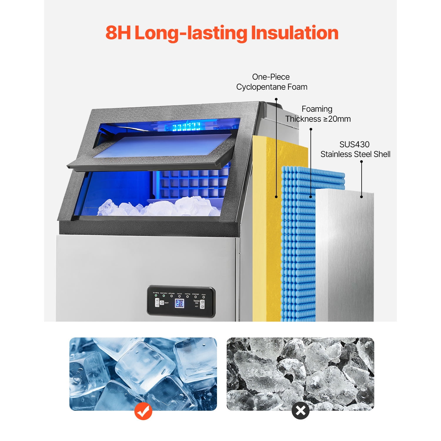 KFFKFF Commercial Ice Maker: This high-quality ice maker machine is designed with 36 pcs ice trays and has a daily ice production capacity of up to 120 lbs (test conditions: 50-100.4℉/10-38℃ ambient temperature). It is perfect for use in your home, coffee shop, bar, restaurant, and more. Two Convenient Water Inlets & Easy Cleaning: The KFFKFF ice maker has two water inlets, allowing you to connect it directly to the tap or use bottled water. It also features an auto self-cleaning function for a hygienic ice-making environment. Advanced Insulation Technology: Our KFFKFF commercial ice maker is equipped with a thick ≥20mm cyclopentane insulation material and a high-quality shell, effectively isolating external heat. Your ice cubes will stay frosty for 6-8 hours, even when the machine is not in use. Efficient and Quiet Ice Production: With a powerful compressor, the KFFKFF ice maker can produce ice cubes in just 12-15 minutes (depending on the desired thickness). It operates quietly, ensuring a peaceful environment. User-Friendly Control Panel: The KFFKFF commercial ice maker features an LED digital display and easy-to-use mechanical buttons, allowing you to have precise control over the ice-making process. Adjust the ice thickness effortlessly and monitor the status of the ice maker in real-time with the indicator light on the panel.