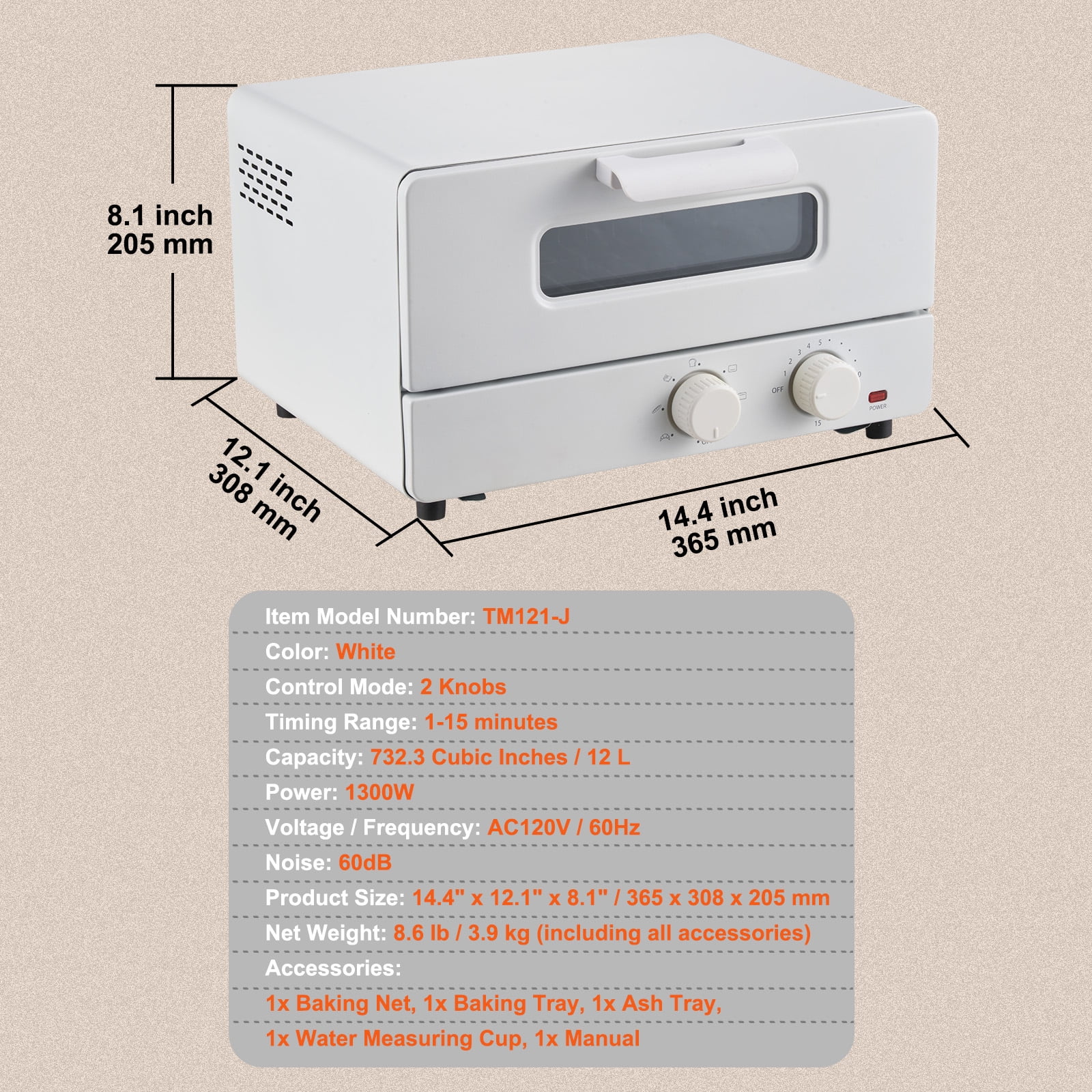 Product Description 12L Steam Oven KFFKFF Steam Oven has a built-in steam unit that adds steam to normal baking, locking in the internal moisture of the food and enhancing the taste of the food, making even overnight bread soft and crunchy again, making it the choice of sophisticated people who are looking for the ultimate in taste. 12L Large Capacity With a footprint smaller than a 14-inch laptop, it fits anywhere in the kitchen, yet holds 6 inches of pizza, 2 slices of thick toast, or 6 tarts, making a sophisticated breakfast or afternoon tea a breeze. 1300W High Power Preferred quartz heating tube, 1300W high power, fast and even heating, reduce waiting time. Simple and precise 7-speed mode adjustment for steam baking and pure baking. 2-Step Simple Cleaning The inner liner and baking pan are coated with high quality zinc and aluminum respectively, which is not easy to stick and can be cleaned by gently wiping. Exquisite Details Linkage grill design and door handle, you can open the door to take out the delicious food, and at the same time, it can also prevent scalding; Side filling operation is more convenient; Rapid heat dissipation through the side cooling holes; When the mode knob is in the “off” position, it will not turn on the machine, preventing children from accidentally turning on the machine by adjusting the time knob. Steam Technology KFFKFF’s Steam Oven has a built-in steam unit that adds steam to normal baking, locking in the moisture inside the food and enhancing its flavor. Wide Applications The smooth lines and clean design are suitable for living rooms, wood shelves, kitchens and table tops, and can be paired with a variety of styles of decor. Specifications Item Model Number: TM121-J Color: White Control Mode: 2 Knobs Timing Range: 1-15 minutes Capacity: 732.3 Cubic Inches / 12 L Exterior Material: White Powder Coating Inner Liner Material: Galvanized Sheet Baking Tray Material: Aluminum Plating Power: 1300W Voltage / Frequency: AC120V / 60Hz Noise: 60dB Product Size: 14.4″ x 12.1″ x 8.1″ / 365 x 308 x 205 mm Net Weight: 8.6 lb / 3.9 kg Package Content 1 x Steam Oven 1x Baking Net 1x Baking Tray 1x Ash Tray 1x Water Measuring Cup 1x Manual