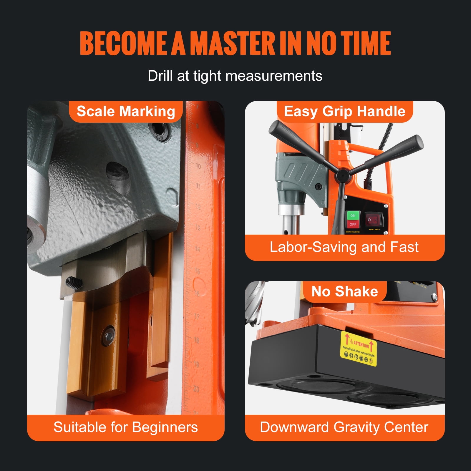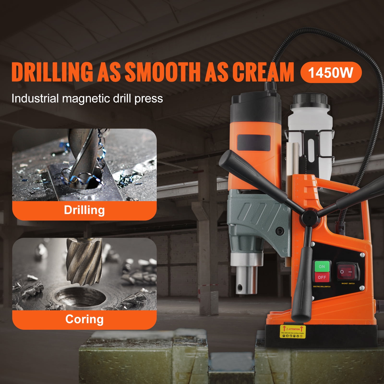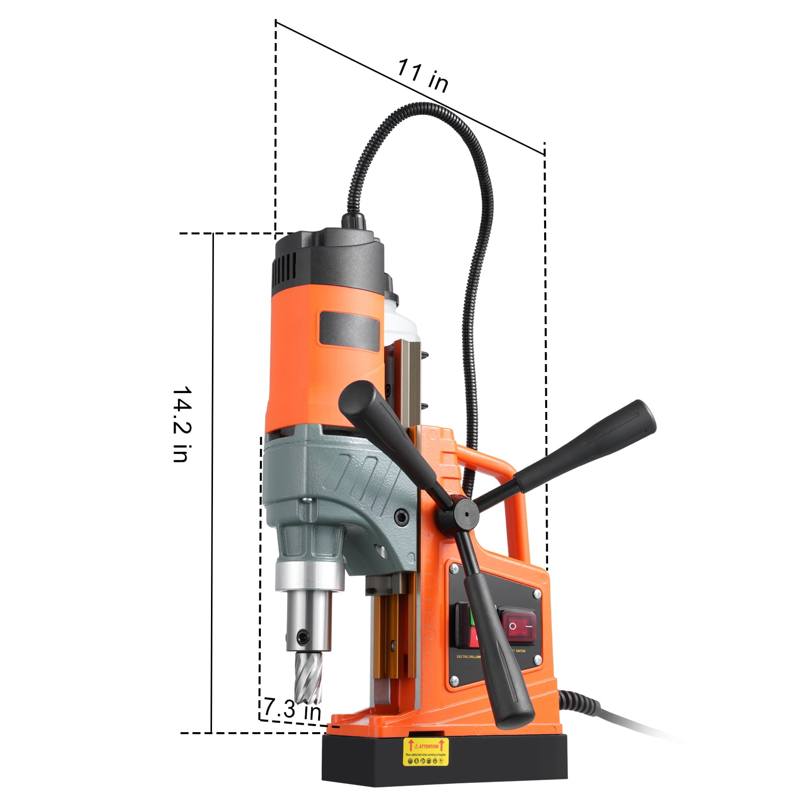 Product Description 1450W electromagnetic drilling machine With a clamping force of 12500N, our magnetic drill can be securely anchored to any steel surface for precise positioning and burr free drilling. Includes 11 drill bits for more drilling requirements. The drill machine is made of high-quality titanium magnesium alloy and is an essential tool for home assembly, heavy industry and steel manufacturing. 12500N magnetic force The powerful two-stage magnet produces a holding force of 12,500 N, which keeps the drill press from moving during operation. Thanks to its electromagnet base, our magnetic drilling machines can be firmly fixed during use due to their strong iron base. Perfect performance This magnetic seat drill is designed for precise and demanding coring and has a motor power of 1450 watts. The maximum. Core diameter: 1.57 inches /40 mm; The maximum. Travel distance: 8.66 inches /220 mm. High efficiency cooling system The portable drill press has a removable integrated cooling system that helps significantly extend the life expectancy of the drill bit and milling cutter. In addition, dust proof air intakes and vents reduce temperatures. Durable body and powerful engine Our drill machines drill fast holes for clean cuts. The magnetic drill has a drilling depth of 50 mm, which makes drilling very easy when you need to drill through thick metal. Consider the details An ergonomic handle, three extended crank handles with a non-slip rubber coating and an external carbon brush make it easy to operate the magnetic drill. versatile Our magnetic base drill is used in steel structure, shipbuilding, bridge construction, wind power generation, drilling, electric power construction and many other fields. Specifications Max. Boring Diameter(Coring Drill): 1.57 in / 40 mm Max. Boring Depth: 2 in / 50 mm Max. Boring Diameter(Twist Drill): 0.63 in /16 mm Max. Boring Depth (Twist Drill): 3.9 in / 100 mm Max. Travel Distance: 8.66 in / 220 mm Magnetic Force: 12500 N Stepless Speed: 850 rpm Package Content 1 x Drill Chuck Key 1 x Drill Chuck 1 x Coolant Tank & Stand 1 x Coolant Tube 1 x Rope 1 x Thimble 3 x Hex Wrenches 1 x Quarter Crank 11 x Coring Bits 3 x Hand Cranks 1 x User Manual