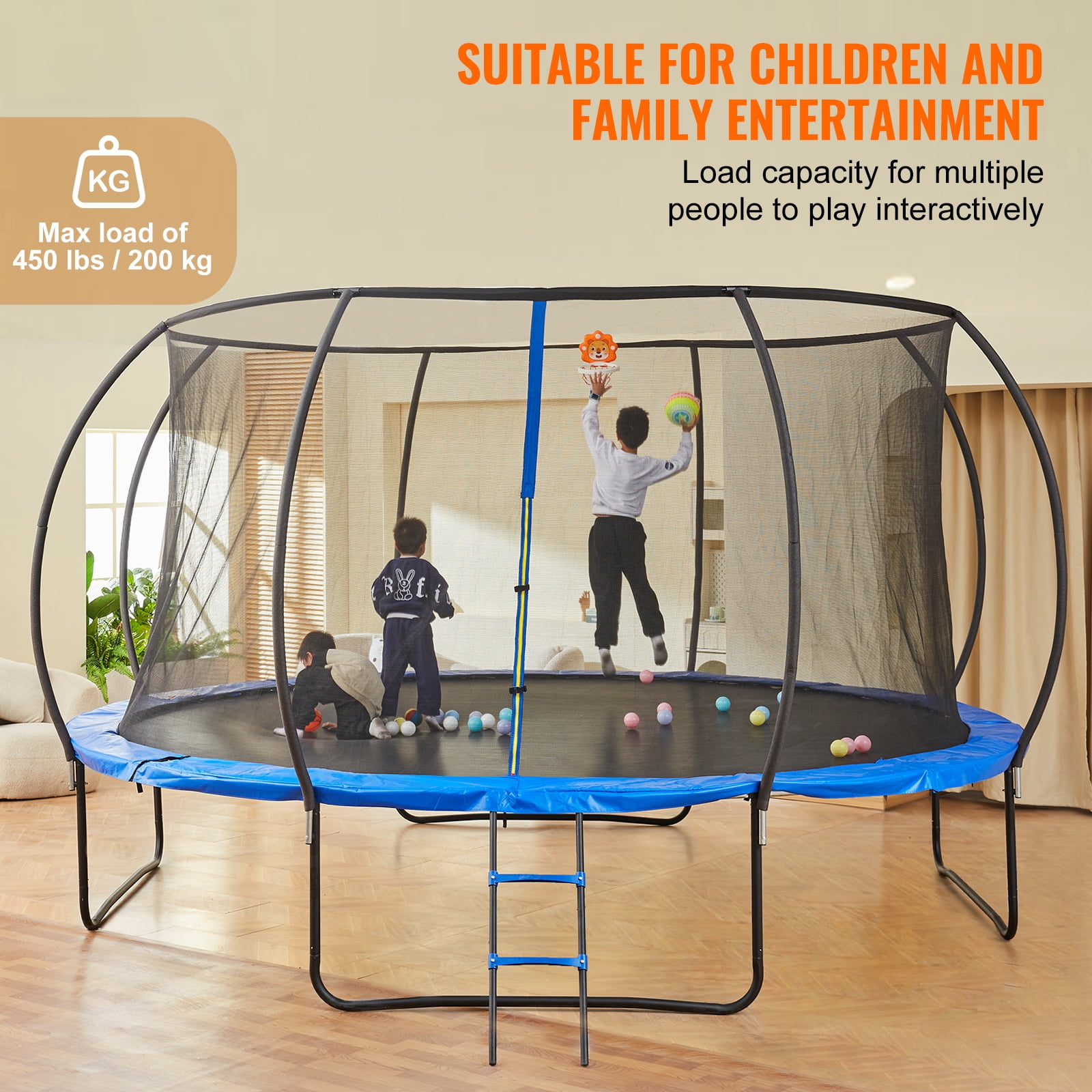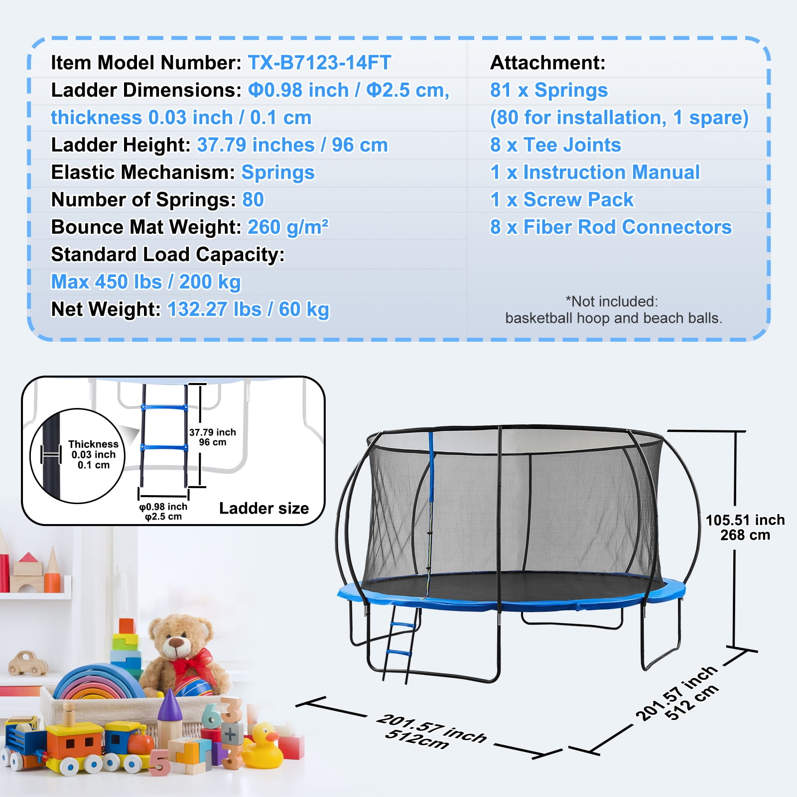 Product Description KFFKFF Trampoline for Entertainment Experience the ultimate joy and excitement with our KFFKFF Trampoline. It offers a safe and fun-filled environment for children to unleash their energy and enjoy endless hours of playtime. Let them embark on an adventure of bouncing and laughter, creating unforgettable memories. KFFKFF Trampoline for Entertainment Create a delightful and engaging play space for children with the KFFKFF Trampoline. Let them experience the joy and excitement of bouncing freely in their own private entertainment kingdom. Safety First Ensure the safety of your children with the KFFKFF Trampoline’s 360° safety net protection, collision-proof bumpers, and thickened shock-absorbing safety pads. These features provide comprehensive protection, minimizing the risk of injuries. Unmatched Stability Experience unparalleled stability with the KFFKFF Trampoline. Its upgraded thickened leg tubes and strong ring leg design offer exceptional sturdiness and durability. This trampoline is built to withstand heavy use and resist bending over time. Endless Possibilities Unlock a world of possibilities with the KFFKFF Trampoline. In addition to regular jumping activities, it can be customized with various sports equipment like basketball hoops and swings, catering to children’s diverse interests and enhancing the overall playability. Effortless Installation Setting up the KFFKFF Trampoline is a breeze. The included installation manual provides clear instructions on assembling the trampoline, eliminating the need for extra tools. Enjoy a hassle-free installation process that is quick and simple. Versatile Usage Whether indoors or outdoors, the KFFKFF Trampoline with its anti-rust coating can be placed anywhere you desire. Embrace the joy of jumping anytime and anywhere, without limitations. Specifications Item Model Number: TX-B7123-14FT Ladder Dimensions: Φ0.98 inch / Φ2.5 cm, thickness 0.03 inch / 0.1 cm Ladder Height: 37.79 inches / 96 cm Elastic Mechanism: Springs Number of Springs: 80 Bounce Mat Weight: 260 g/m² Standard Load Capacity: Max 450 lbs / 200 kg Net Weight: 132.27 lbs / 60 kg Package Content 1 x Trampoline 1 x Instruction Manual 1 x Set of Accessories