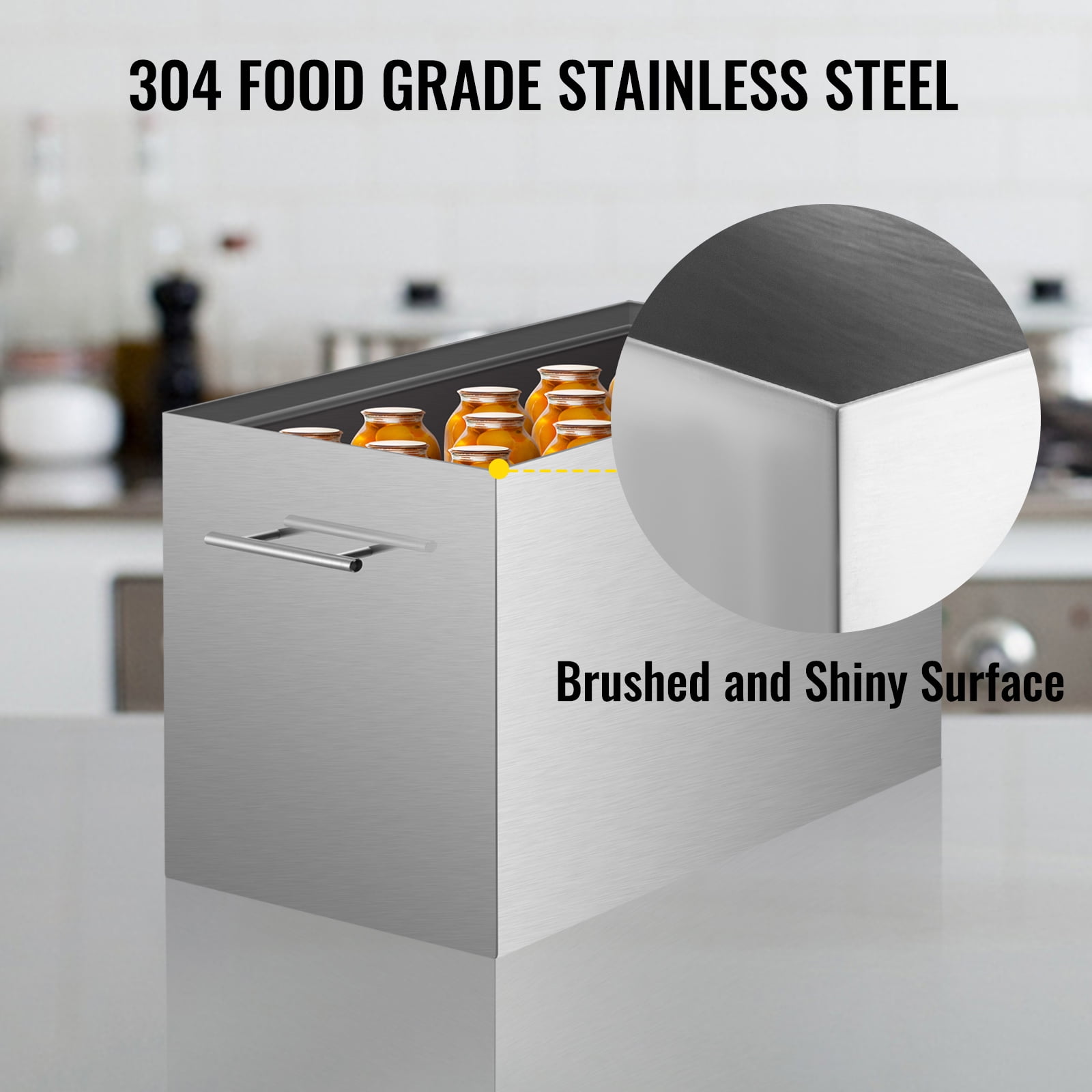 Brand Introduction KFFKFF is a leading brand that specializes in equipment and tools. Along with thousands of motivated employees,KFFKFF is dedicated to providing our customers with tough equipment & tools at incredibly low prices. Today, KFFKFF has occupied markets of more than 200 countries with 10 million plus global members. Why Choose KFFKFF? 1.Tough Quality Assurance 2.Incredibly Low Prices 3.Fast & Secure Delivery 4.30-Day Free Returns 5.24/7 Professional Customer Service Product Description Water Bath Canner The stovetop water bath canner allows the home canning of large batches of food, like jams, jellies, pickles, fruits and more. It can hold up to 15 quarts jars at a time (1 quart x 15 jars), and with the second rack, you can put two layers of jars in it. If you are a home canning lover, this is exactly what you are looking for. Two Canning Racks We provide two canning racks. You can put one on the bottom of the canner to keep the jars away from the direct heat, and put the other on the first layer of jars to have one more layer of jars. Holding 15 Quart Jars Holds up to 15 quart jars at a time (1 quart x 15 jars). It is perfect for experienced canners to produce a big batch of preserves at once. Also, it is suitable for those big families. Brushed and Shiny Surface The thick steel plates are brushed and have no scratches on the surface. Rust proof steel plate owns a strong structure and durable quality, which ensures an extended service life. Well-Designed Handles & Lid The detachable stainless steel handles provide a confident grasp when handling the canner. The lid fits the base perfectly, makes the canner well-sealed and heats up quickly. Suitable for Various Stovetops This KFFKFF stovetop canner can be used on various stovetops, like gas and wood stovetops. Its flat bottom provides a stable position on the stovetops and ensures even thermal transmission. Wide Application Recommending to all home canning lovers and commercial users. This canner can be used to can tomatoes, pickles, berries, fruits, sauerkraut, and other high acid food. Specifications Capacity of Jars: 15 Qt (1 Qt x 15) / 14.19 L (0.946 L x 15) Capacity of Canner: 13 Gallons / 49.21 L Thickness of Steel Plate: 0.06″ / 1.5 mm Material: 304 Stainless Steel Item Dimensions: 20.5″ x 11.5″ x 13″ / 520.7 x 292.1 x 330.2 mm Weight: 24 lbs / 10.89 kg PackageContent 1 x Water Bath Canner 2 x Canning Rack