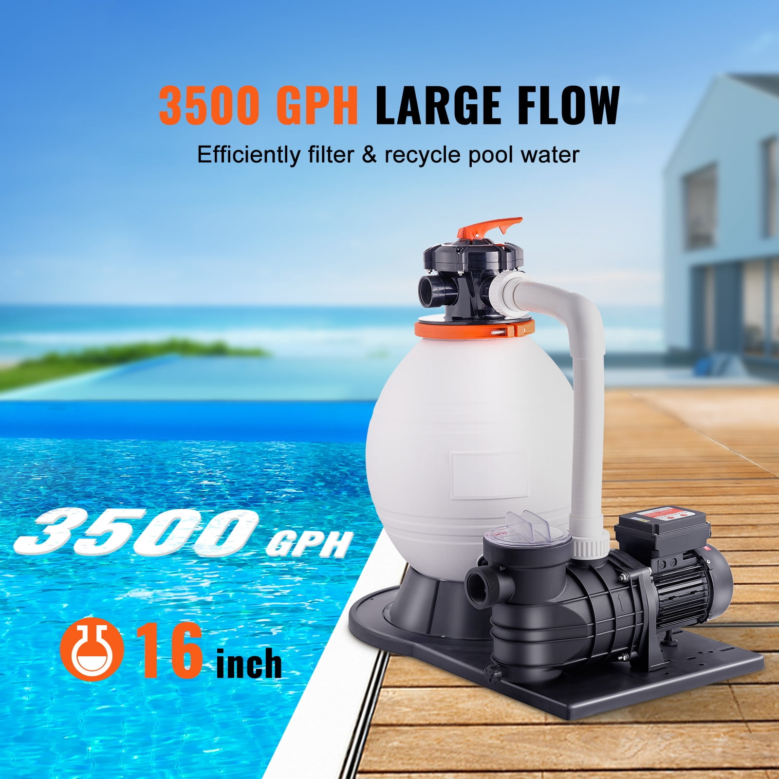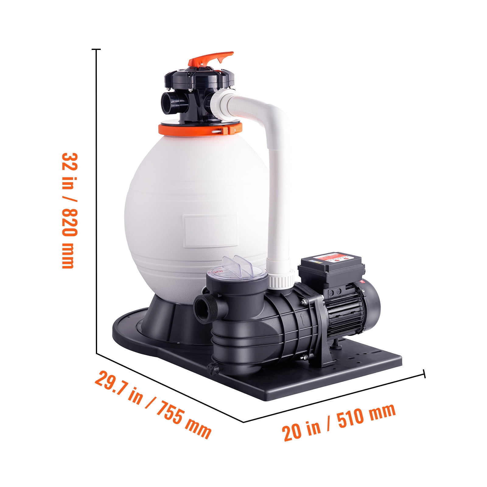 Product Description The Ultimate Pool Cleaning Solution: 16 in Sand Filter Pump Introducing our specially designed sand filter pump for medium to small above-ground pools. With a remarkable 3500 GPH flow rate, a 16 in thermoplastic sand tank, and a reliable copper motor equipped with overload and overheat protection, this pump is the perfect choice for keeping your pool sparkling clean and well-maintained. Its 6-way multi-port valve ensures efficient performance and easy operation. Trust in our pump to meet all your pool needs and enjoy a hassle-free pool maintenance experience. The Perfect Pool Cleaning Companion Introducing our KFFKFF sand filter pump, your ultimate solution for maintaining a pristine pool. With a capacity of up to 3,500 GPH, this powerful pump enhances water circulation and filtration, resulting in crystal-clear water and unparalleled pool clarity. Experience a hassle-free pool like never before with its easy setup and user-friendly operation. Effortless Pool Water Management Say goodbye to manual tasks and welcome automatic pool water management with our KFFKFF sand filter pump. Featuring a built-in timer, this pump streamlines the process, boosting convenience and efficiency. Enjoy more time relaxing by the pool and less time worrying about maintenance. Unmatched Performance Equipped with a high-quality copper-wound motor running at an impressive 3,450 RPM, our KFFKFF sand filter pump delivers exceptional performance. Its TYPE 3 waterproof rating and CLASS F insulation ensure durability and security, while dual overload and overheat protection guarantee reliable, long-lasting operation. Versatility at its Finest Our KFFKFF sand filter pump goes beyond basic filtration. It offers backwash, rinse, and waste modes for thorough cleaning and extended filter life. Additionally, its winter mode provides extra protection in colder conditions, ensuring your pool stays in top shape all year round. Effortless Installation Designed with simplicity in mind, our KFFKFF sand filter pump features a straightforward setup process. Even if you’re a first-time user, you can easily install it without any complex steps or specialized tools. Simply plug and play, and you’re ready to enjoy a sparkling clean pool. Built to Last Crafted from high-performance materials, the sand tank of our KFFKFF sand filter pump is made from reinforced thermoplastic. This not only makes it lightweight and portable but also corrosion-resistant, ensuring its longevity and reliability. Specifications Package Content